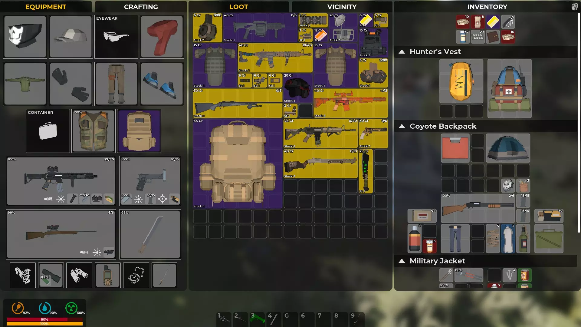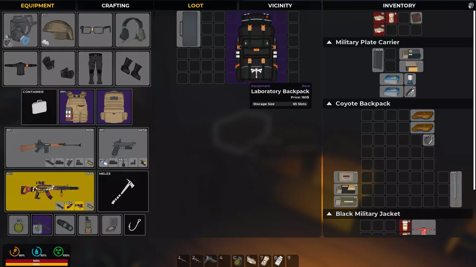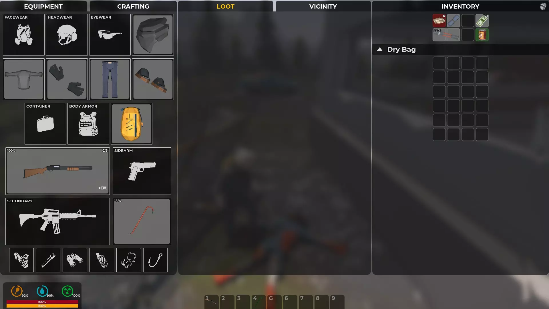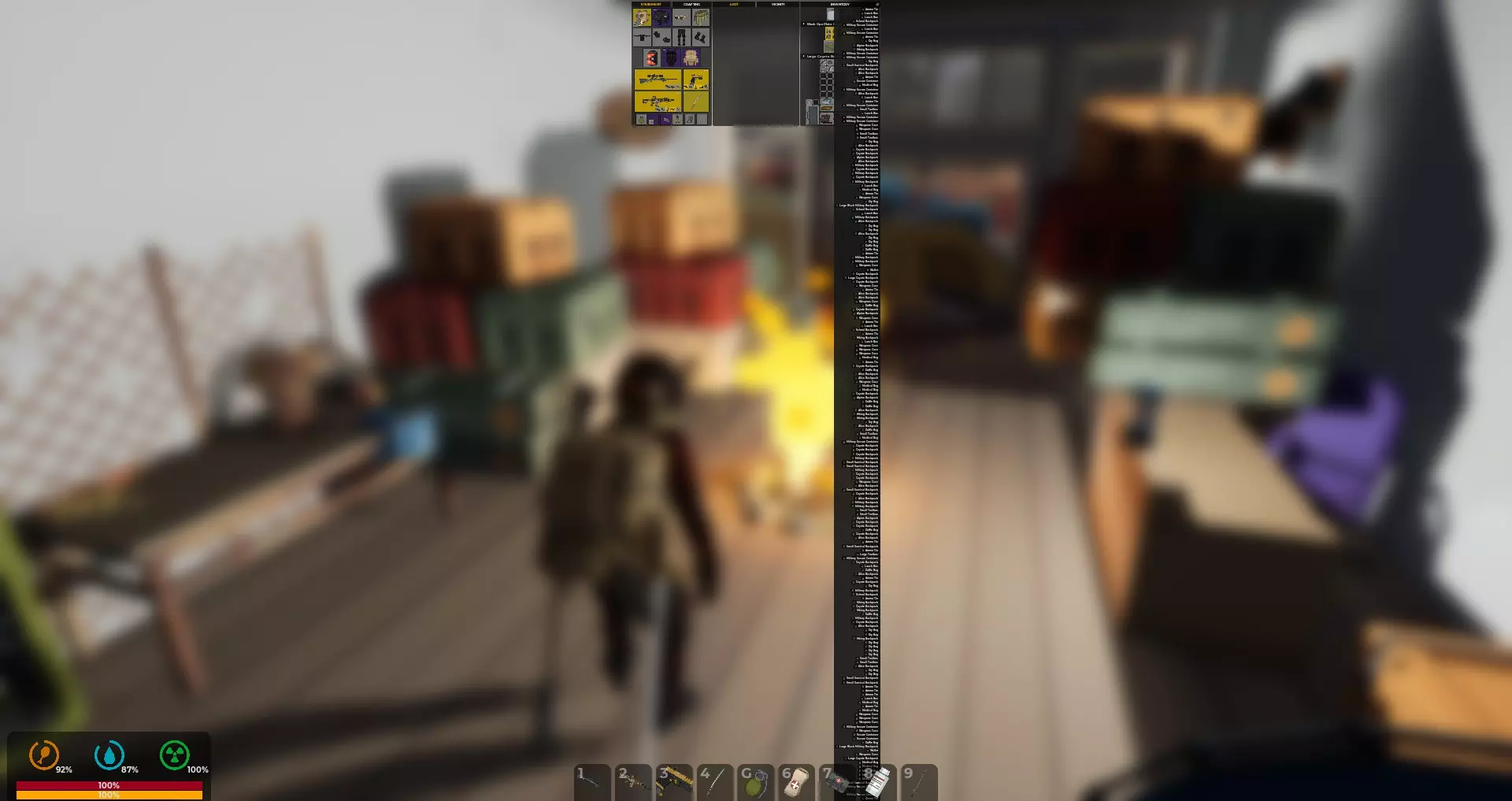 装备等于防护,武器等于生存机会。你的生存机会将取决于你找到的资源。你能携带的东西越多,制作保命物品的机会就越好。有枪却没有子弹是没用的。有枪却没有消音器只会暴露你的位置,引来一大群敌人。近战武器则更安静。