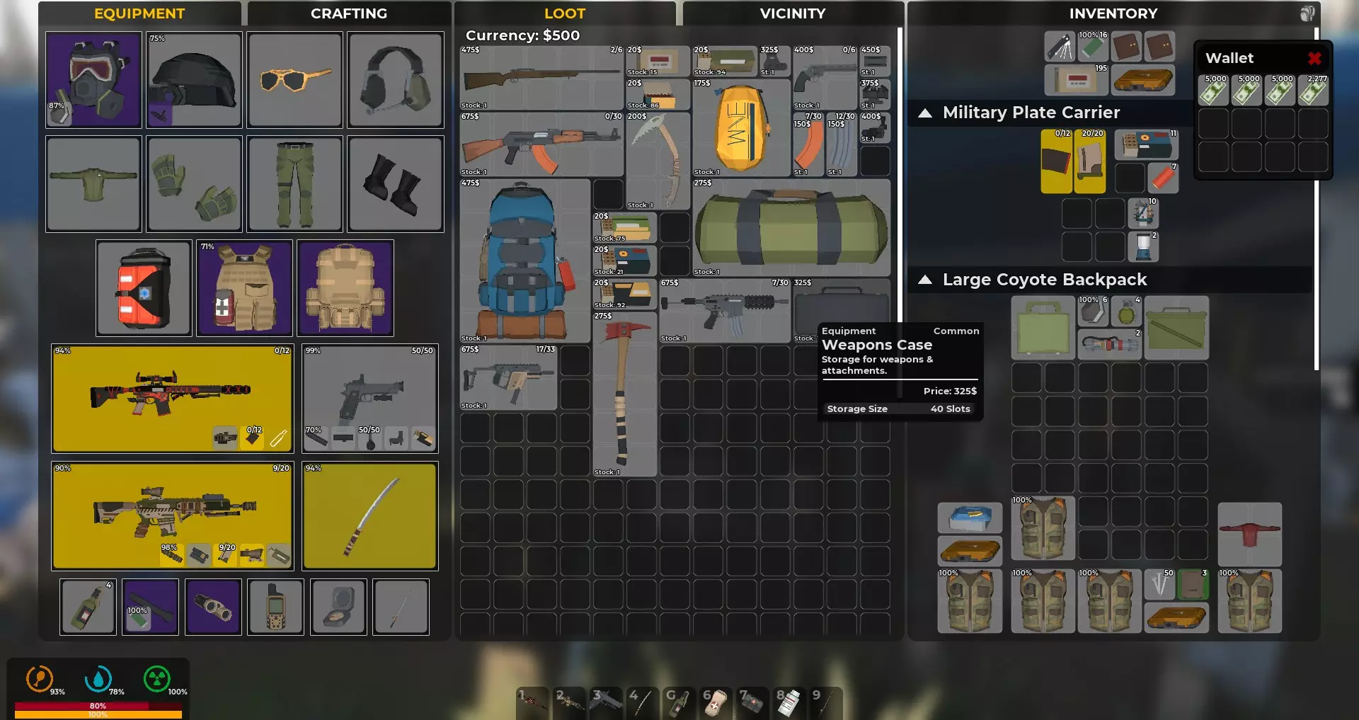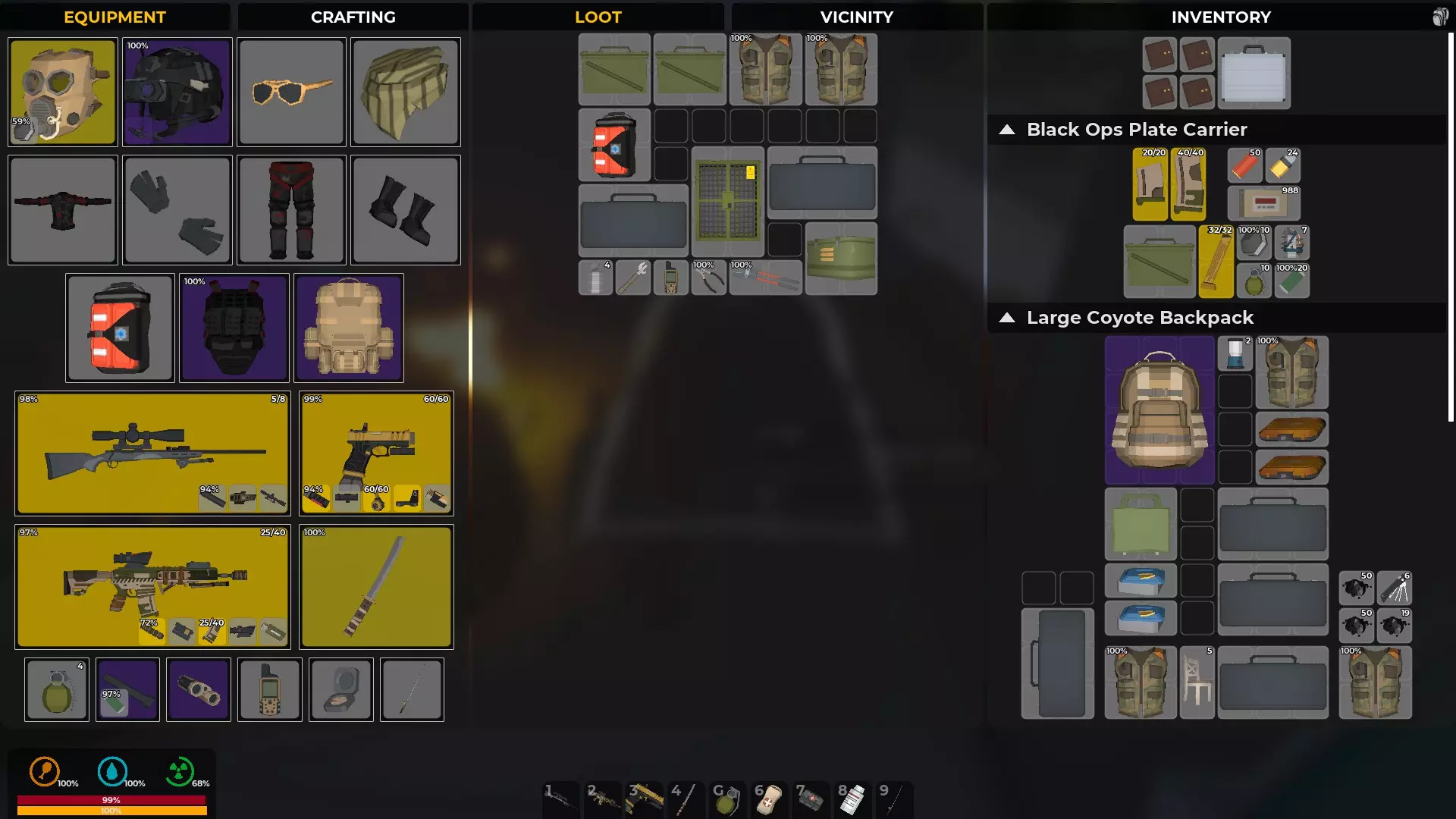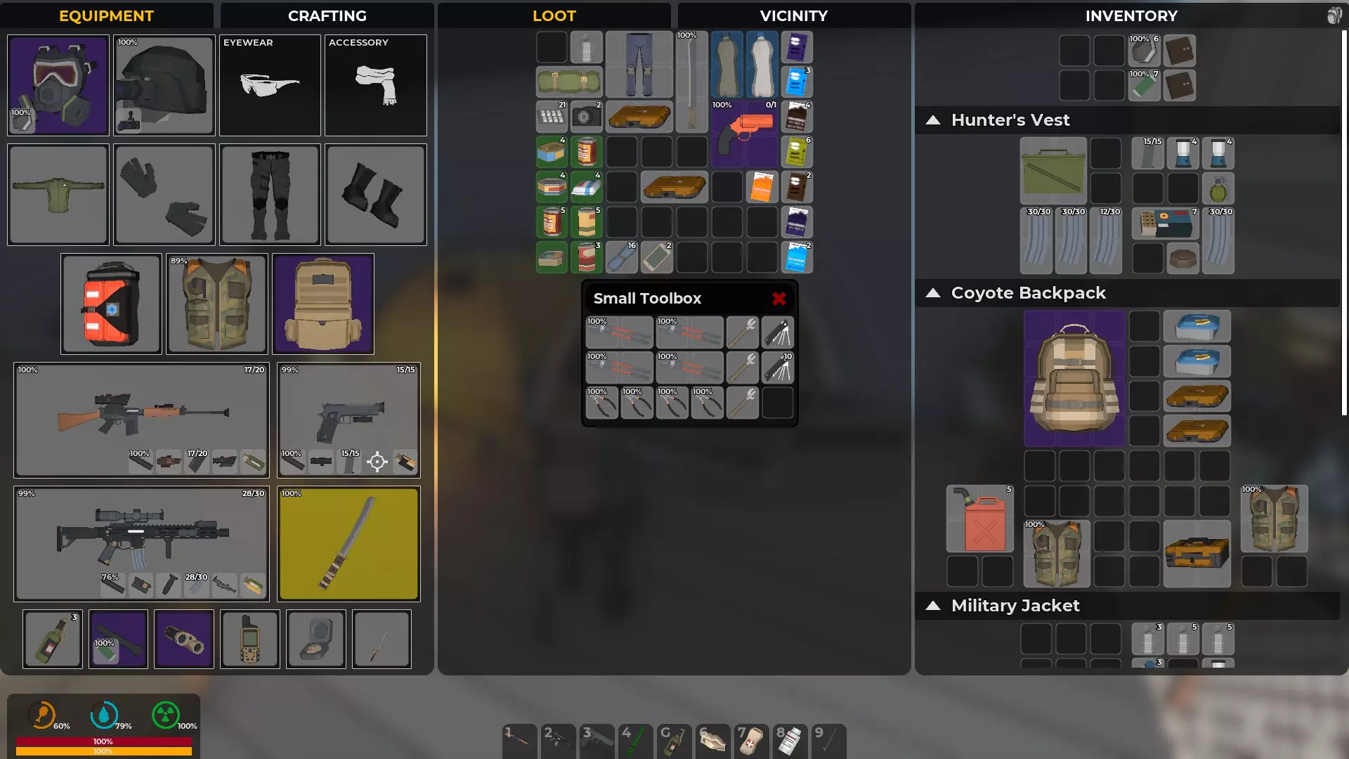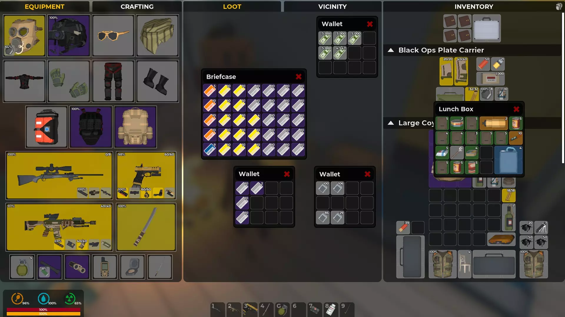 装备等于防护,武器等于生存机会。你的生存机会将取决于你找到的资源。你能携带的东西越多,制作保命物品的机会就越好。有枪却没有子弹是没用的。有枪却没有消音器只会暴露你的位置,引来一大群敌人。近战武器则更安静。