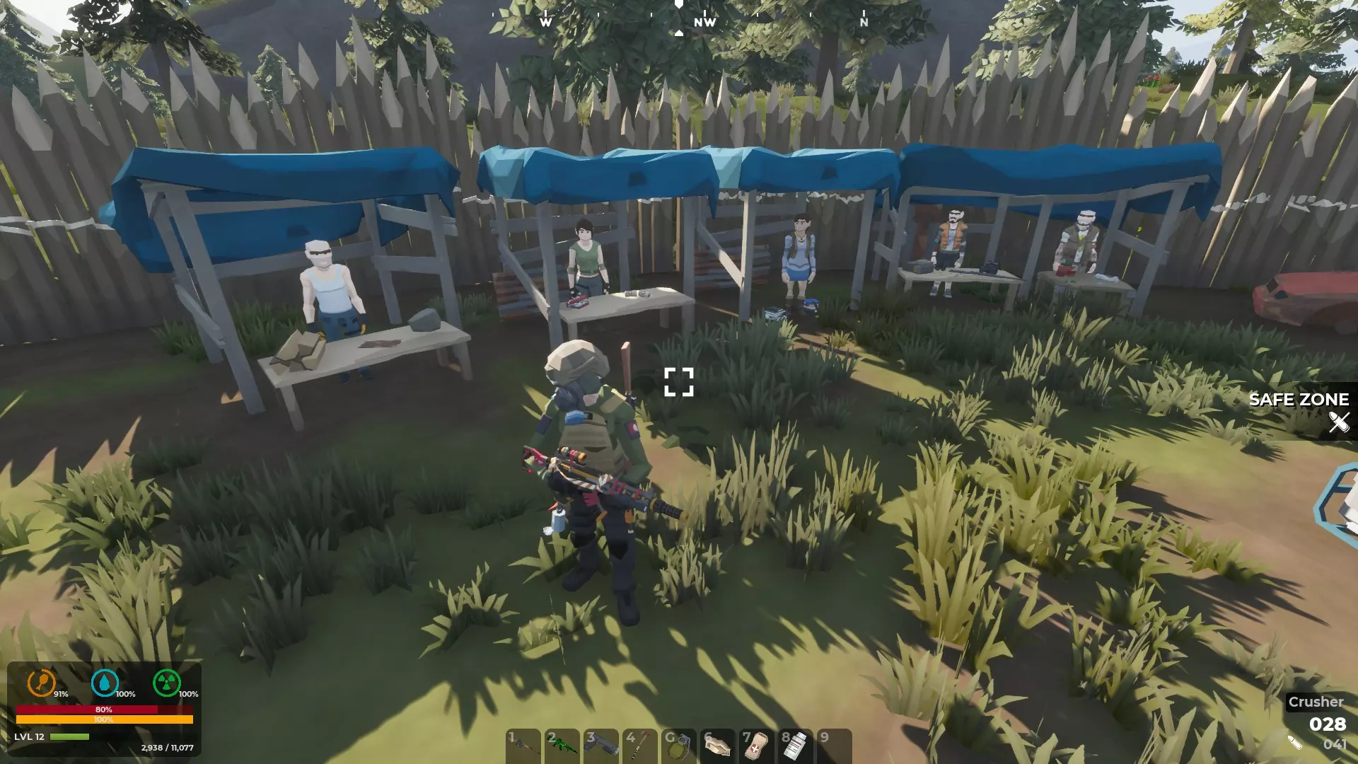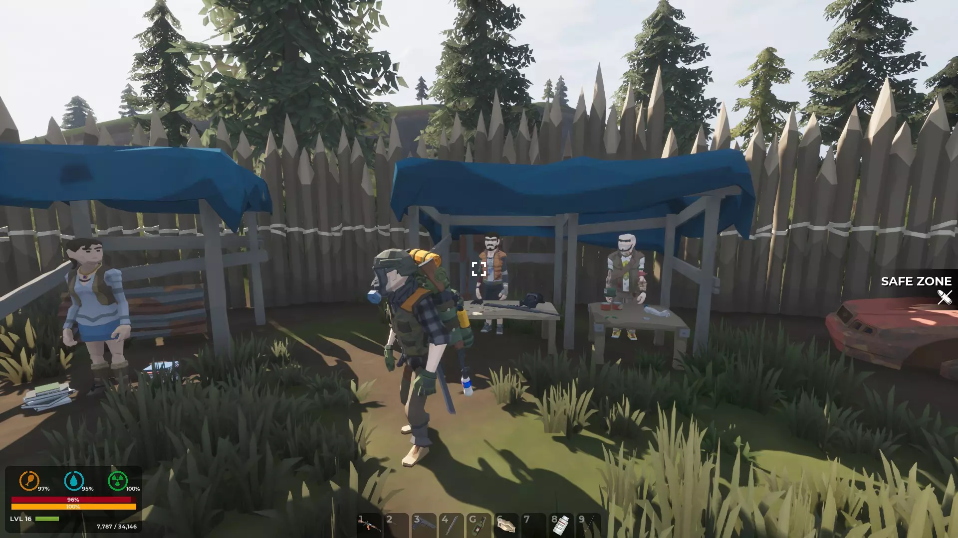 单个商人在拖车中售卖商品。每个这类独立安全区商人区域还提供一个制作台和一口水井。