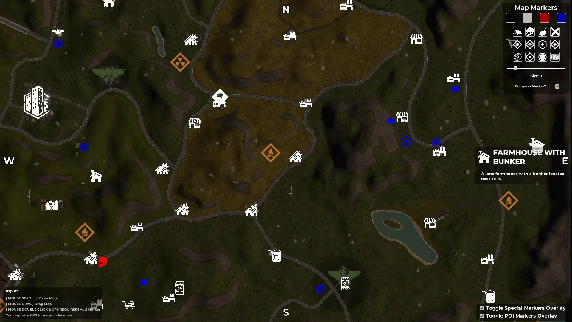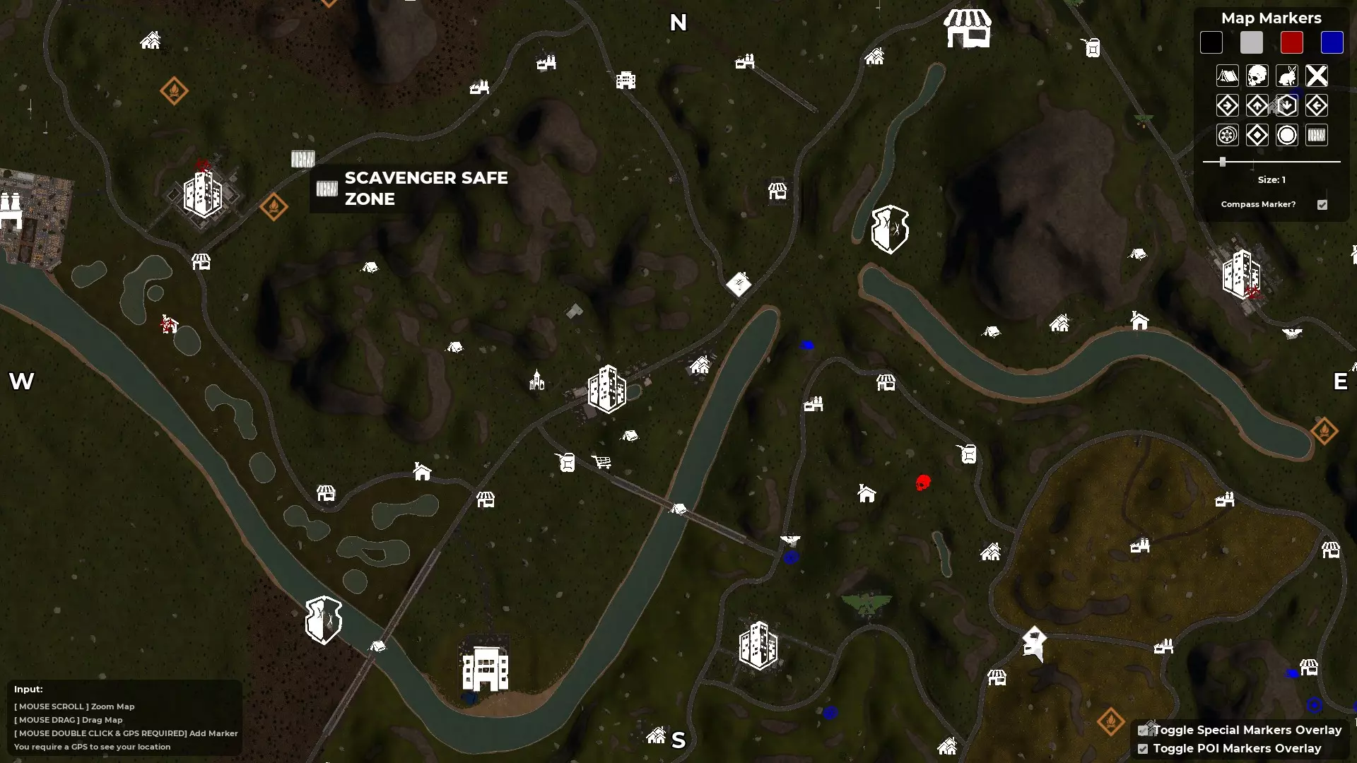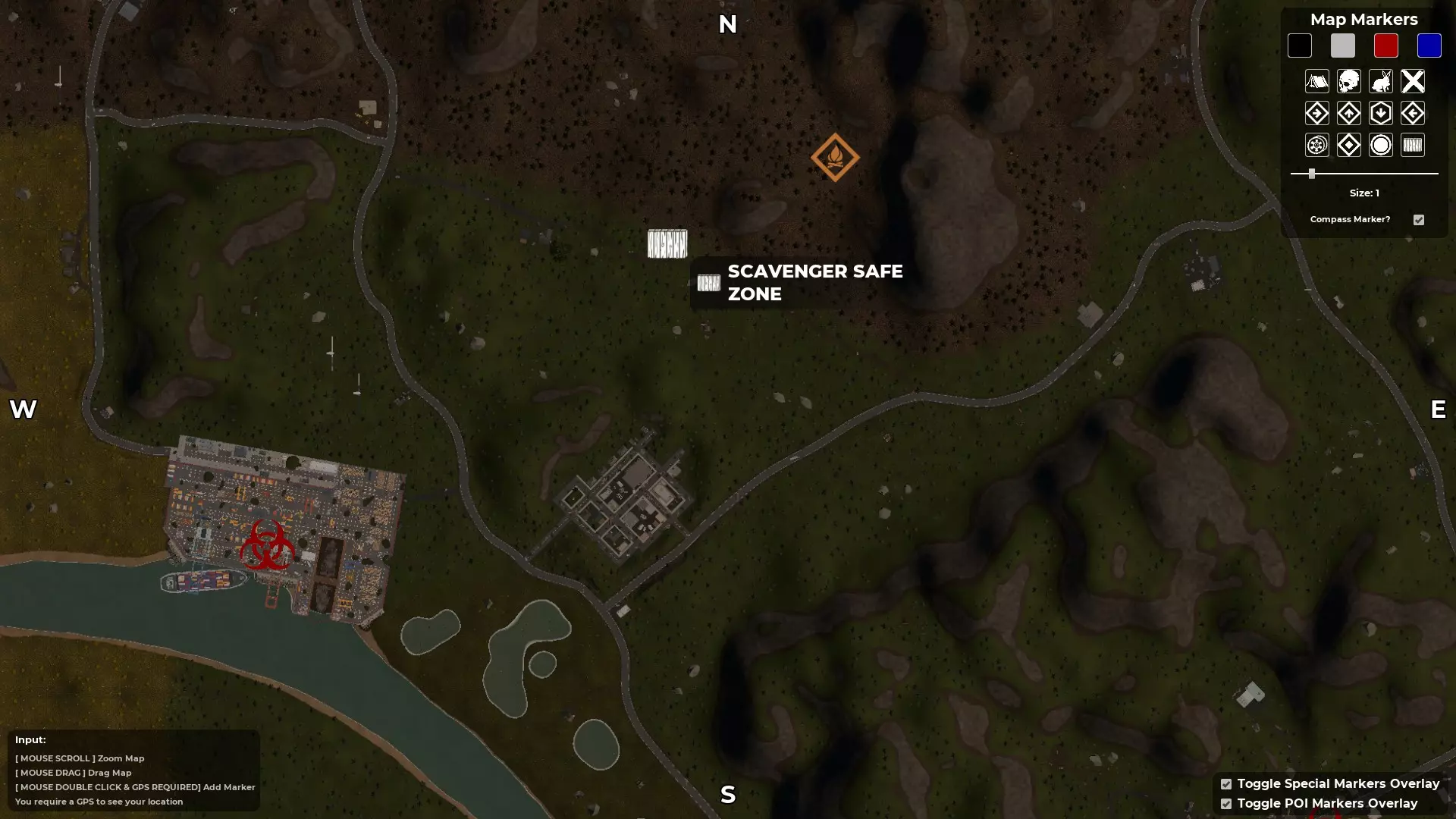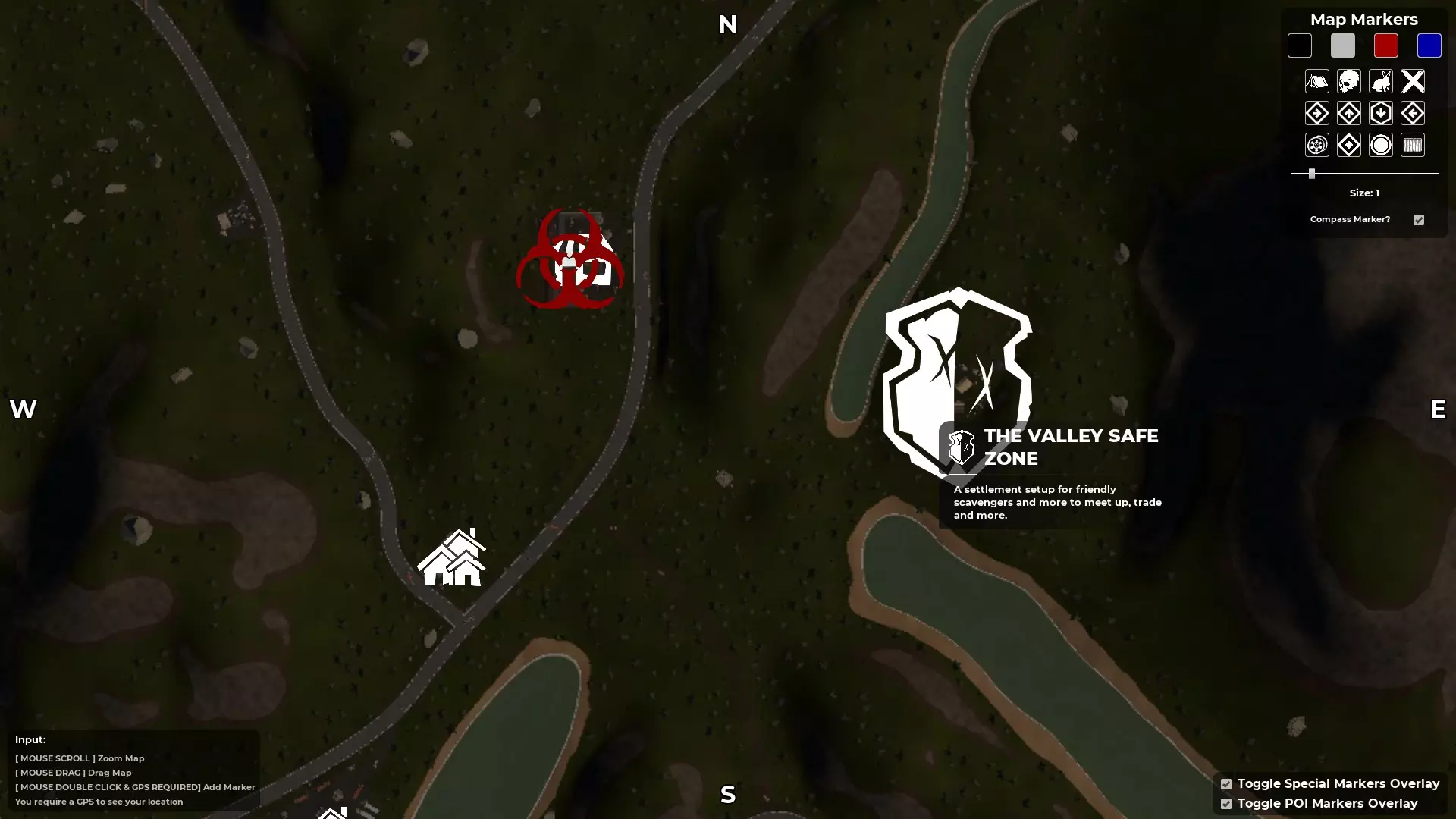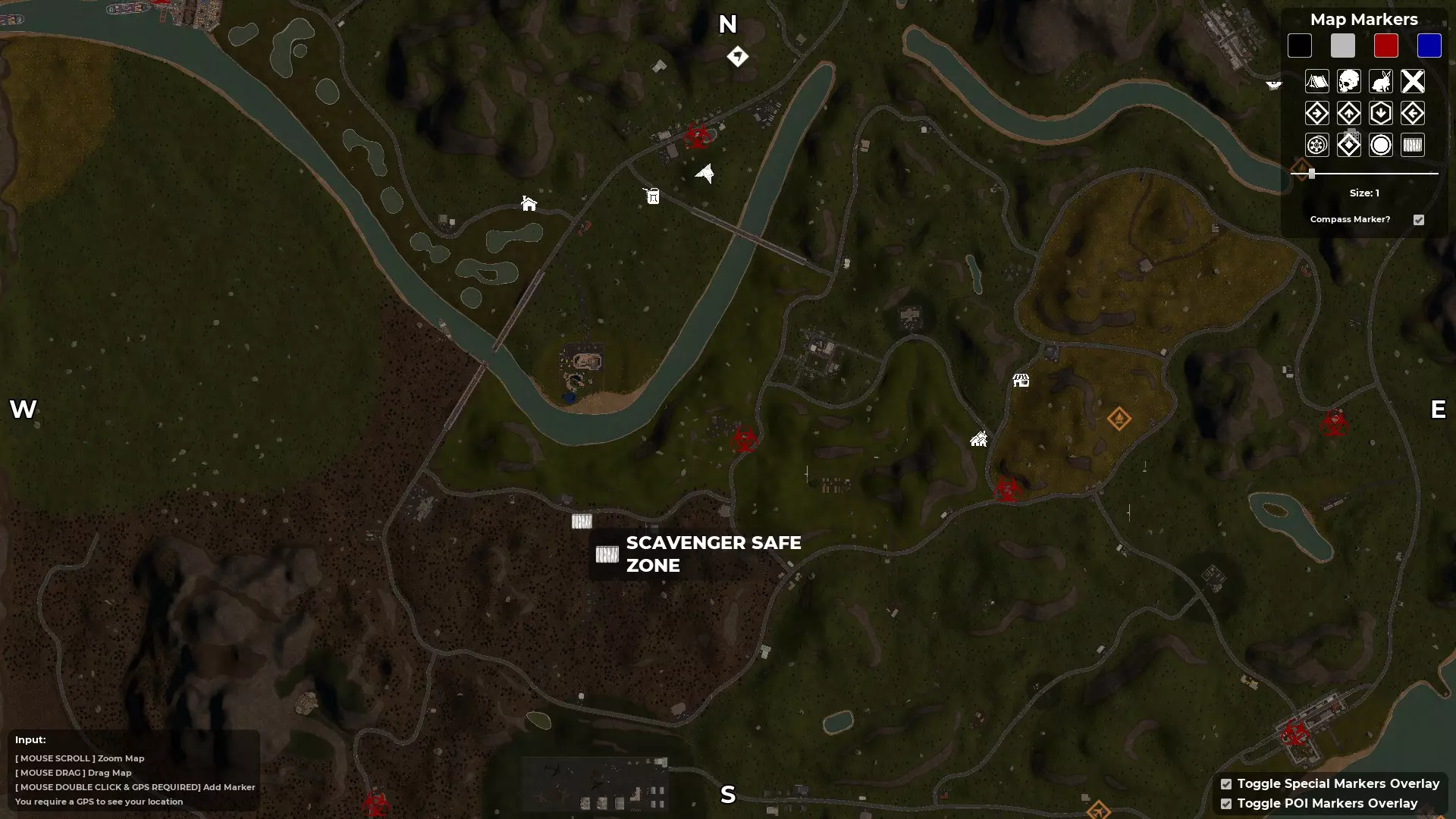 按M键打开地图 - 寻找指南针和GPS 创建自定义角色后,你会被投放到地图中,但你并不知道自己在地图的具体位置。大多数出生点位于地图的右上角区域,也就是东北部。使用地图的一个好处是,已发现的地点会在地图上高亮显示。例如,如果你在游戏中出生后看到一座废弃房屋并跑过去,该地点就会被游戏记录为已发现,其位置会在地图上高亮显示(按M键打开地图)。 发现第二个地点后,你就能知道自己在地图上的位置和大致方向。 游戏世界中有一个道具可以帮助你确定确切位置,那就是GPS。一旦你找到其中一个并将其添加到工具栏,你的位置将由一个向前的白色箭头指示。 第二个道具是指南针,它会显示北、南、东、西的方向。由于这些道具是随机生成的,你找到并利用它们的速度会有所不同。 当你同时拥有这两个道具后,你就会知道自己的位置,进而确定想要前往的方向。至少在获得一些身体防护和能快速杀死 undead 的武器之前,尽量避开它们。 地图中央三条河流交汇处有一个山谷安全区。
