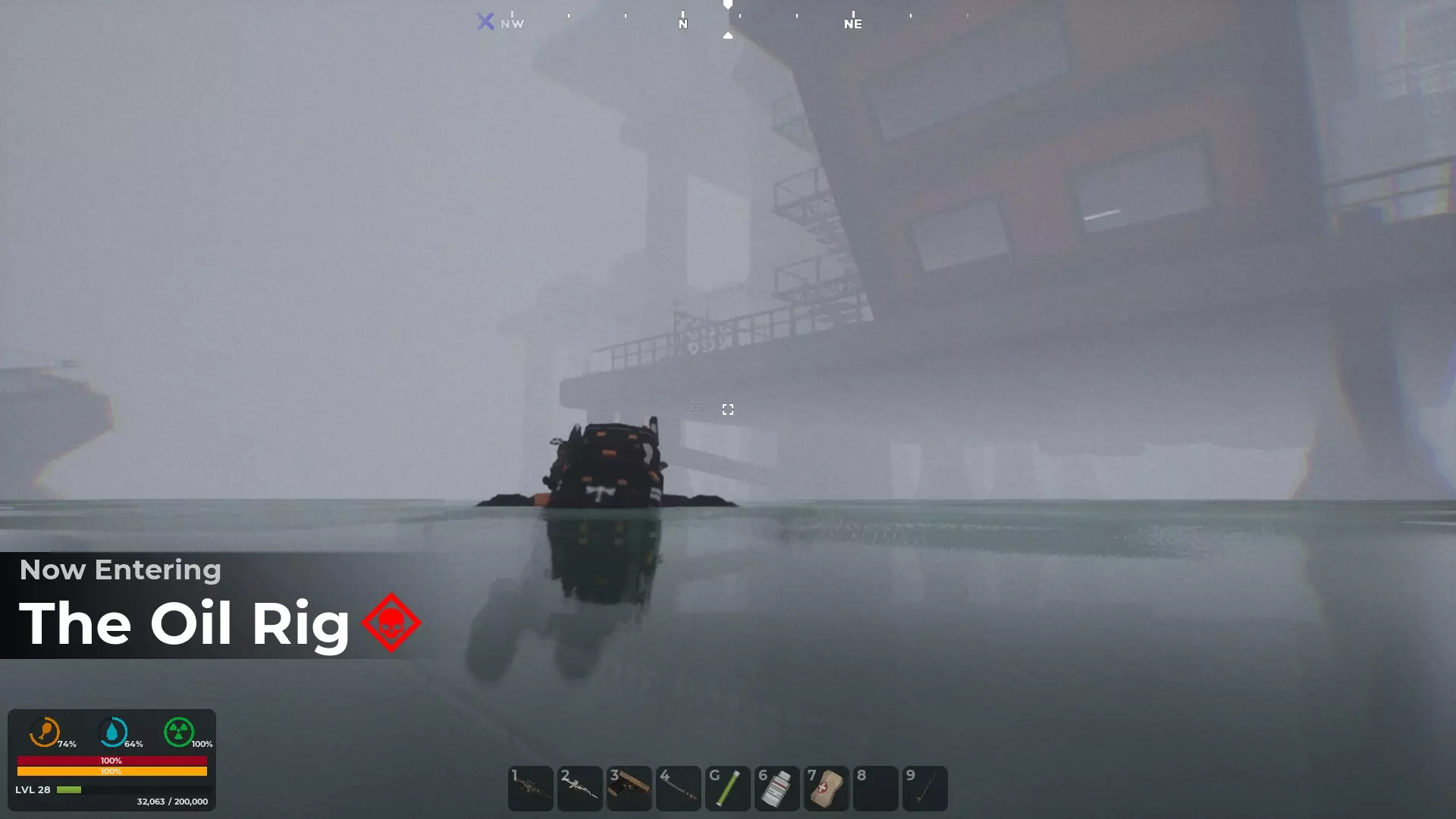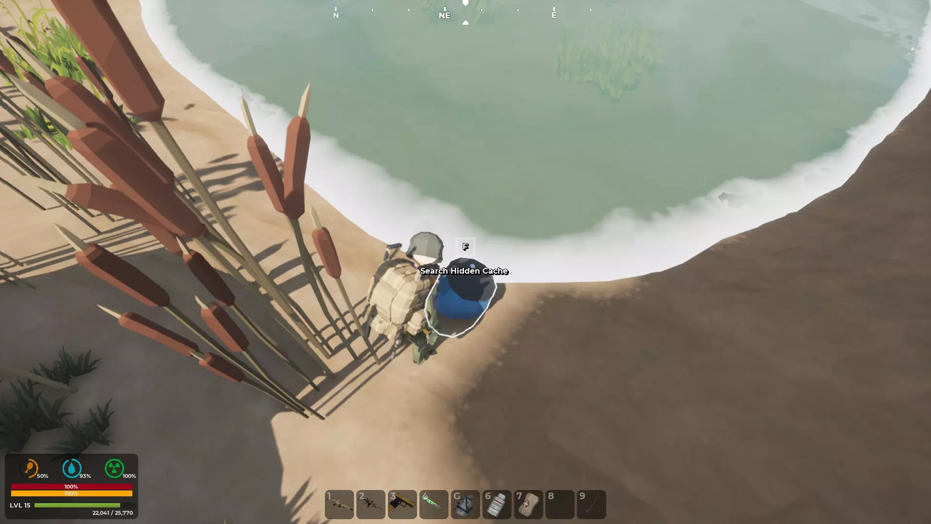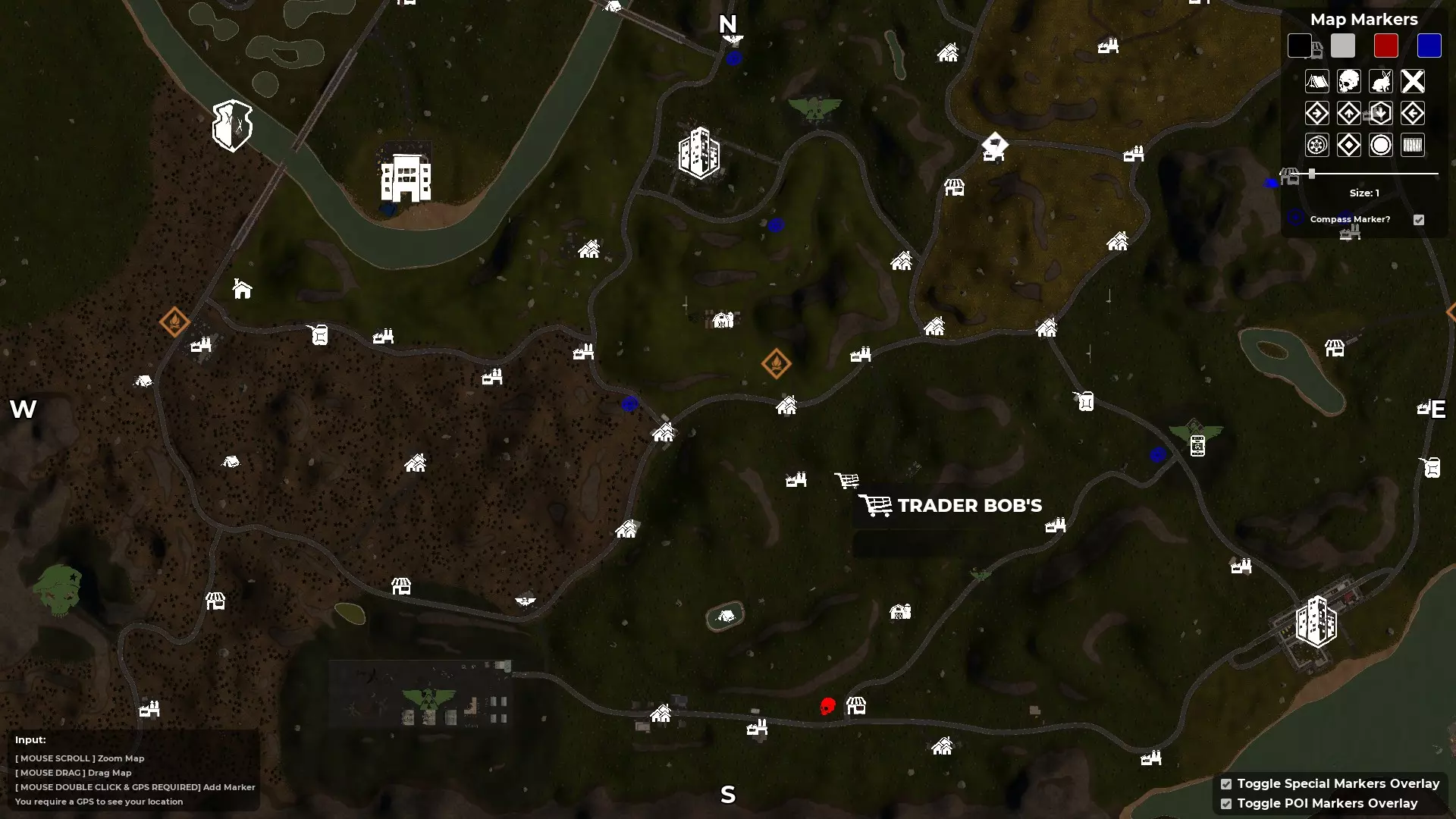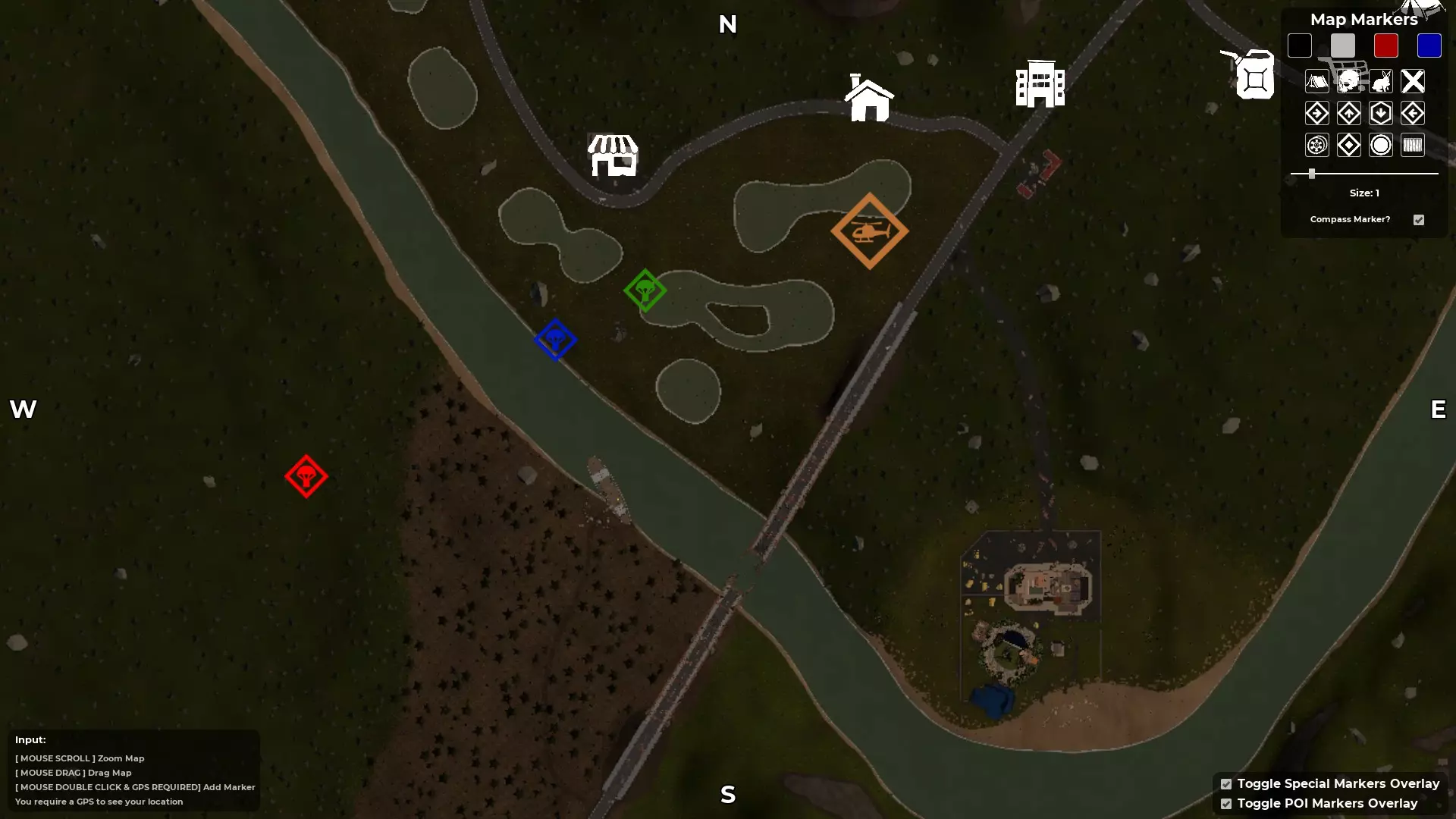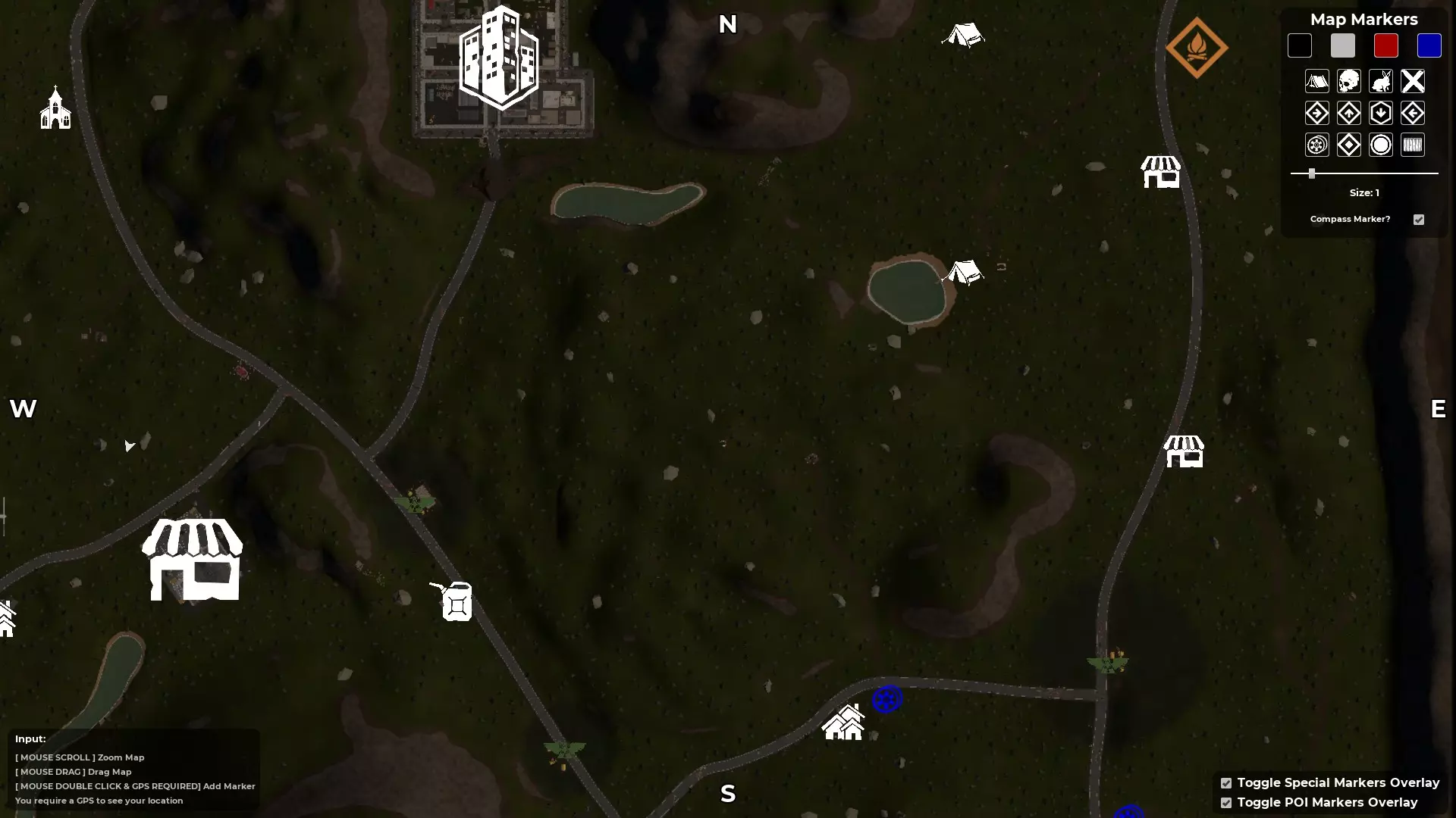 按M键打开地图 - 寻找指南针和GPS 创建自定义角色后,你会被投放到地图中,但你并不知道自己在地图的具体位置。大多数出生点位于地图的右上角区域,也就是东北部。使用地图的一个好处是,已发现的地点会在地图上高亮显示。例如,如果你在游戏中出生后看到一座废弃房屋并跑过去,该地点就会被游戏记录为已发现,其位置会在地图上高亮显示(按M键打开地图)。 发现第二个地点后,你就能知道自己在地图上的位置和大致方向。 游戏世界中有一个道具可以帮助你确定确切位置,那就是GPS。一旦你找到其中一个并将其添加到工具栏,你的位置将由一个向前的白色箭头指示。 第二个道具是指南针,它会显示北、南、东、西的方向。由于这些道具是随机生成的,你找到并利用它们的速度会有所不同。 当你同时拥有这两个道具后,你就会知道自己的位置,进而确定想要前往的方向。至少在获得一些身体防护和能快速杀死 undead 的武器之前,尽量避开它们。 地图中央三条河流交汇处有一个山谷安全区。