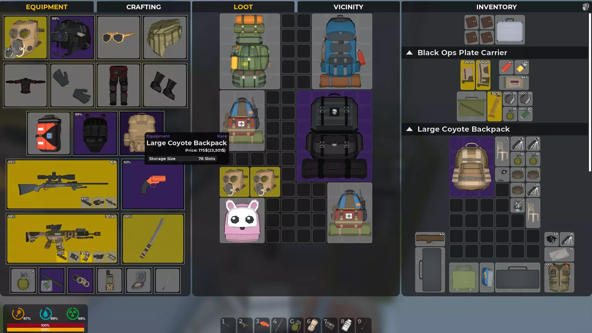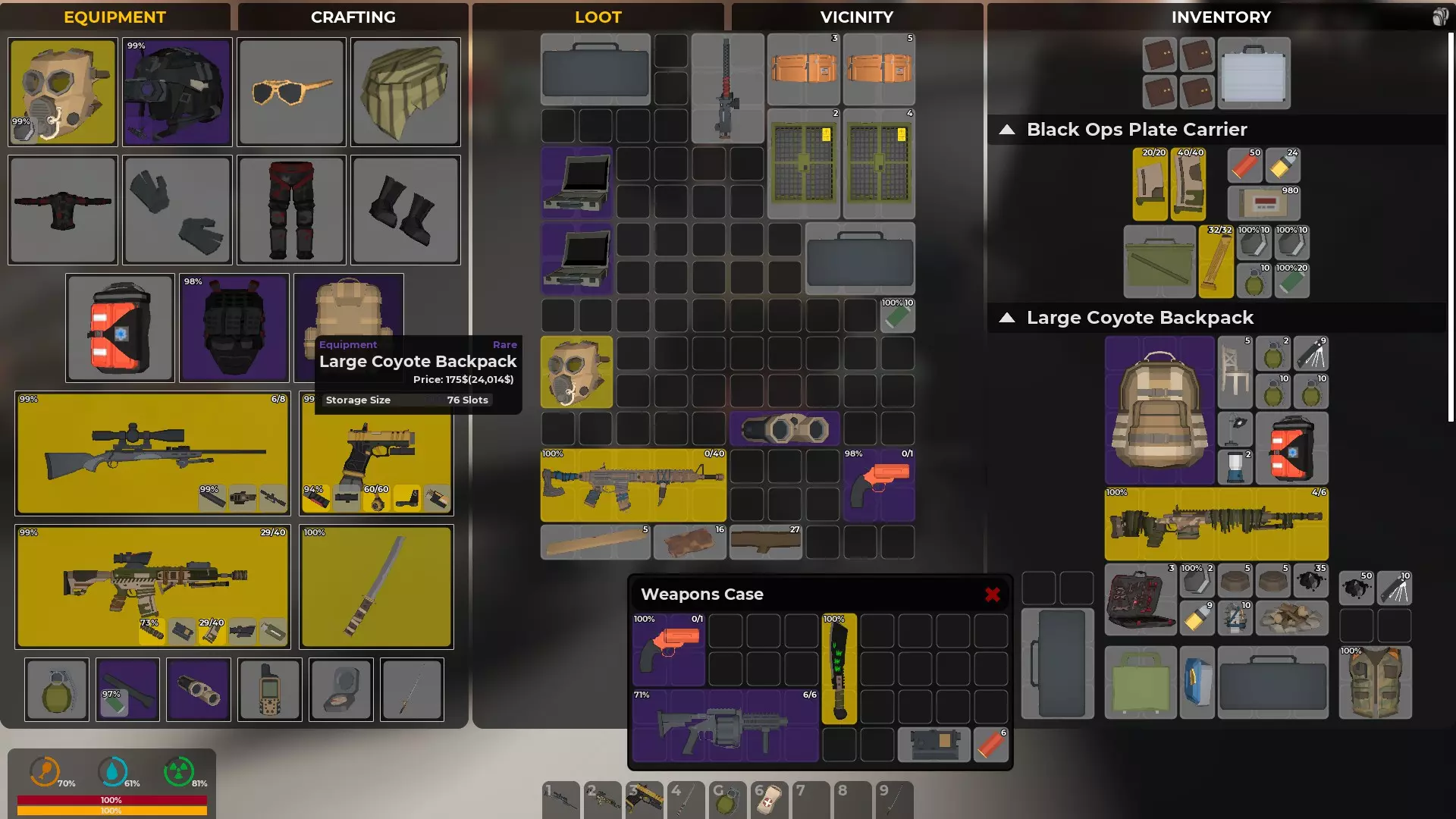 在游戏玩法方面,如果有资源排序选项,可以使用该功能。游戏中有专门的容器用于存放弹药和武器配件、医疗用品、食物、工具和修理包以及制作资源。 郊狼大型背包有76个槽位。