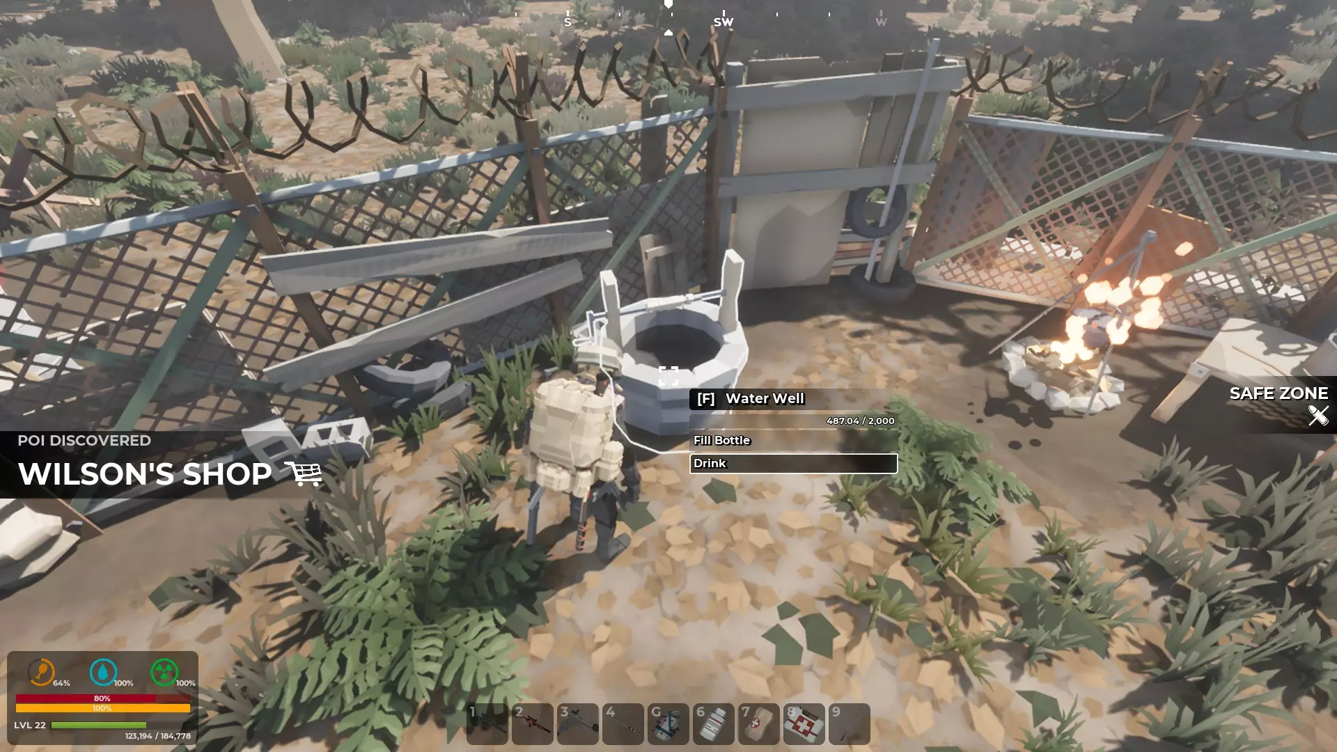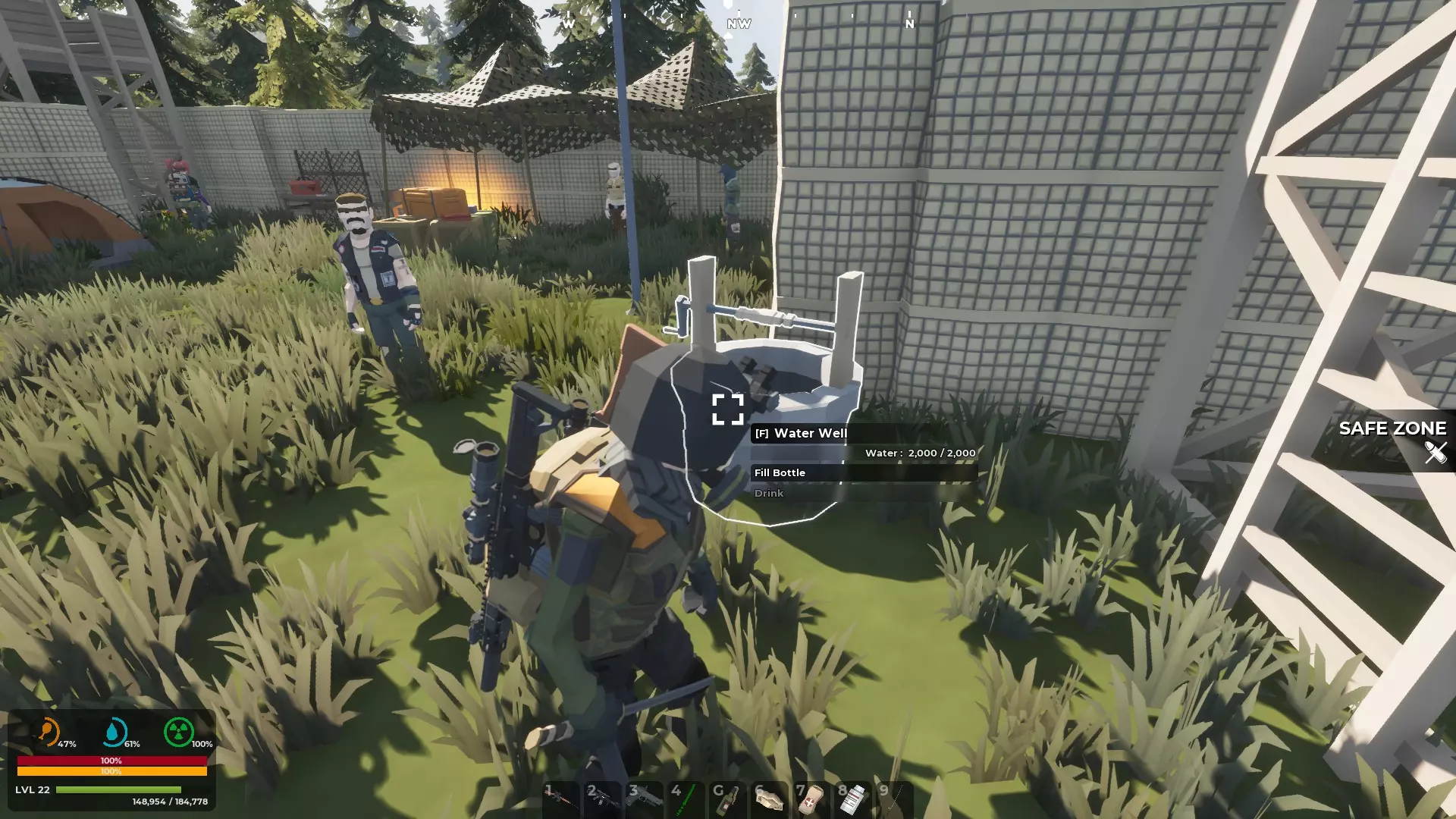 每个安全区和独行商人营地都有一口水井为你供水。如果你背包里有空瓶子,可以装水,也可以直接喝个够。记住,装瓶的水需要净化。