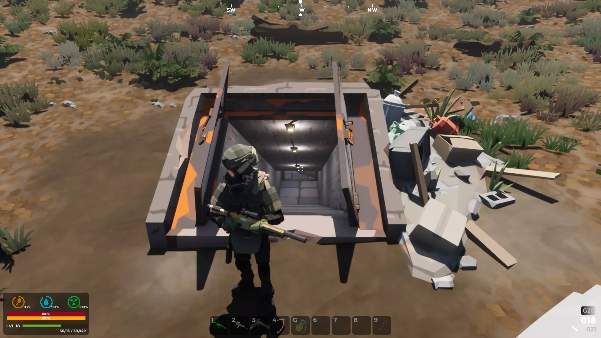 有些人喜欢将地下掩体作为基地,地图的不同区域都有空掩体。这个特定的掩体位于东侧。每个空掩体都缺少前门,你可以用建造工作台制作前门。记得也要放置营火,确保该区域不会生成僵尸。添加发电机可为照明提供电力。