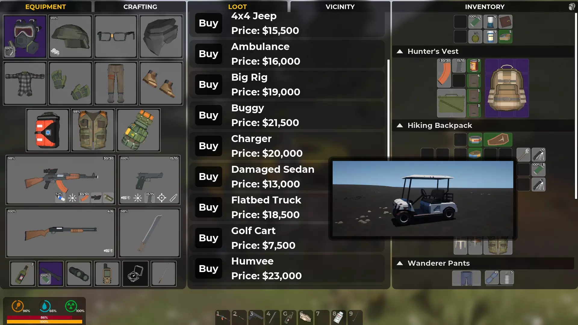 车辆商人以固定价格出售游戏中几乎所有可用车辆。你还需要一个车辆修理包和一罐汽油才能让汽车持续行驶。现在,高尔夫球车是价格最低的,而且速度快得离谱,可以帮助你换乘更好的车。缺点是,这种车的生命值非常低,而且几乎没有强度,要避免碰撞,否则它撑不了多久。