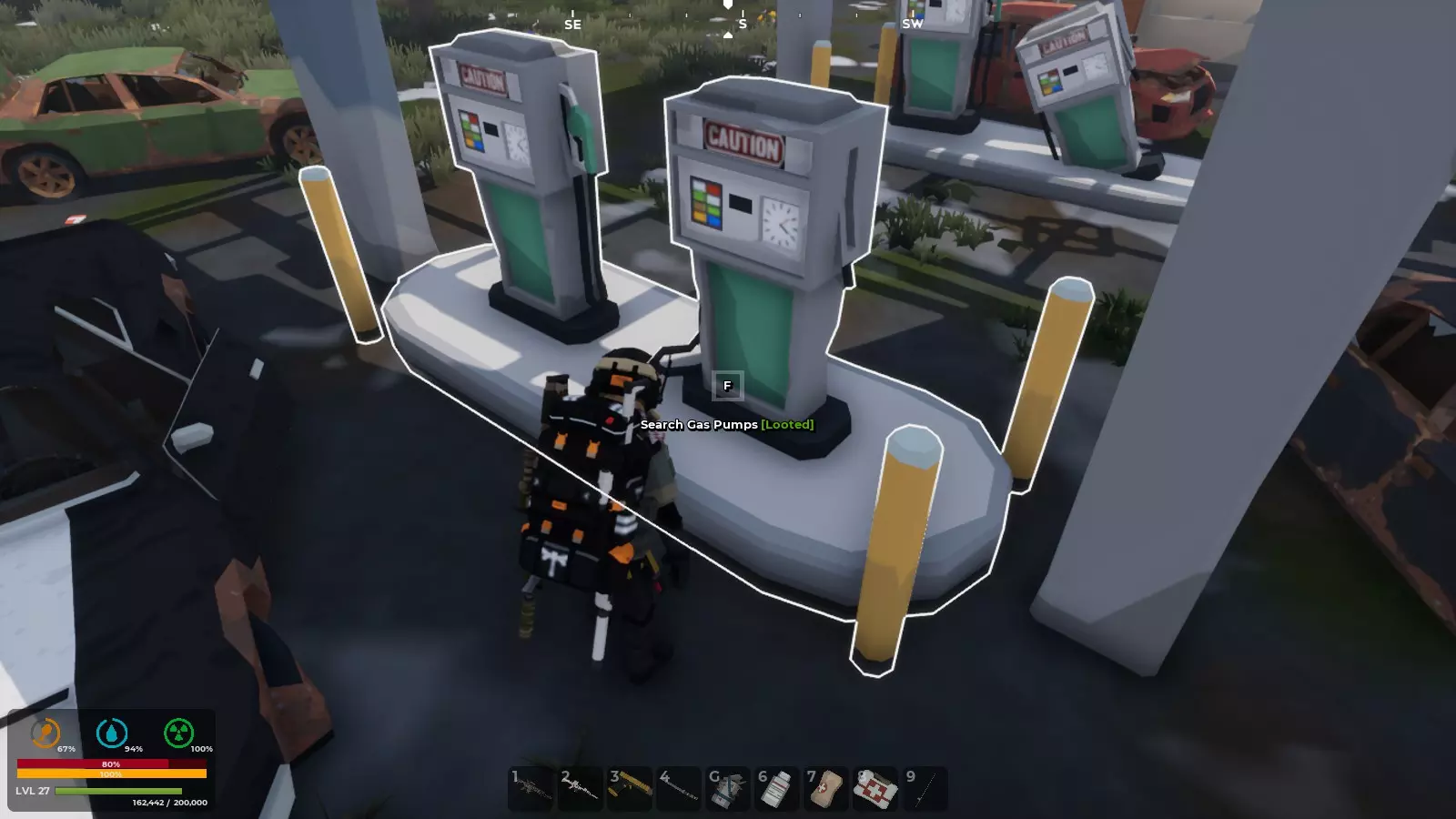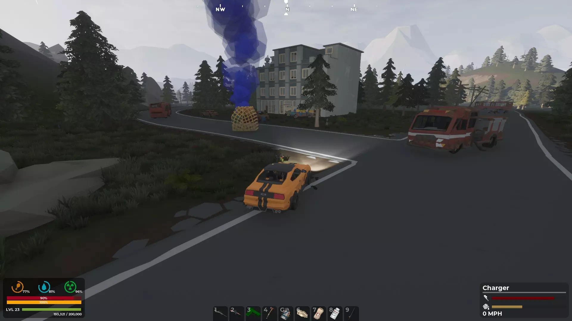 有时在汽车碰撞或车辆残骸附近会有一堆堆板条箱。记得到处检查。 加油站有汽油罐和车辆修理工具包。如果你看到一辆汽车的发动机舱冒出浓密的黑烟,那辆车是可以驾驶的。你需要添加汽油并修理发动机。能否找到汽车取决于你的随机出生点、你决定行走的随机方向,以及每次开始游戏时车辆位置的变化。随机性很强。加油站还有食物和含有资源的一堆堆垃圾。