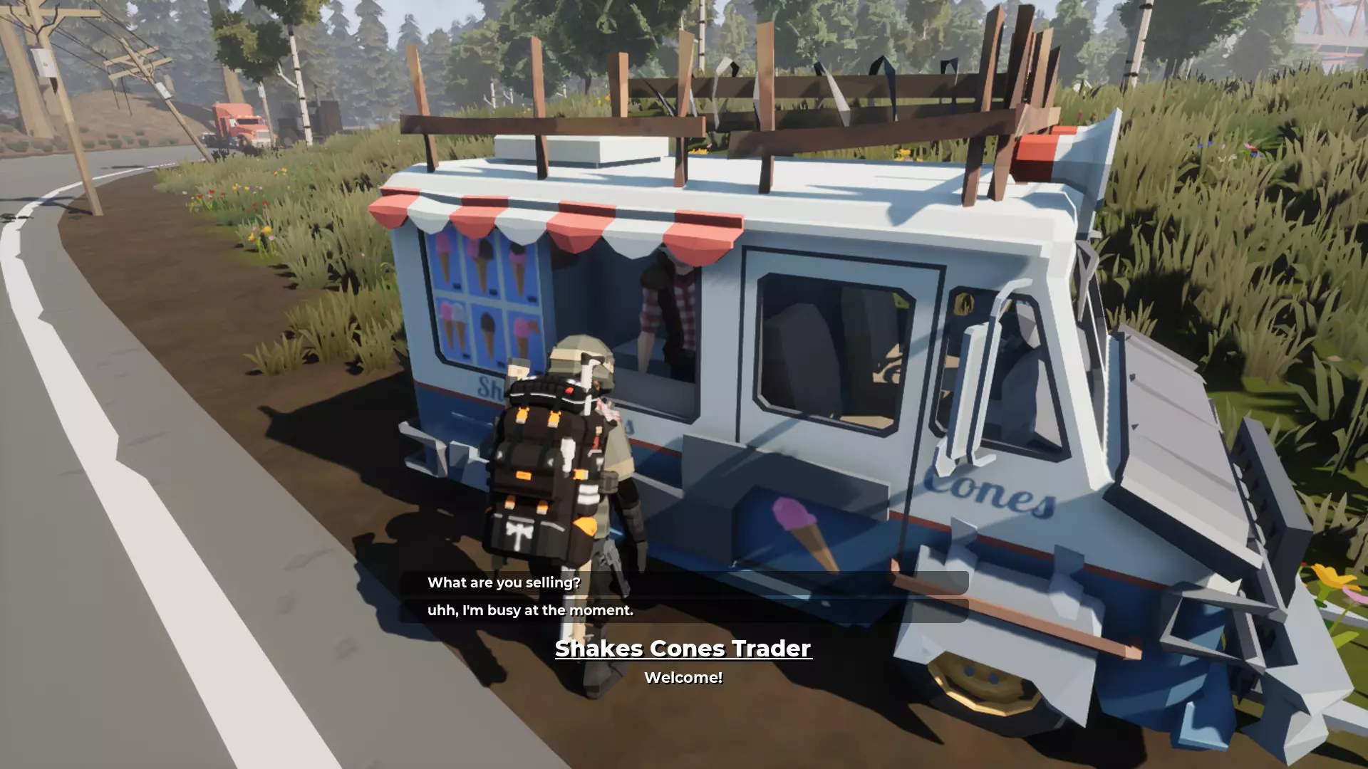 特殊商人 - 冰淇淋车、军用卡车和流浪商人 这两个商人会随机出现在地图上的多个可能位置,通常在路边,很难找到。 但他们出售传说级别的装备和武器,并且通常收取黑市商人的兑换信用点。1000美元=1信用点 冰淇淋商人 小丑面具