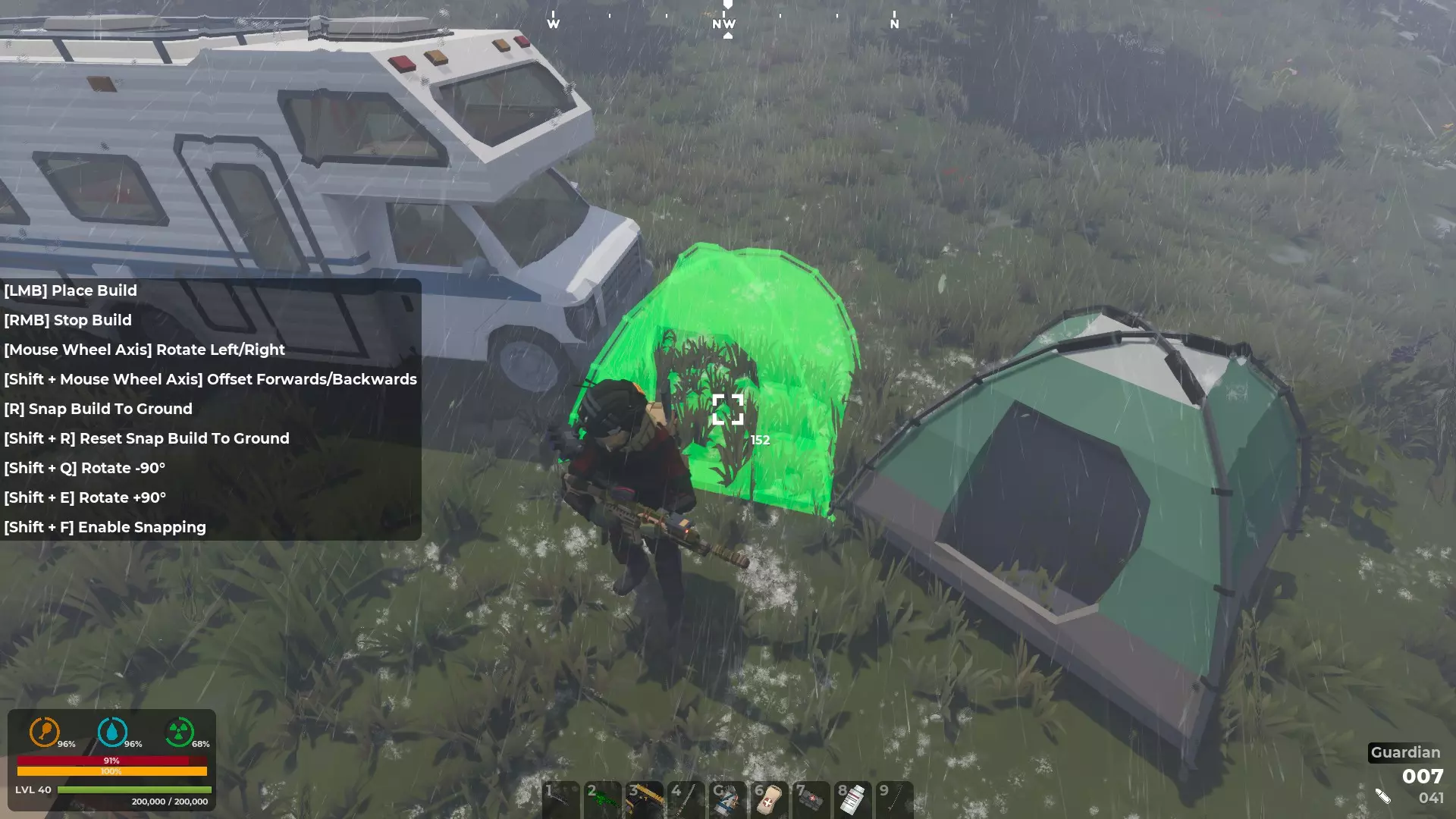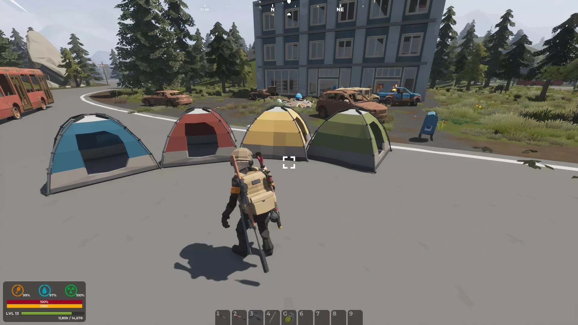 蓝色帐篷用于存放食物和水, 红色帐篷用于存放医疗用品, 黄色帐篷用于存放汽油和装备, 绿色帐篷则用于存放武器装备。 你并非必须使用这种颜色编码系统,但使用它确实是个不错的选择。 游戏后期会有更多其他储物方式,但通常在游戏的第一个小时内你就能找到一个帐篷。找到帐篷后一定要放置它,尤其是当你的个人储物格不足时。当你有更大的携带容量后,可以随时回来取回它,它会在整个游戏过程中为你所用。随着你获取的物品增多,开始在这些帐篷里存放你找到的必需品,比如第二个GPS、指南针或Vector冲锋枪,它们之后可能会派上用场。