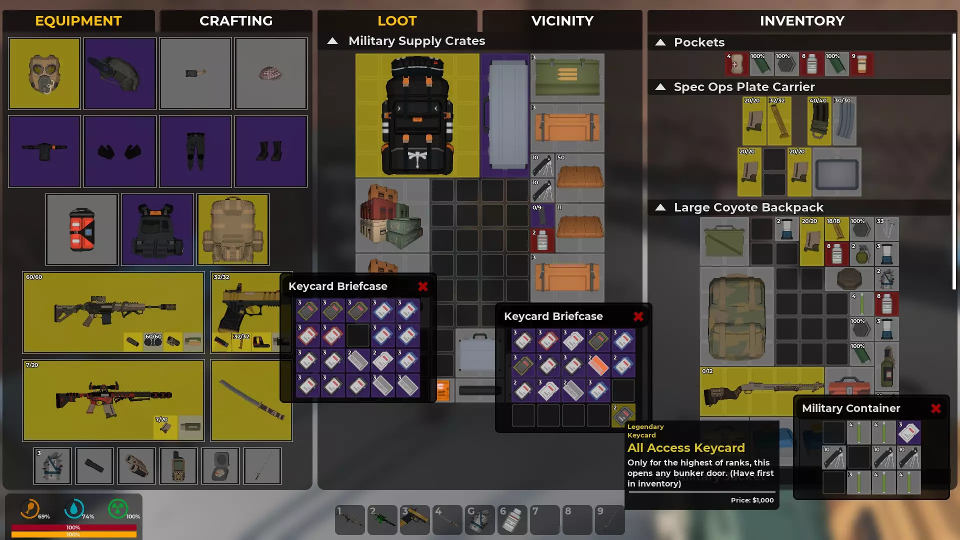 关于钥匙卡的简要说明 在游戏世界中,你偶尔会找到钥匙卡,它们可能藏在箱子里,也可能在你击败的敌人尸体上。这些钥匙卡可以打开门,通常是通往地堡、机库以及限制区域的门,里面往往有更好的战利品。 目前钥匙卡分为0级、1级、2级和3级,其中0级最为常见。 在155天的游戏时间里,我收集了大量钥匙卡,并且每个主要污染区都至少去过2-3次,因此已经使用了许多钥匙卡进入那些地堡。 当前库存: 10张【蓝色3级】钥匙卡 35张【橙色2级】钥匙卡 120张【黄色1级】钥匙卡 182张【白色0级】钥匙卡 钥匙卡的分布情况符合预期。更高等级的钥匙更为稀有,也更难获取。