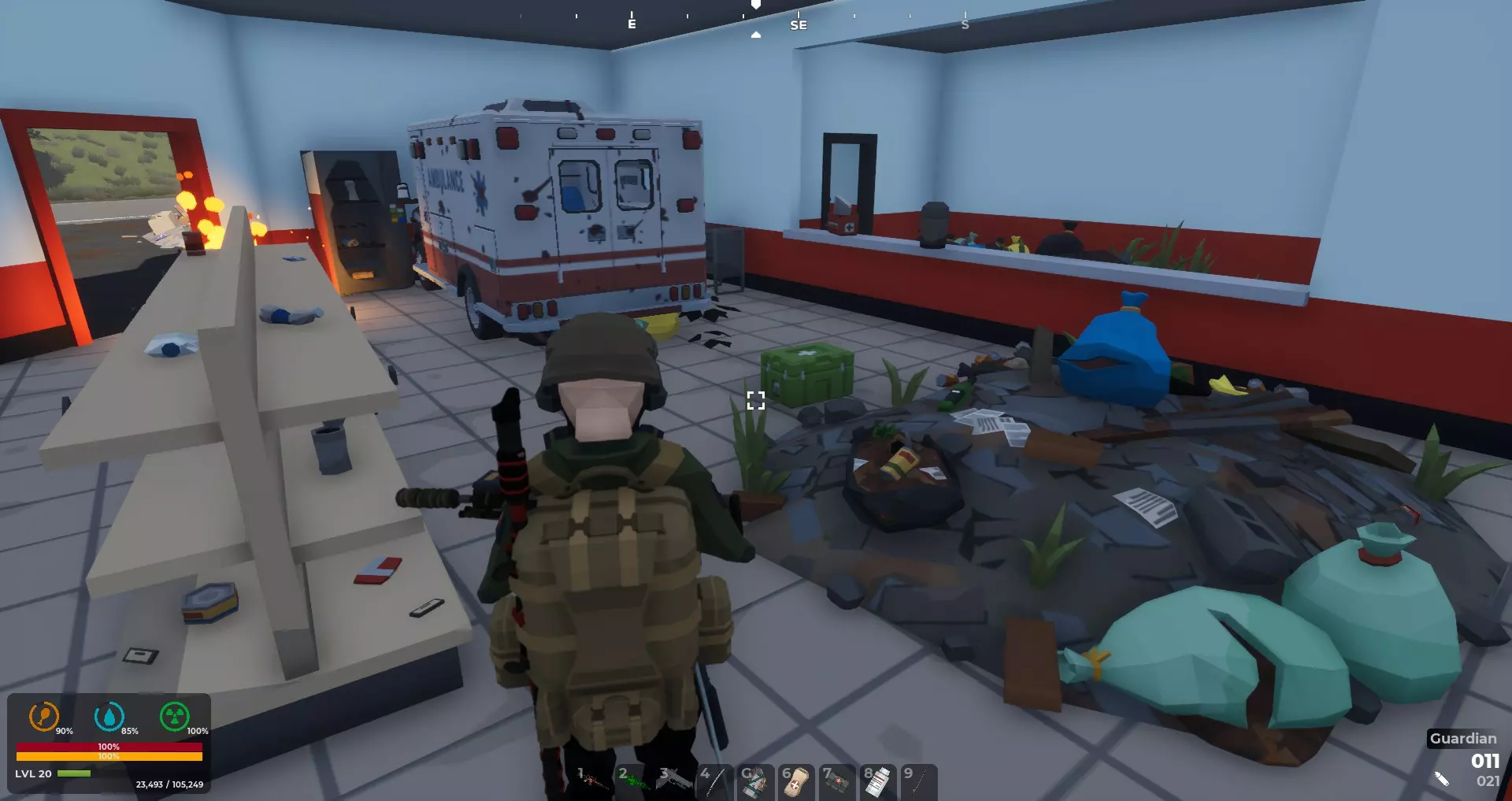 如果你看向屏幕底部,会发现有专门的6、7、8号快捷键,这是用来放置医疗绷带、急救包和辐射药片以便快速使用的。如果你开始流血,要立即用绷带包扎。如果因坠落伤害摔断了腿,就使用夹板。如果防毒面具失效,服用辐射药片来抵消其影响。 填满这些快捷栏需要大量搜寻物资。周围的行李箱可能会提供衣物。游戏中有将衣物撕成可用布料的选项,一定要这么做。布料有很多用途,包括制作抹布、绷带和睡袋。垃圾桶里会有可以搜寻的物品。
