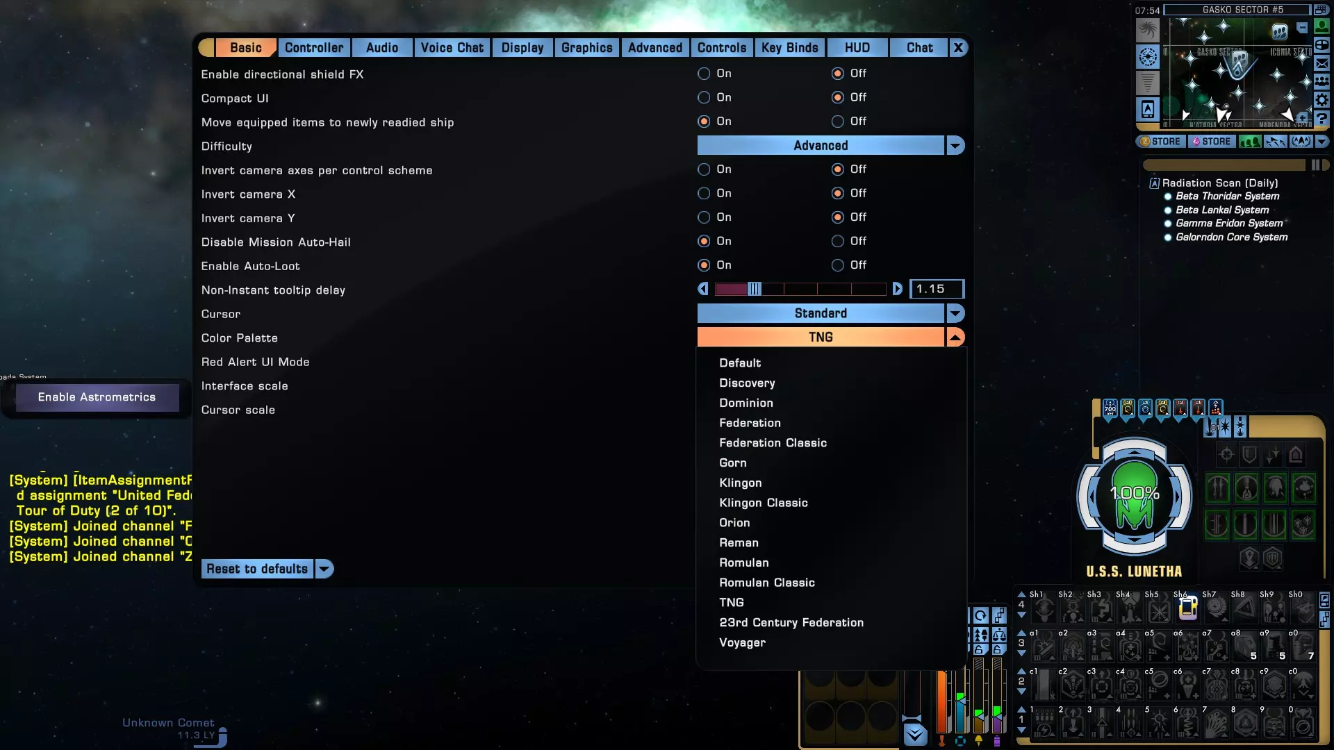 当然,如果你真的想模拟《星际迷航:下一代》的真实体验,一定要将用户界面配色方案更改为【TNG】。