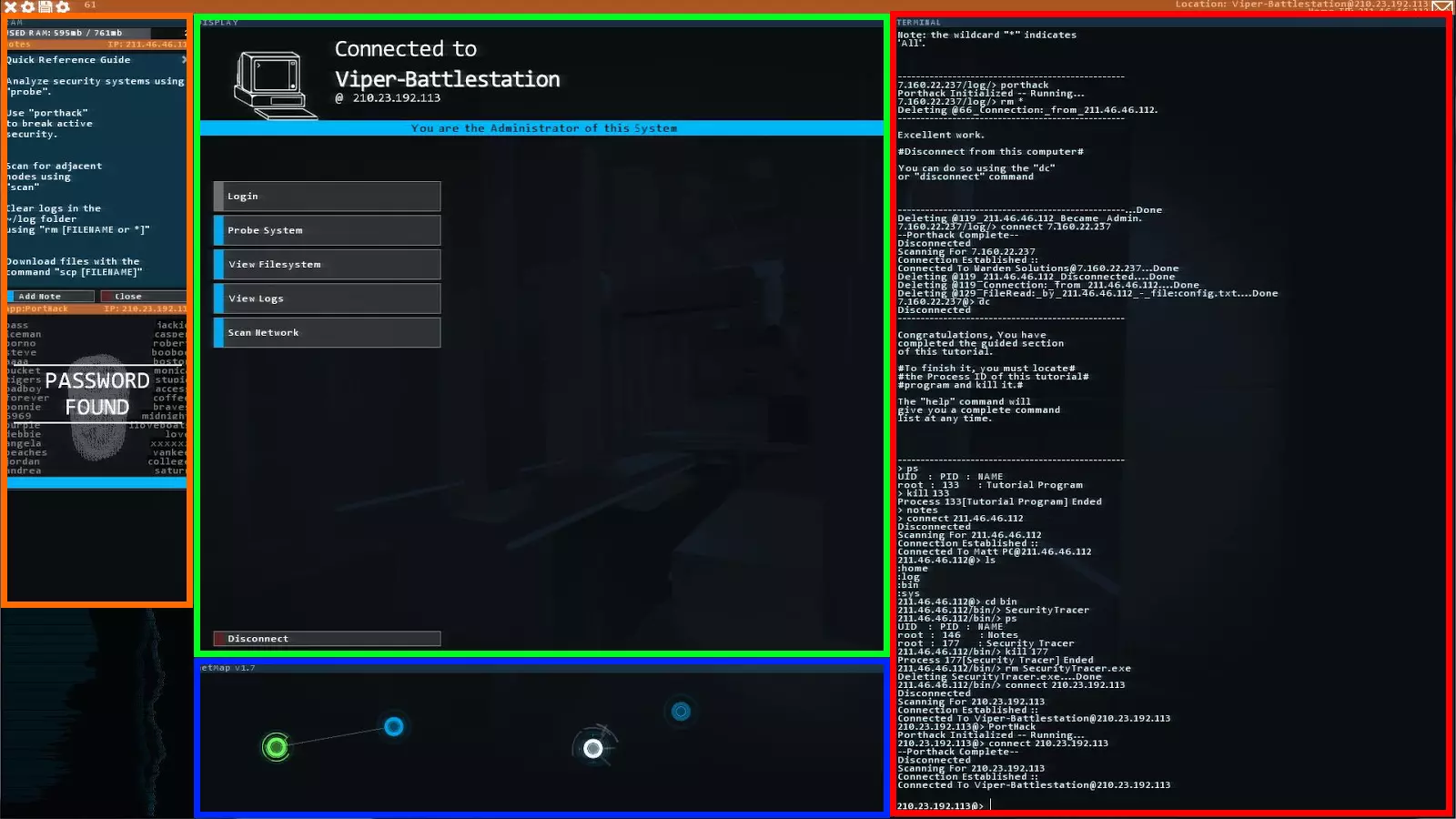 这是《黑客网络》的截图,如图所示,这是在有人入侵计算机时截取的。我还对图形用户界面(GUI)的功能进行了框选和颜色编码。可以确定的是,游戏中不会出现红、绿、蓝、橙这些方框。 点击截图可放大查看以获得更清晰的视图! 红框内是终端。 蓝框内是网络地图。 绿框内是菜单。 橙框内是内存/任务栏。 ~/home/Features.txt 图形用户界面有哪些功能? 图形用户界面包括终端、网络地图、菜单以及内存/任务栏。 让我再详细解释一下…… 首先是终端(所有神奇操作的发生地……)