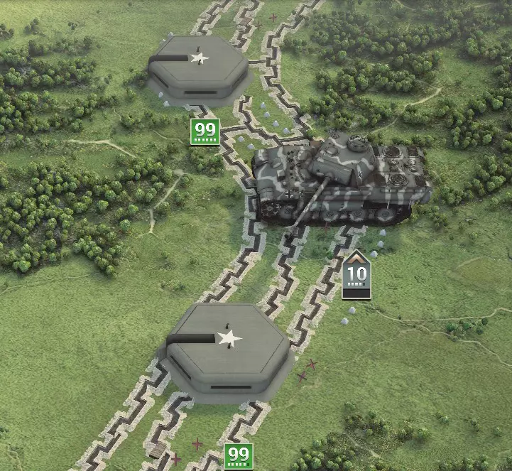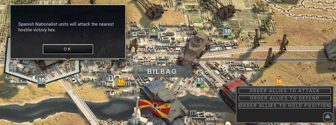 与友方AI单位交互的用户界面功能可在屏幕右下角的小三角形图标中找到。 AI盟友的作用是与玩家协同作战。当AI步兵攻击固守阵地的敌人并摧毁反坦克炮时,玩家可以对炮兵和防空单位等支援部队进行侧翼攻击。应对敌人的反击,尤其是西班牙步兵无法对付的坦克和车辆,这主要是玩家的任务。如果玩家在西班牙国民军回合前用炮火削弱敌方阵地,AI会很乐意攻击这些固守阵地。炮兵在压制敌人和降低其防御等级方面非常有用,AI盟友会充分利用玩家的炮火轰炸!如果他们推进得过于超前于你的部队,将他们的命令改为坚守阵地是让他们原地待命的好方法,同时你可以为下一次进攻准备自己的部队。 向AI下达命令时,注意消息提示会显示诸如【西班牙国民军部队将攻击最近的敌方胜利 hex】之类的内容。 这应该有助于解释AI为何会前往特定地点。游戏没有“自由漫游”模式,因为许多地图并非设计为可以被完全占领。让AI专注于目标能让它们更容易配合,因为你应该大致了解它们的攻击重点。 为什么有些地图边缘会用雷区和掩体防线封锁起来?
