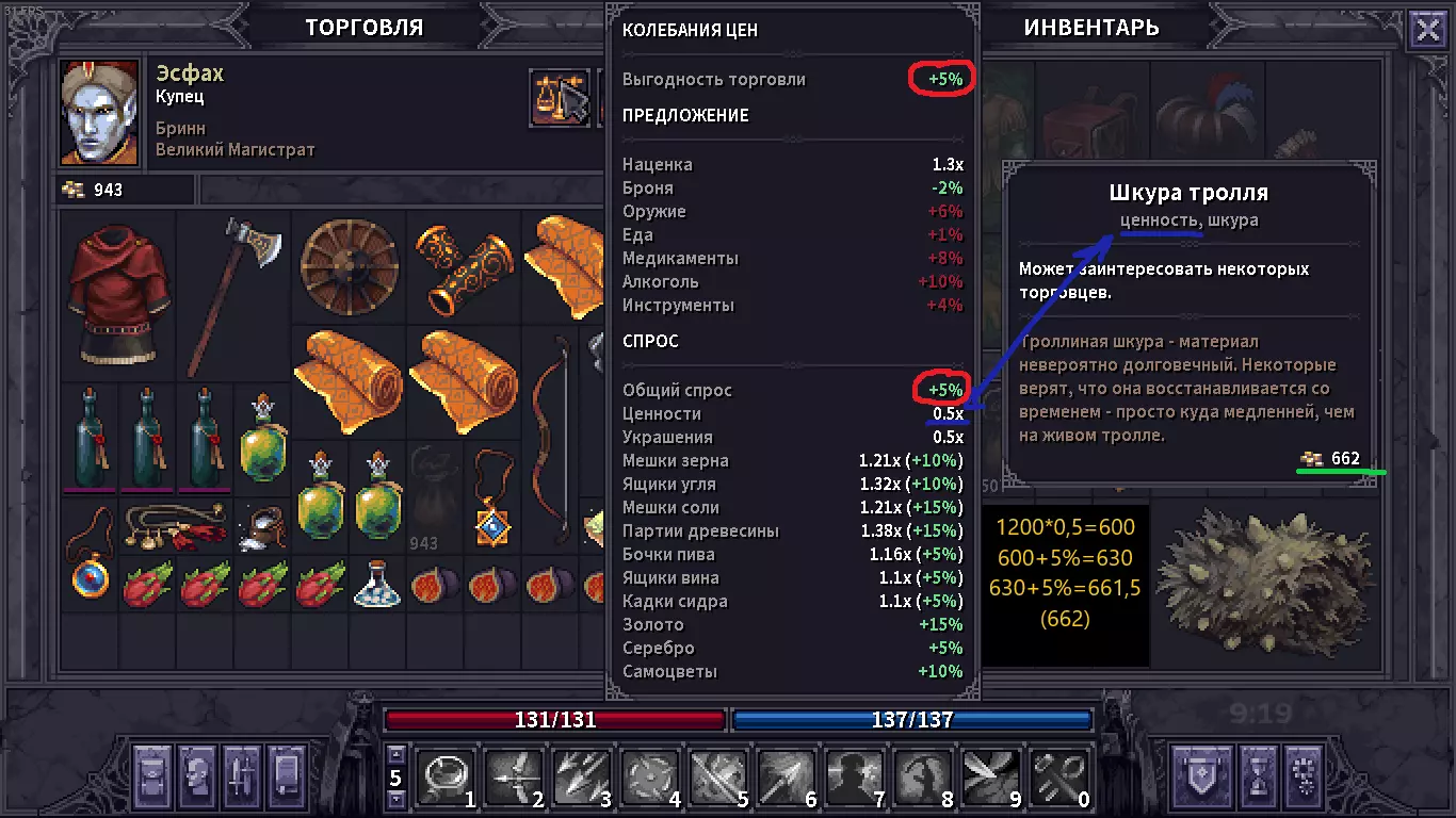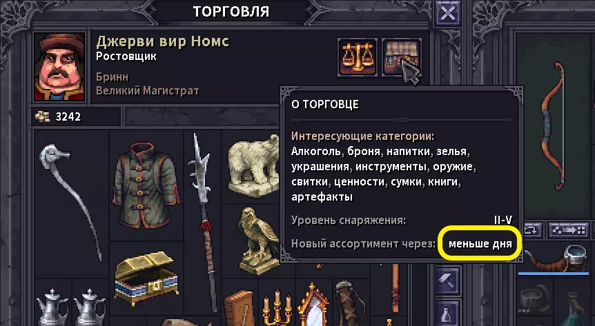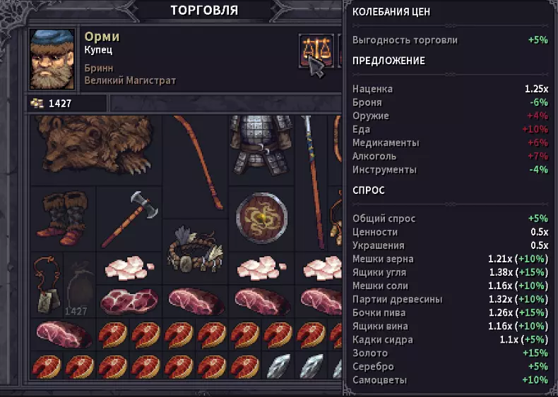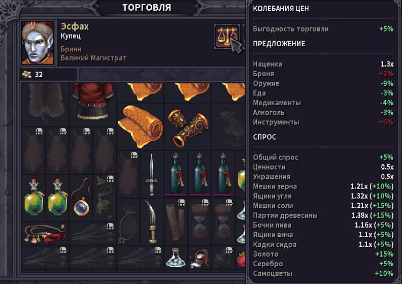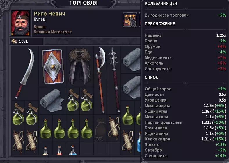 Присоединяйся к костру в наспех сооруженном лагере. Откупорь Маннширского крепленного, да подвинь к себе еще теплую похлебку в хлебе по-осбрукски. После долгих и тяжелых походов по крепостям, руинам и склепам у тебя скопилось не мало крон, старинных монет, различных самоцветов, ценностей, ингредиентов, пара клинков, которыми главарь местной шайки хотел воспользоваться против тебя, да немного ящиков с припасами. Наслаждаясь трапезой и байками Веррена и Лейфа, ты думаешь, куда все это приспособить. Кидаешь усталый взгляд на Даррела, который только закончил оковывать колеса вашей повозки металлом и на ум приходит идея, может податься в Бринн, тут не далеко, а еще ходила молва о том, что вскоре туда прибудет странствующая ярмарка. Решено, после сна отправляемся туда! В данном руководстве я хочу поделиться информацией с наемниками, у которых ящики ломятся от различных предметов и ценностей. В какой-то момент игры, я заметил, что, может быть экономика в данной игре и интересная штука, в ней хочется разбираться и подстраиваться и вообще это достаточно огромный пласт в игре, при заполнении всех 4х сундуков каравана, мне не хотелось от половины барахла избавляться путем выбрасывания его в полях Альдора. Я задался вопросом, где и как можно прям все продать и побыстрее. При чем я готов был к тому, что могу на продаже потерять в кронах в угоду своего времени. Я разработал достаточно простой и лаконичный маршрут по Альдору, в большей части по его столице, что бы +/- за 2 игровых дня можно было обменять все на золотые монетки, да еще и в силу торговли в Бринне, прикупить чего полезного. Так-же расскажу куда более выгодно можно толкнуть товары в других населенных пунктах. Сразу оговорюсь, данное руководство мое 1-ое, по этому всегда буду рад конструктивной критике в комментариях. Постараюсь писать только актуальную информацию. В данном случае на момент написания игра находится в Beta 0.9.1.19. Это лично мое рассуждение и мои советы. Если Вы делаете как то иначе, прошу, пишите в комментах, с удовольствием обсужу с вами ваши варианты 👍 . По поводу обновления в патче 0.9.2.0.Разработчики ввели изменения в механике спроса и предложения, которые теперь работают не на всю категорию товаров в целом, а разбита на индивидуальные товары. Это значит, что продажа или покупка зерна больше не будет влиять на цены угля в поселении. Звучит это правильно, на практике данных моментов не встречал т.к. продавал все 1-ним игровым днем. А покупка в несколько дней подряд не возможна по механике обновления товаров. Так же был → Исправлен эксплоит с дюпом денег в банке Бринна. Исправлен эксплоит с дюпом денег в банке Бринна. Разрабы 2жды указали данный факт в перечне обновления. Мб рофл или что нибудь другое, незнаю, но про данный дюп не вкурсе. Да и как то игра не про то, что бы дюпать предметы. По поводу обновления 0.9.2.4-0.9.2.7→Исправлен торговый эксплоит, связанный с алхимиком в Бринне. Пофиксили очередной эксплойт. →Доставщики товаров в караван теперь исчезают с локации при перемещении каравана. Пока что сам не разобрался зачем они нужны. Есть наитие, что они просто привозят в ваш караван покупки из поселения, но как будто бы за этим стоит что то большее. (Мне хочется в это верить :D ) По поводу обновления в патче 0.9.3.4. "Of Beasts & Sages" Базовая цена большинства ценностей была повышена. - Повышены коэфф