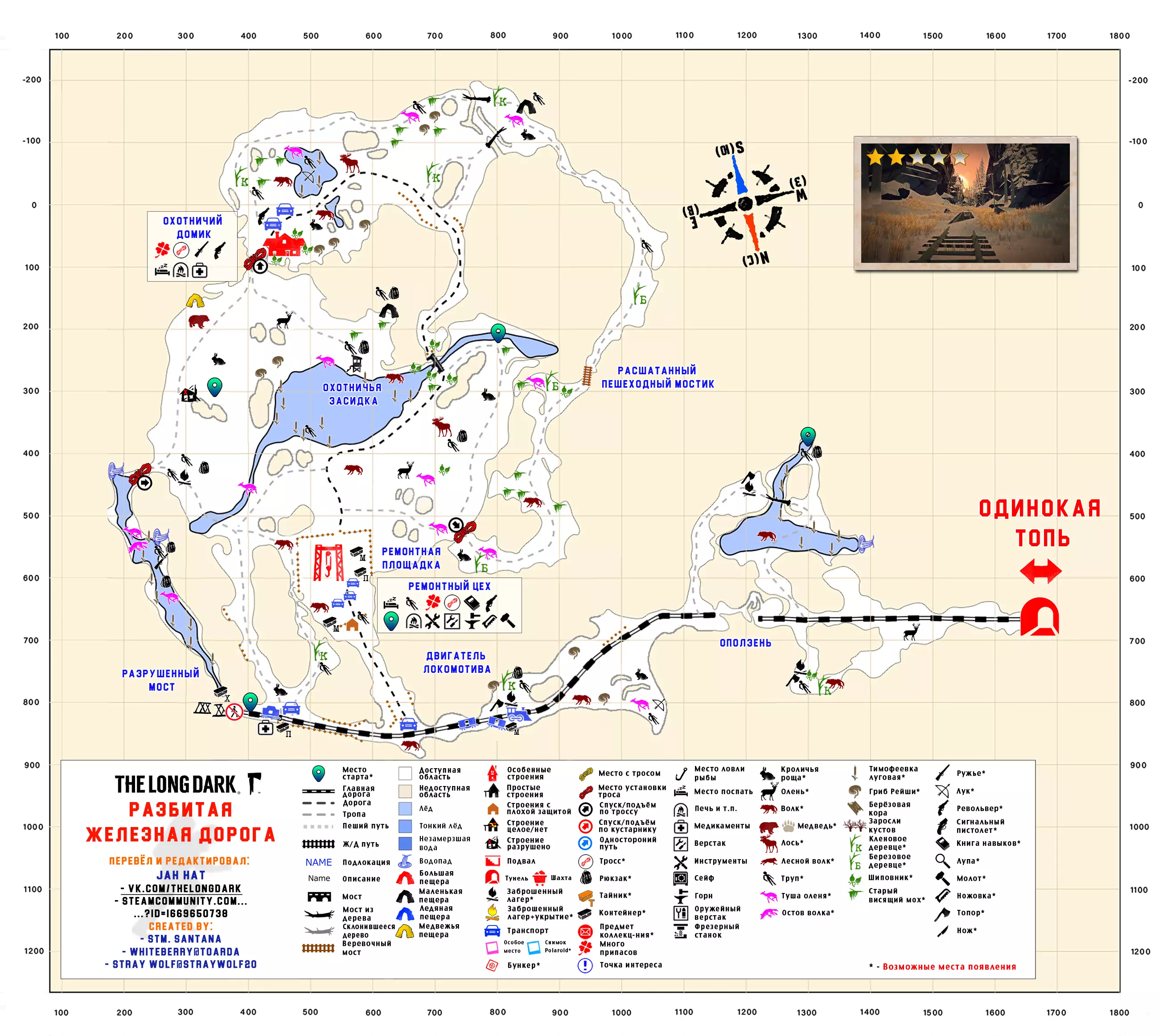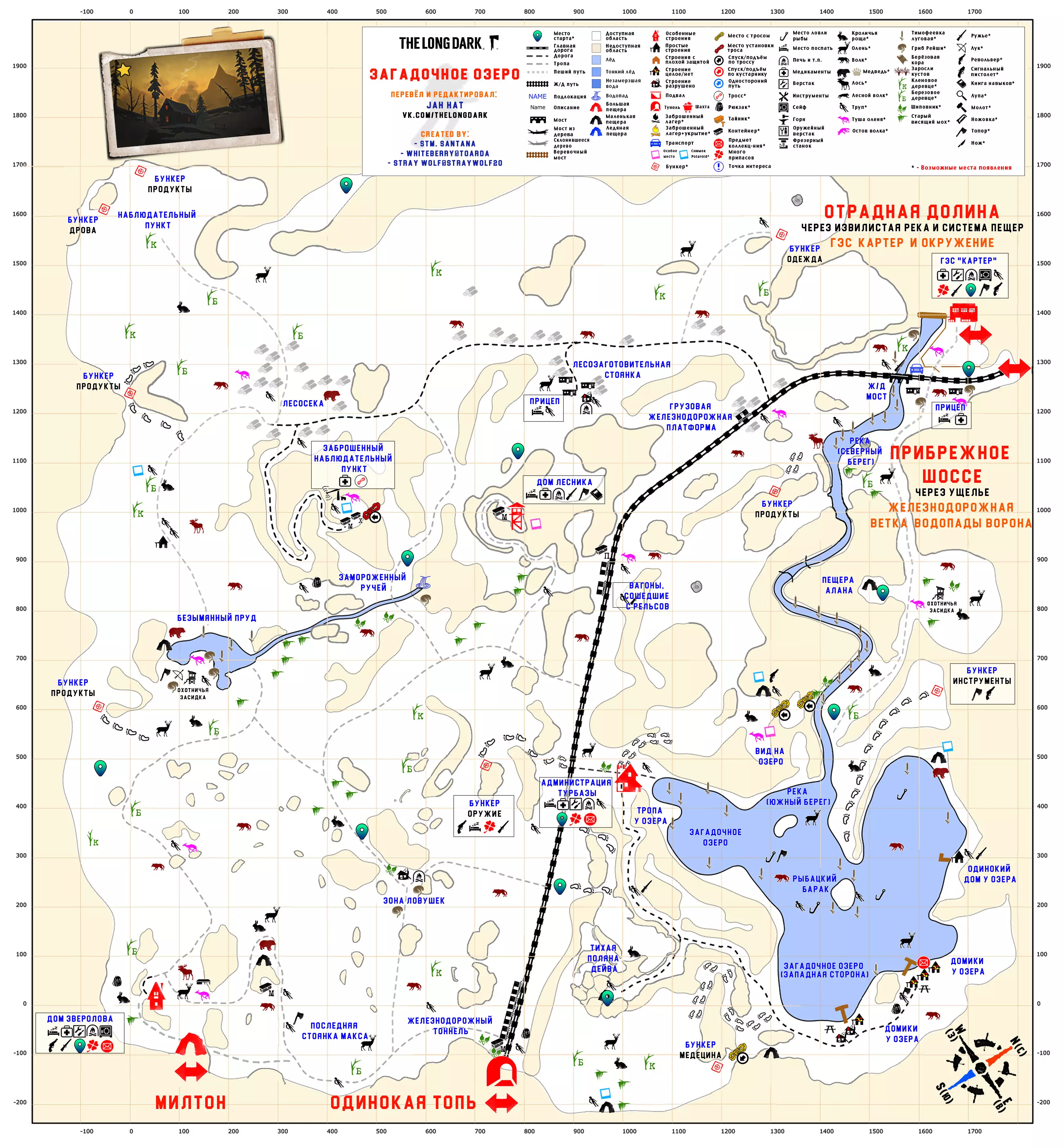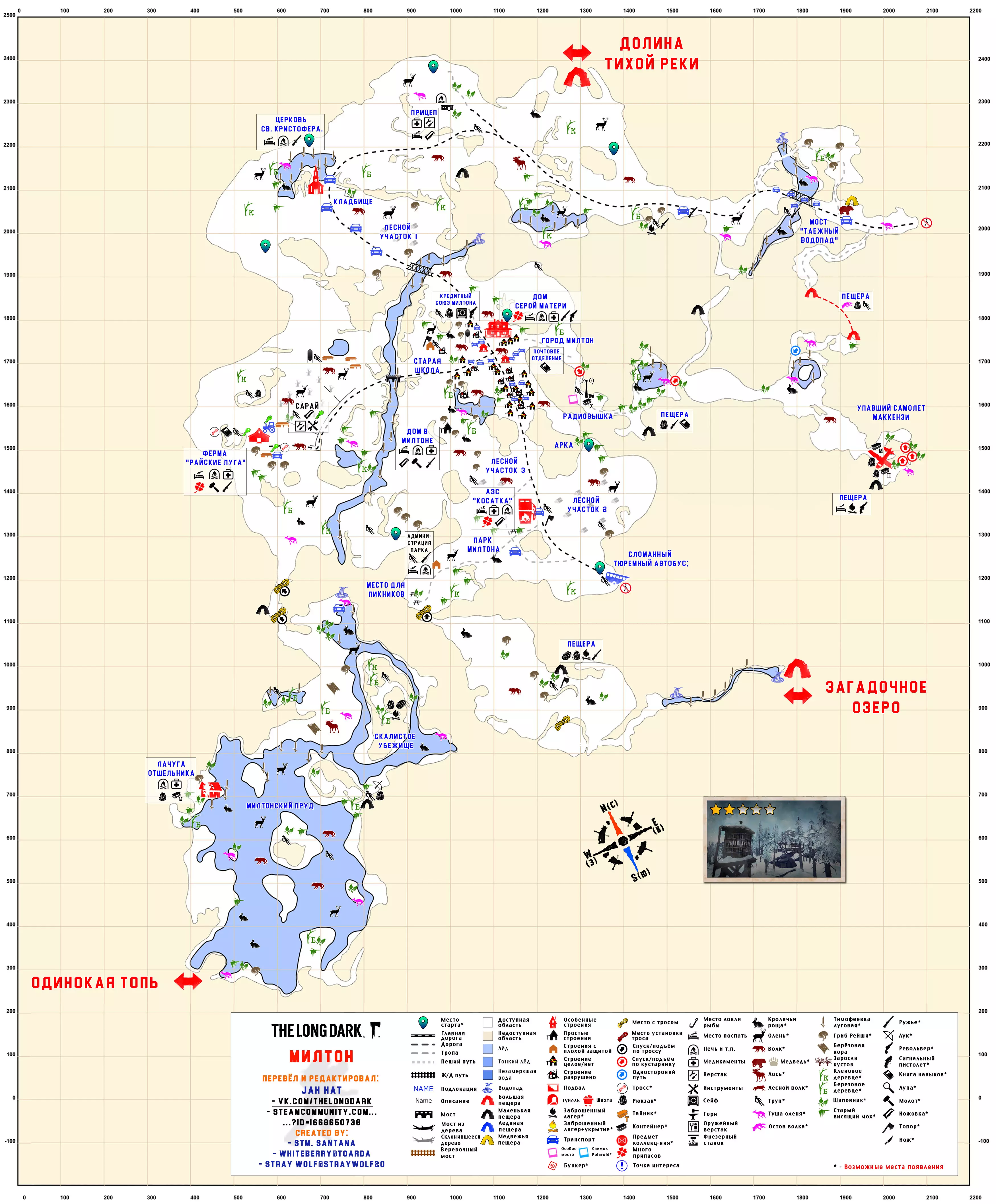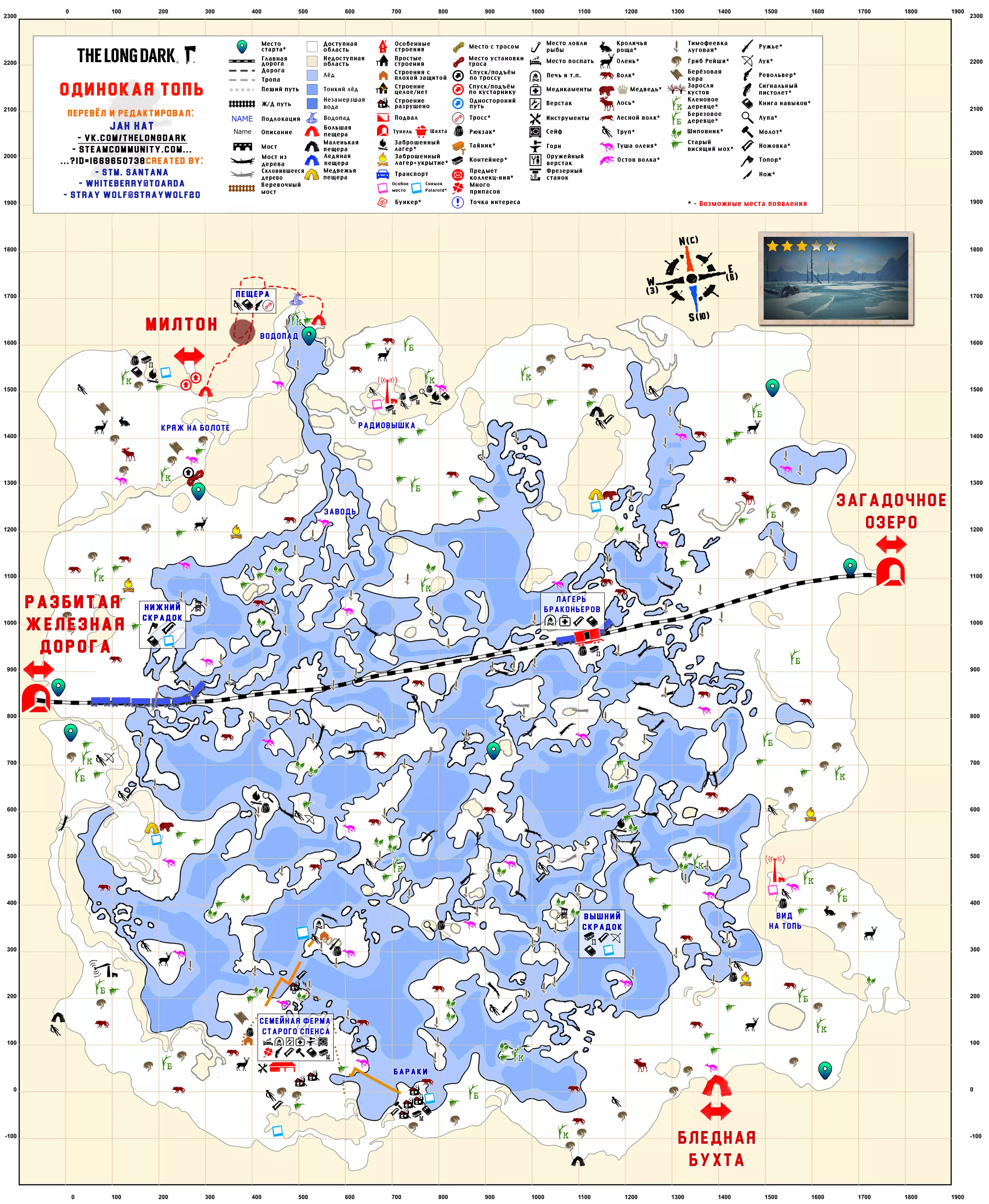 更新日志 04.03.2017 添加地图【孤独沼泽】。该地图没有翻译,也没有结局。 09.03.2018 添加地图【神秘湖铁路】【米尔顿】。根据作者当前版本更新地图【孤独沼泽】。根据各章节的时效性和内容修改标题。将【作者的话】板块移至指南顶部,以减少评论区的提问数量。 06.12.2018年更新内容: 1. 将【神秘湖泊】地图替换为维基百科上的更新版本。 2. 将【米尔顿】地图替换为新版本(Whiteberry / The Riddler)。 3. 将【神秘湖泊铁路】地图替换为新版本(Stray Wolf / Riddler)。 4. 将【孤独沼泽】地图替换为翻译版本(来自维基百科)。 5. 添加【静河谷】地图(Whiteberry / Stray Wolf / Riddler)。 6. 修改了各部分的描述(目前已知并非所有地图都为最新版本),并更新了指南说明。 22.01.2020年添加了地图【苍白海湾】(Whiteberry / YusufpawFA / Riddler)。 2020年5月26日将【发射区】【区域间旧岛】【滨海公路】【峡谷】【蜿蜒河流】【宜人山谷】【孤独沼泽】等地图替换为带有【石头堆】收集标记的同类地图。 在【神秘湖】【狼山】和【神秘湖铁路】区域中添加了指向带有【石头堆】收集标记地图的链接。因为标签是为经过重大改动的旧版本地图制作的。 2020年12月19日:添加地图【灰烬峡谷】(YusufpawFA / Jahhat) 2021年1月23日:将地图【孤独沼泽】替换为轮廓版(Stray Wolf / Jahhat) 2021年2月1日:更新指南封面,添加地图作者信息,将【灰烬峡谷】的煤炭版本替换为轮廓版(YusufpawFA / Jahhat) 2021年2月8日:2021年,将“神秘湖铁路”替换为轮廓式的“破损铁路”(由YusufpawFA和Jahhat制作)。更新了链接和描述。 2021年5月21日,将“峡谷”地图替换为轮廓式地图(由Stray Wolf、Stm.Santana、Jahhat制作)。 2021年10月26日,指南已完全更新: 1. 编辑了“标题栏”——填写了指向作者、翻译者、指南的最新链接。 2. 编辑了“作者的话”部分。 3. 将所有地图替换为最新版本。