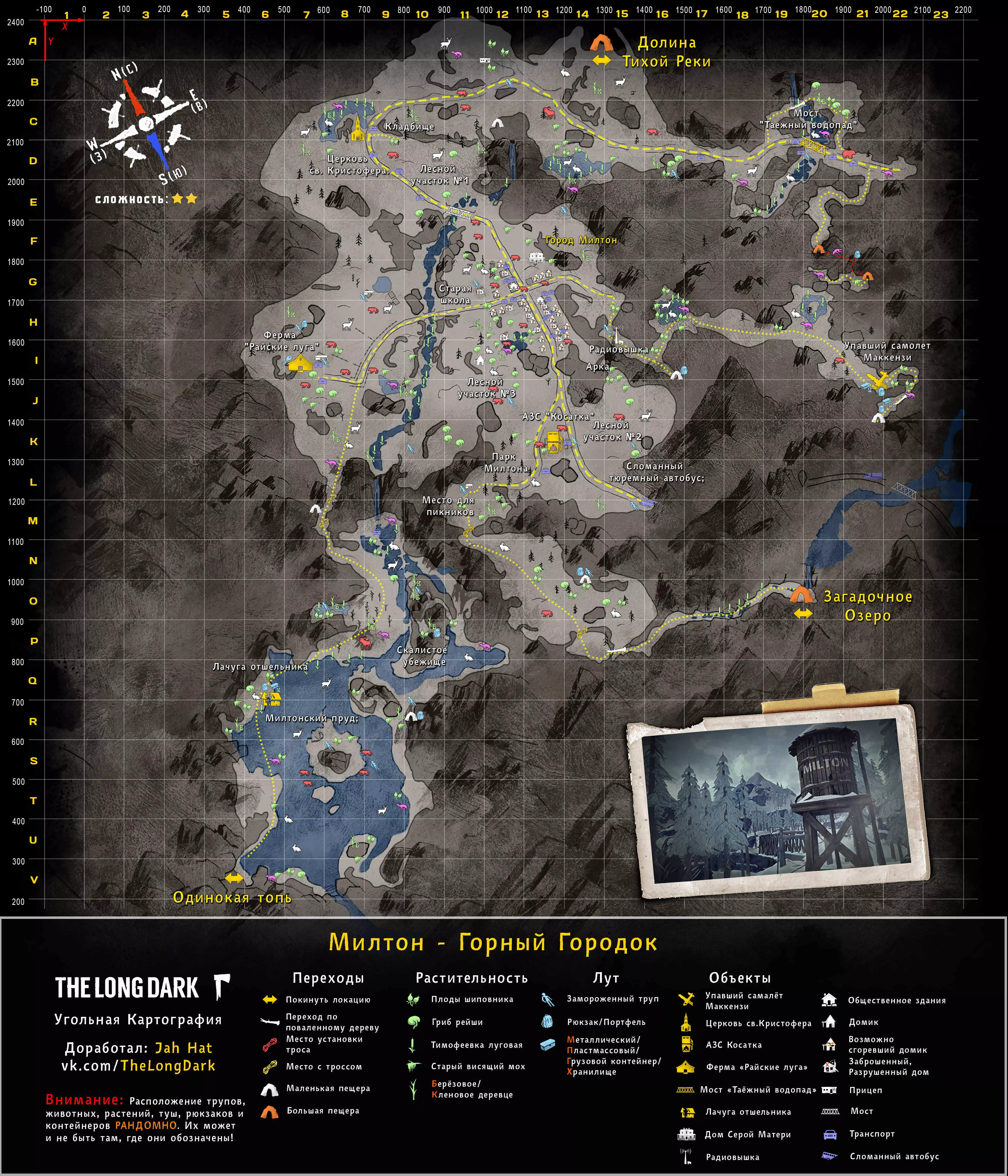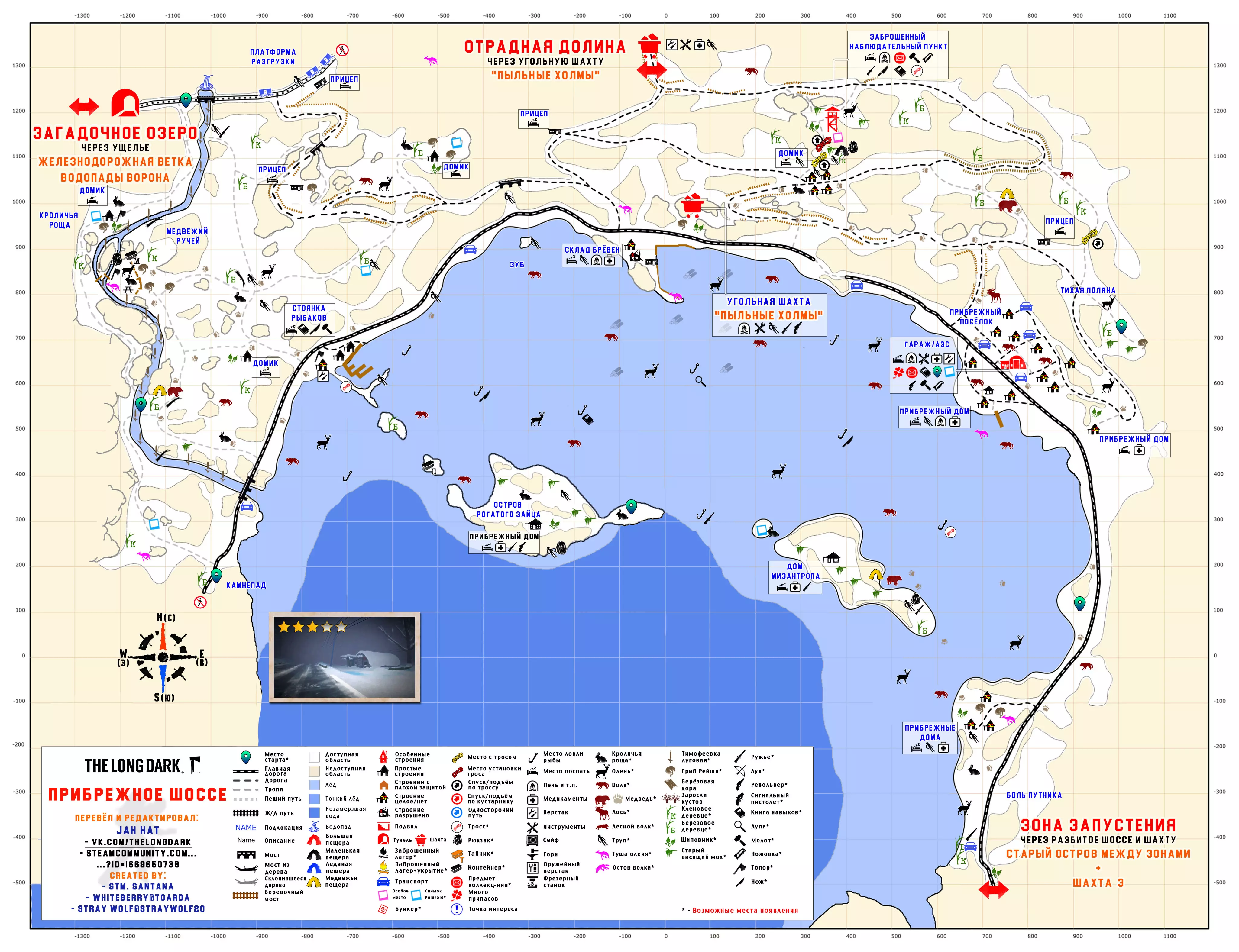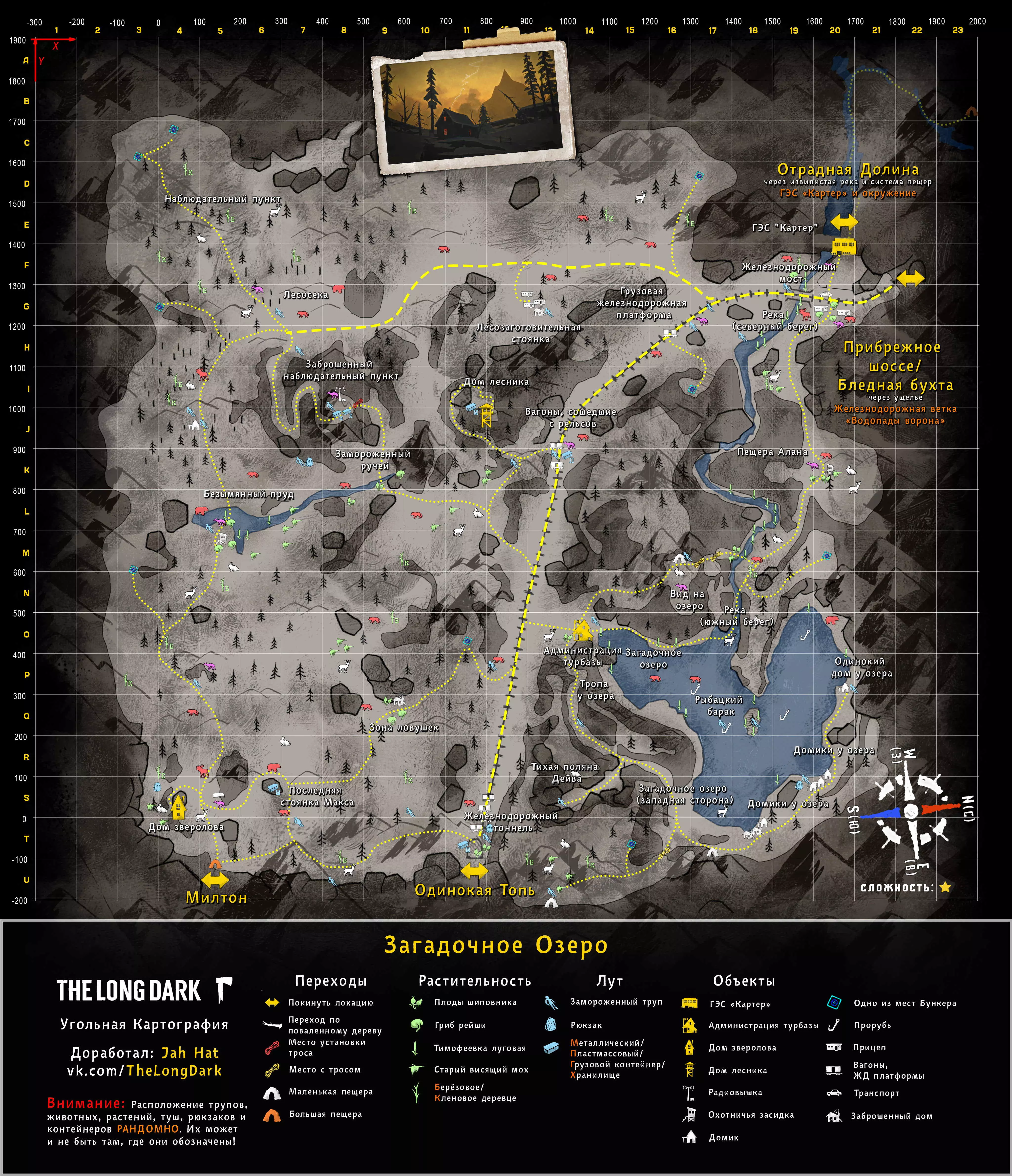 《漫漫长夜》地点地图(俄语版) 地图作者: "WHITEBERRY@TOARDA" "STRAY WOLF@STRAYWOLF20" "STM. SANTANA" "YUSUFPAWFA" 地图翻译者: "WICK22R" 瓦列里·科马罗夫 "JAHHAT" WHITEBERRY的地图(英文版) STM. SANTANA的地图(英文版) STRAY WOLF的地图(英文版) YUSUFPAWFA的地图(英文版) THE RIDDLER的地图 伊利亚·德廖明 JAHHAT的地图 作者说明: 1. 地图按难度分组,并按实用性排序(个人观点)。 2. 我不是地图作者。作者信息已在指南顶部注明。目前本指南完全由JahHat的指南地图构成,这些地图在制作时保留了Whiteberry原版的风格,是目前较为实用且最新的版本之一。【简单地点】 最适合居住,适合初次体验游戏及了解其机制的地点。 神秘湖泊 完整尺寸轮廓