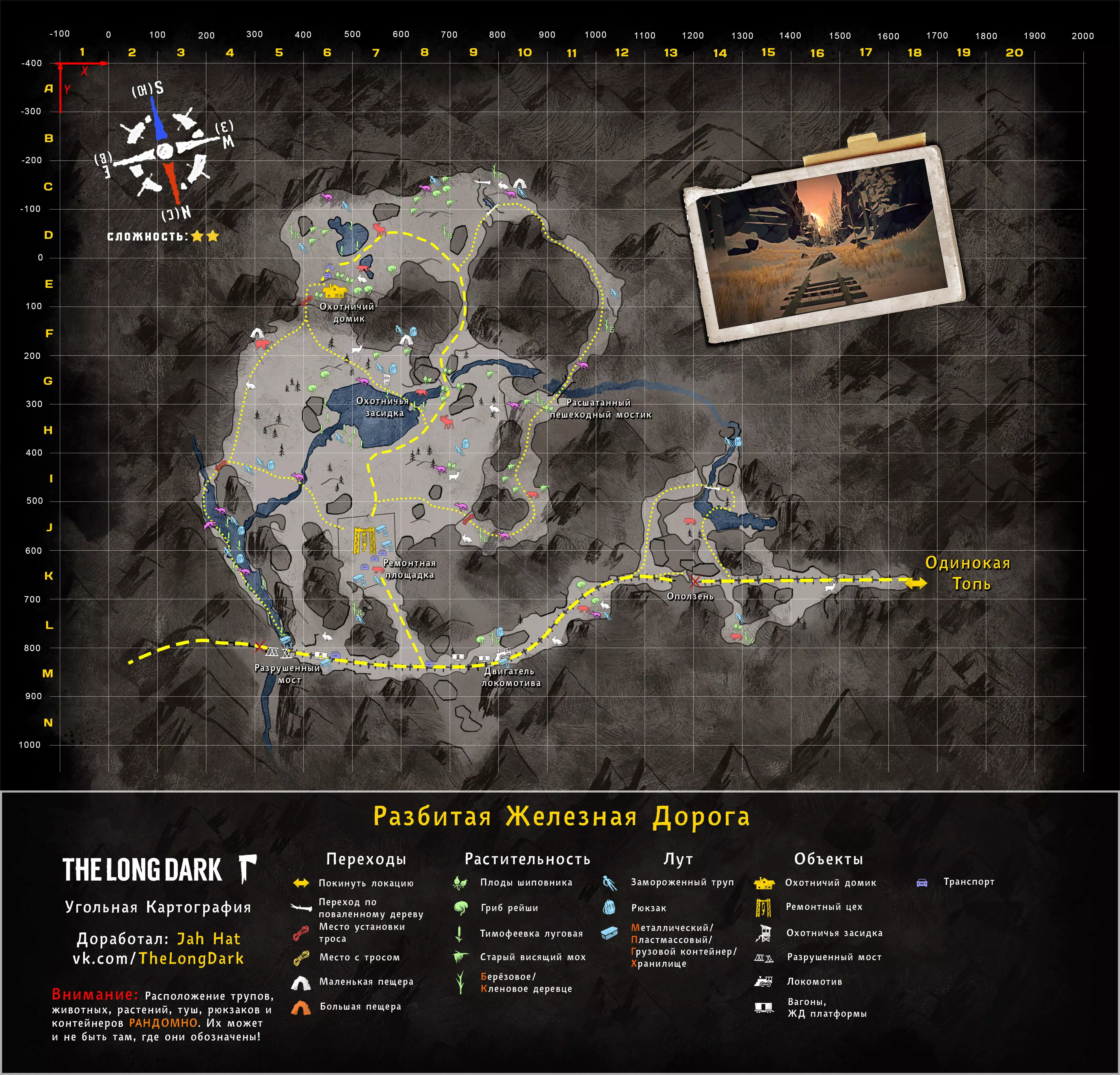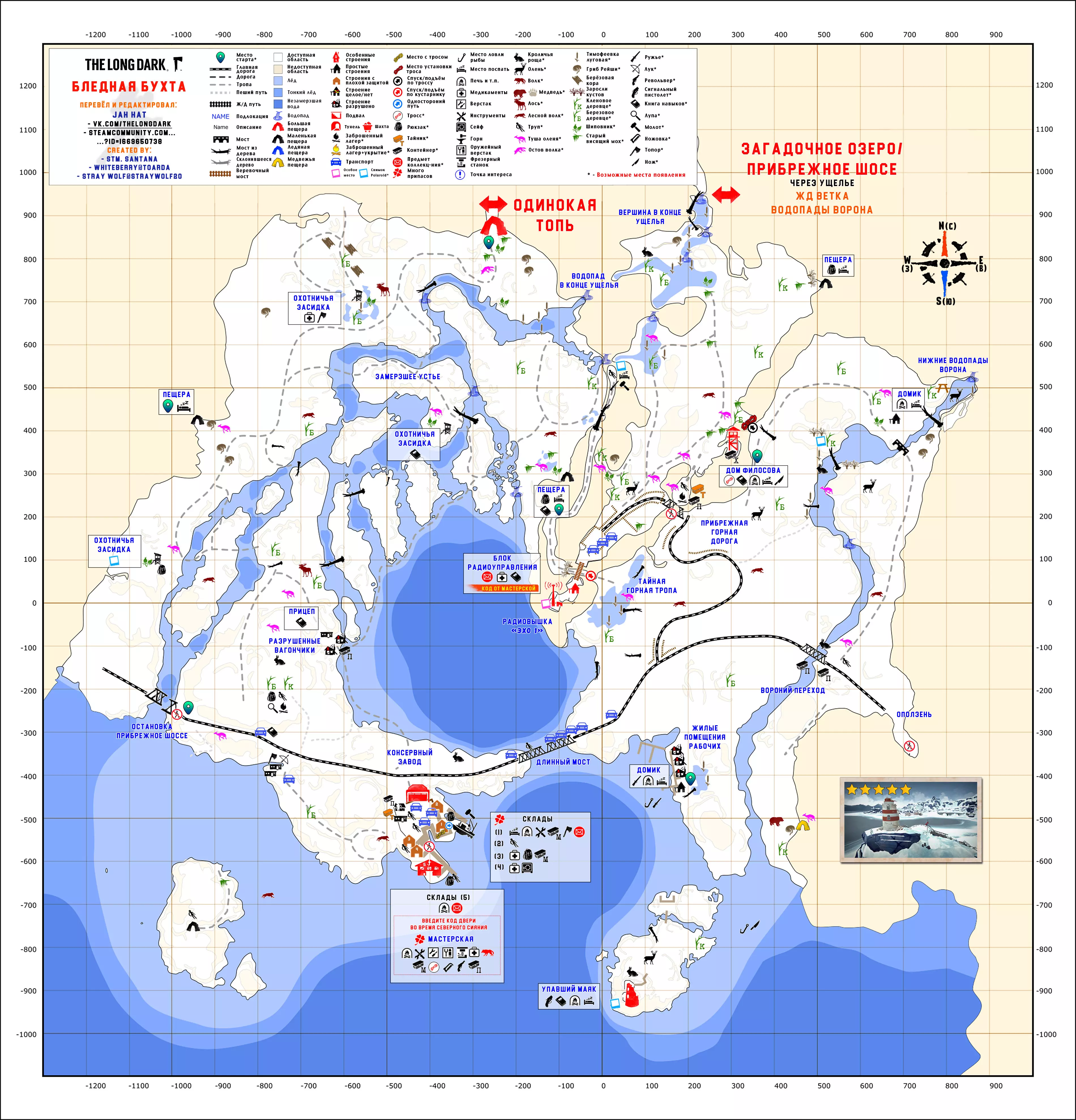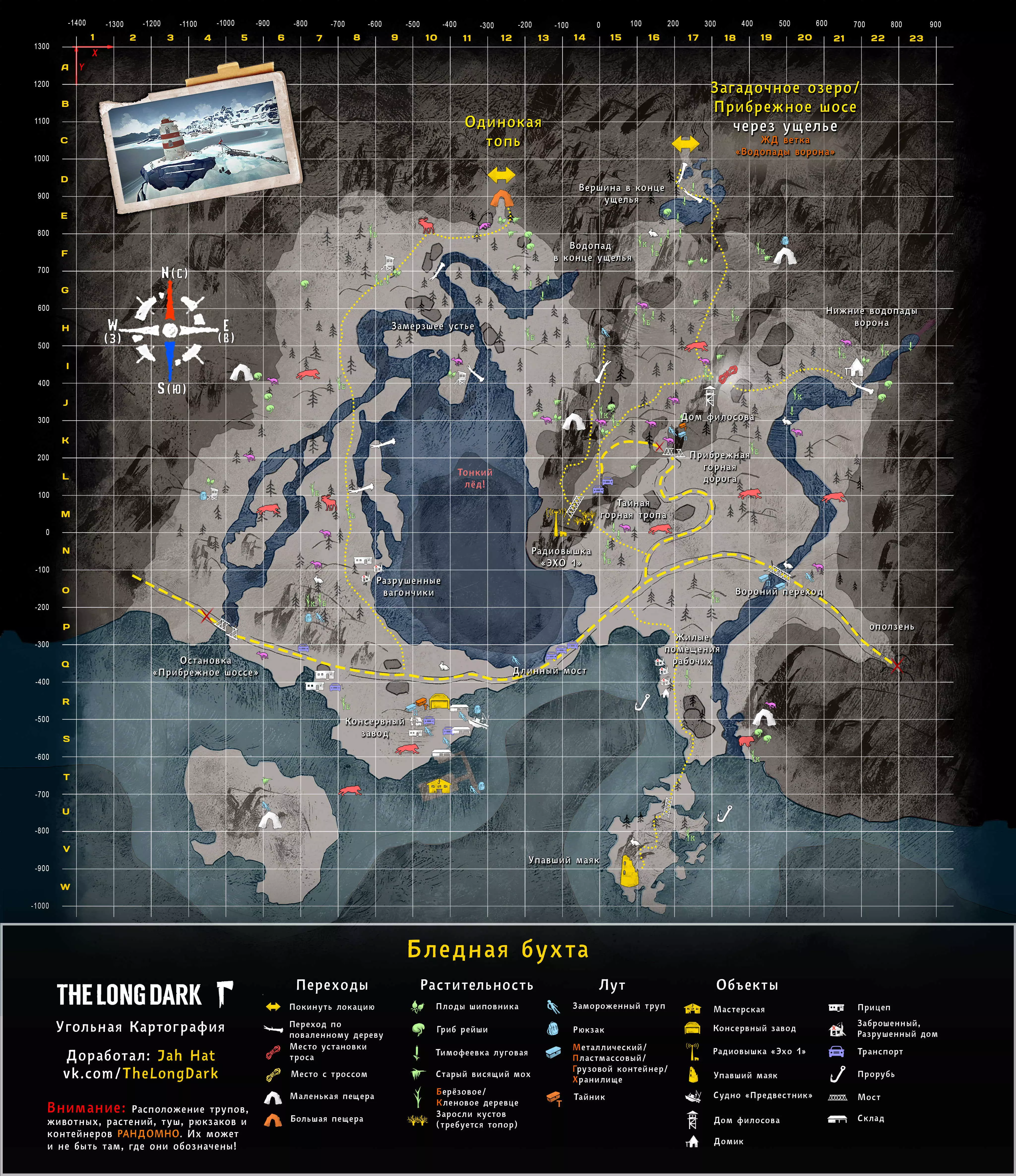 《漫漫长夜》地点地图(俄语版) 地图作者: "WHITEBERRY@TOARDA" "STRAY WOLF@STRAYWOLF20" "STM. SANTANA" "YUSUFPAWFA" 地图翻译者: "WICK22R" 瓦列里·科马罗夫 "JAHHAT" WHITEBERRY的地图(英文版) STM. SANTANA的地图(英文版) STRAY WOLF的地图(英文版) YUSUFPAWFA的地图(英文版) THE RIDDLER的地图 伊利亚·德廖明 JAHHAT的地图 作者说明: 1. 地图按难度分组,并按实用性排序(个人观点)。 2. 我不是地图作者。作者信息已在指南顶部注明。目前本指南完全由JahHat的指南地图构成,这些地图在制作时保留了Whiteberry原版的风格,是目前较为实用且最新的版本之一。【简单地点】 最适合居住,适合初次体验游戏及了解其机制的地点。 神秘湖泊 完整尺寸轮廓