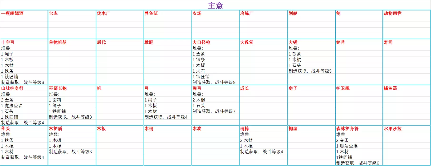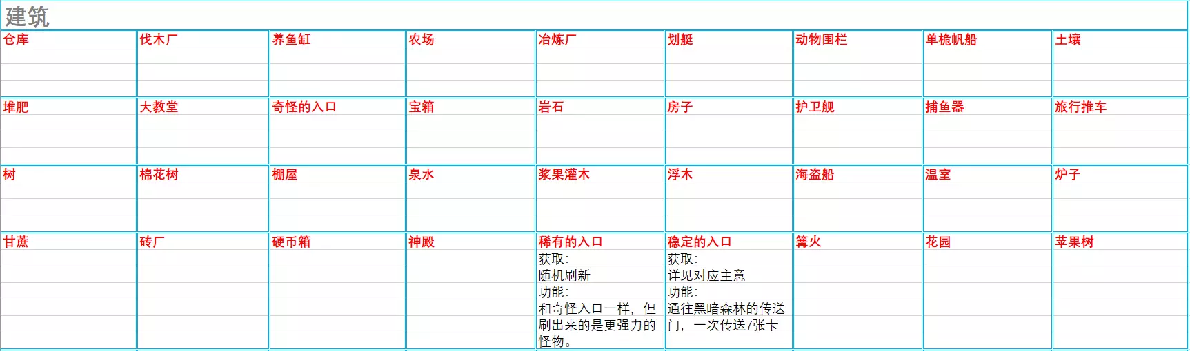 【附录:游戏内流程界面所有主要分类一览】 基础:木棍、硬币箱、熟肉 成长:房子、后代 重要:谣言:战斗、谣言:暗黑森林、谣言:海岛、神殿、大教堂、神圣的钥匙 修建:动物围栏、砖厂、农场、花园、伐木厂、集市、铁矿、采石场、锯木厂、棚屋、冶炼厂、铁匠铺、稳定的入口、炉子、仓库、养鱼缸、堆肥、酿酒厂、金矿、温室、食堂 烹饪:篝火、鸡、煎蛋饼、水果沙拉、奶昔、煎蛋卷、炖肉、酸桔汁腌鱼、一瓶朗姆酒、炖海鲜、寿司、鸡蛋寿司 民兵:矛、剑、链式护甲、黄金胸甲、铁护盾、巫师长袍、木护盾、森林护身符、山脉护身符、斧头、大口径枪、骨矛、骨杖、飞镖、弓、破瓶子、棍棒、十字弓、大锤、魔法剑、魔法戒指、魔法杖、魔法宝典、魔杖、镐、弹弓、钉子板、飞镖手里剑资源:砖块、铁条、木板、空瓶子、木炭、硬币、面料、玻璃、金条、绳子 地点:海岛、采沙场 材料:砂岩 物品:贝壳宝箱、钓鱼杆、捕鱼器、卡牌(黑暗森林) 船只:海军护卫舰、划艇、帆、单桅帆船 活动:钓鱼 谣言:鳗鱼饵料、鲨鱼饵料、金枪鱼饵料 游戏中百科包含所有出现的卡牌(含主意),卡牌更新后共331张。同前两部分一样,本部分将主意条目单独罗列,因此卡牌表格跳过主意部分,对应剩下的242张,且跳过前面已介绍过的卡牌。 对于主意卡牌,有疑惑的请查看上一条;对于其他未介绍卡牌,有疑惑的请查看前两部分。可通过游戏首界面或者流程中按ESC暂停,来查看【卡牌百科】,本表格根据游戏内顺序和分类,只列举出新增项目,请结合上篇,对照自己游戏相应分类中从左往右对照查漏。 建筑(统共50条,在海岛版本的47条基础上新增3条)