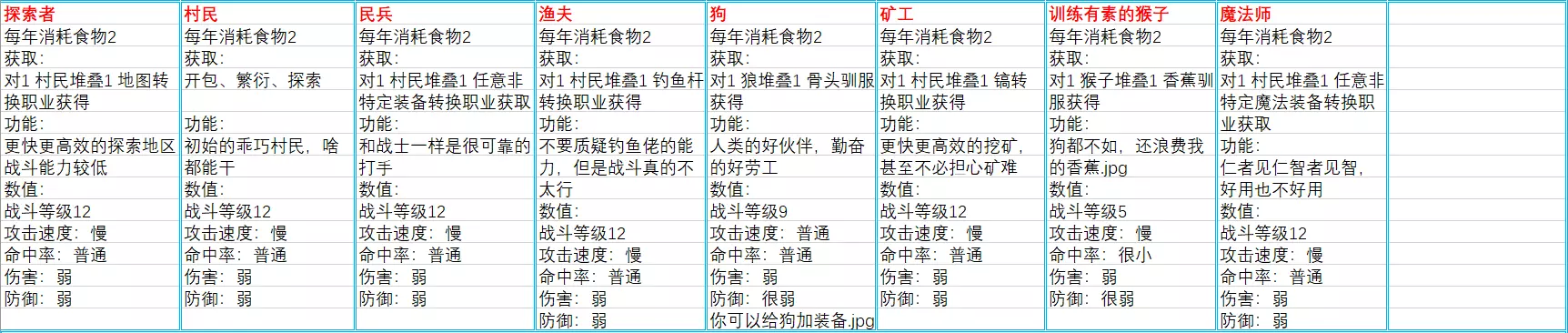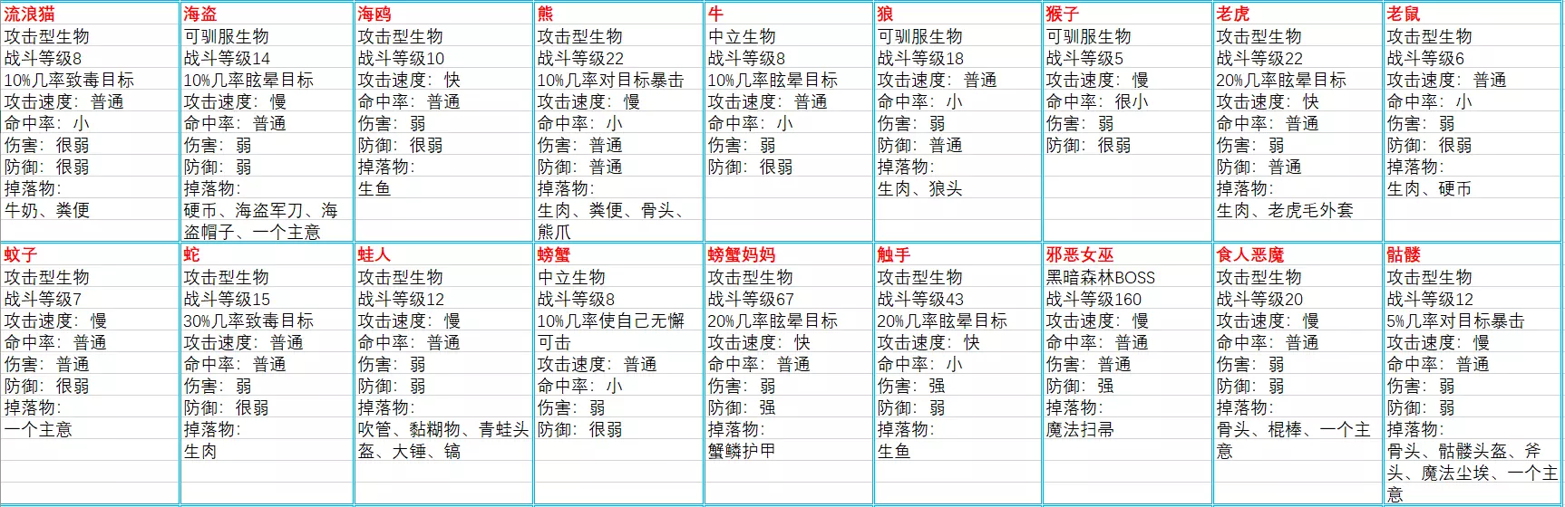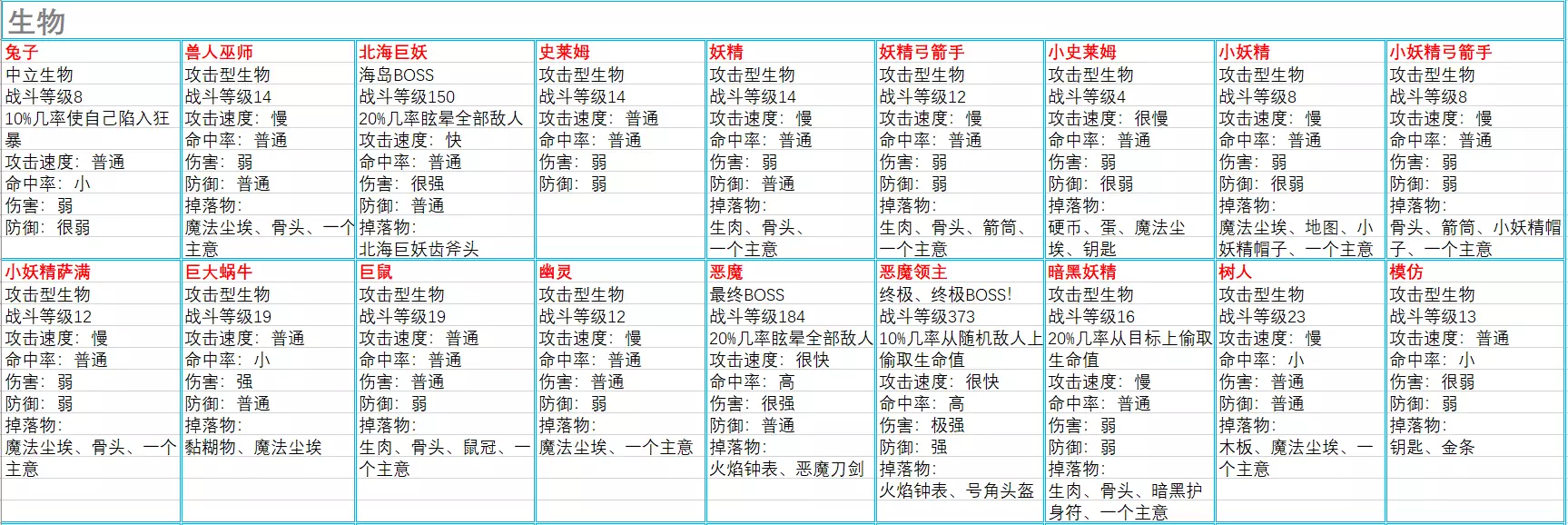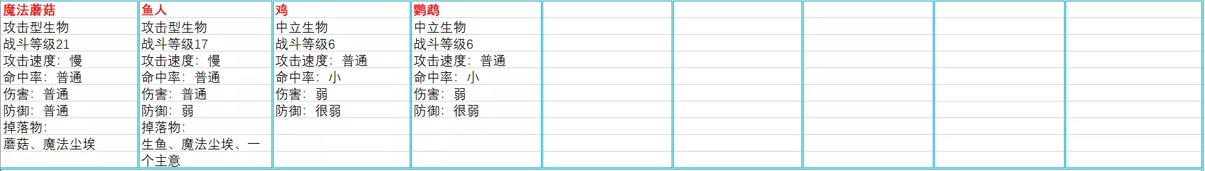 食物(共29条,与海岛版本的29条完全一致,本条略过) 生物(共40条,在海岛版本23条的基础上有新增,也有删改)