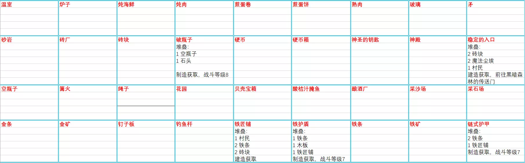 流程必得,必须关闭安全模式的情况下,需要前置“圣殿”,将获取的“圣杯”堆叠在“圣殿”上,等待读条结束后出现“恶魔”,首次成功杀死恶魔即可 (玩到这里游戏内容就差不多结束了,虽然杀死后仍可以继续游戏,但基本上全部内容都体验完了) 以上16个成就,一周目即可全成就成功,请注意部分流程外的成就解锁 卡包(大陆) 一共7个卡包,通过任务进度解锁 卑微的开始 基础包,3硬币一次,每包共含3张卡牌 概率出现:树、岩石、浆果灌木、土壤、兔子、木材、石头、老鼠、一个主意、钥匙 (后期可帮助快速解锁全主意) 寻求智慧 最实惠包,4硬币一次,每包共含4张卡牌 概率出现:树、岩石、浆果灌木、木材、石头、木棍、火石、粪便、硬币 收获与播种 农业包,10硬币一次,每包共含4张卡牌 概率出现:浆果、苹果、胡萝卜、生肉、兔子、牛、鸡、土壤、树、岩石、浆果灌木 (获取土壤和动物的最快途径) 古怪的美食 食材包,10硬币一次,每包共含3张卡牌 概率出现:洋葱、蛋、牛奶、土豆、蘑菇、树、岩石、浆果灌木、浆果、苹果、胡萝卜、生肉 逻辑与理性 进阶包,15硬币一次,每包共含4张卡 概率出现:树、岩石、浆果灌木、砖块、木板、铁矿石 (无矿场时铁矿的实惠来源) 探索者 地图与怪物包,20硬币一次,每包共含3张卡牌 概率出现:树、岩石、浆果灌木、巨鼠、熊、骷髅、狼、史莱姆、森林、山、平原、老村庄 (怪物成就可用该卡包快速解锁) 秩序与结构 高级材料包,25硬币一次,每包共含4张卡牌 概率出现:铁矿床、树、岩石、浆果灌木、砖块、木板、铁矿石 主意(大陆) 一共31个主意,可通过流程内基础包购买收集,值得注意的是,即便当前没有获得某个主意,主动堆叠合成获得相关卡牌时,对应主意也会同时解锁。 主意可借助流程界面左上角随时查看进度,本表根据游戏中的顺序以合成表的形式介绍,对照查漏即可。【注:如果合成失败,请依照本表堆叠(包括且不限于材料、数量、顺序等)】 动物围栏堆叠: 2木材 2木板 1铁条 1村民 建造获取 砖块堆叠: 3石头 1村民 制造获取 砖厂堆叠: 1砖块 1铁条 1木材 1村民 建造获取 篝火堆叠: 1木棍 1火石 制造获取 木棍堆叠: 1木材 1村民 制造获取 鸡堆叠: 1鸡 1蛋 繁殖获取 (首只鸡需要卡包才可获得) 硬币箱堆叠: 1硬币 2木材 制造获取 熟肉堆叠: 1篝火 1生肉 烹饪获取 农场堆叠: 1土壤 2砖块 2木板 1村民 建造获取 煎蛋饼堆叠: 1篝火 1蛋 1土豆 烹饪获取 水果沙拉堆叠: 1苹果 1浆果 烹饪获取 花园堆叠: 1土壤 2石头 2木材 1村民 建造获取 成长堆叠: 1土壤 1浆果 种植获取 房子堆叠: 2木材 1石头 1村民 建造获取 伐木厂堆叠: 3木材 1石头 1村民 建造获取 集市堆叠: 1砖块 1木板 3硬币 1村民 建造获取 奶昔堆叠: 1牛奶 1浆果 烹饪获取 矿井堆叠: 2火石 1木材 1石头 1村民 建造获取 后代堆叠: 1房子 2村民 繁衍获取 煎蛋卷堆叠: 1篝火 2蛋 烹饪获取 木板堆叠: 3木材 1村民 制造获取 采石场堆叠: 3石头 1木材 1村民 建造获取 锯木厂堆叠: 1木板 1木材 1石头 1铁条 1村民 建造获取 棚屋堆叠: 1木材 1石头 1木棍 1村民 建造获取 冶炼厂堆叠: 2火石 2砖块 1木板 1村民 建造获取 矛堆叠: 1木材 2木棍 制造获取 炖肉堆叠: 1篝火 1土豆 1生肉 1洋葱 1胡萝卜 烹饪获取 炉子堆叠: 1砖块 1铁条 1火石 1村民 建造获取 剑堆叠: 1铁条 2木棍 制造获取 神殿堆叠: 5木板 5砖块 3铁条 3村民 建造获取 仓库堆叠: 1石头 1铁条 1村民 建造获取 卡牌(大陆) 游戏中百科包含所有出现的卡牌,即包含主意在内,卡牌一共含有114张,由于本攻略将主意条目单独罗列,因此本卡牌表格跳过了主意部分,只列出对应剩下的83张。 对于主意卡牌,有疑惑的请查看上一条。 可通过游戏首界面或者流程中按ESC暂停,来查看“卡牌百科”, 本表格根据游戏内顺序和分类简略介绍,请对照自己游戏相应分类中从左往右对照查漏。 建筑 动物围栏获取: 详见对应主意 功能: 防止动物乱跑 可容纳5只动物 苹果树获取: 开包、探索 种植苹果 功能: 堆叠1村民可采集苹果、木材、木棍等 浆果灌木获取: 开包 种植浆果 功能: 堆叠1村民可采集浆果、动物等 砖厂获取: 详见对应主意 功能: 堆叠2石头以快速获取砖块 篝火获取: 详见对应主意 功能: 在其上堆叠食材可获取熟食 硬币箱获取: 详见对应主意 功能: 收纳硬币以腾出卡牌空间 可容纳100硬币 农场获取: 详见对应主意 功能: 高级种植建筑,种植植物速度最快 花园获取: 详见对应主意 功能: 简单种植建筑,用以替代土壤的过渡建筑 房子获取: 详见对应主意 功能: 堆叠2村民进行人口繁衍与堆叠1婴儿养大的场所 铁矿床获取: 开包、探索 功能: 堆叠1村民可采集石头、铁矿石等 伐木厂获取: 详见对应主意 功能: 堆叠1村民可无限采集木材 集市获取: 详见对应主意 功能: 出售不需要的卡牌,比平时卖的更多硬币 矿井获取: 详见对应主意 功能: 堆叠1村民可采集石头、火石、铁矿石等 采石场获取: 详见对应主意 功能: 堆叠1村民可无限采集石头、火石等 岩石获取: 开包、探索 功能: 堆叠1村民可采集石头、火石等 锯木厂获取: 详见对应主意 功能: 堆叠2木材以快速获取木板 棚屋获取: 详见对应主意 功能: 增加卡牌上限,每个增加4上限 冶炼厂获取: 详见对应主意 功能: 堆叠1铁矿石、1木材以制造铁条 土壤获取: 开包、探索 功能: 在其上堆叠植物以种植作物 除苹果外