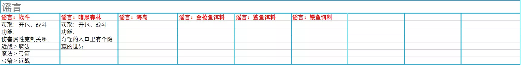 地点(共8条,与海岛版本完全一致,本条略过) 鱼(共5条,与海岛版本完全一致,本条略过) 谣言(共6条,在海岛版本4条的基础上新增2条)
