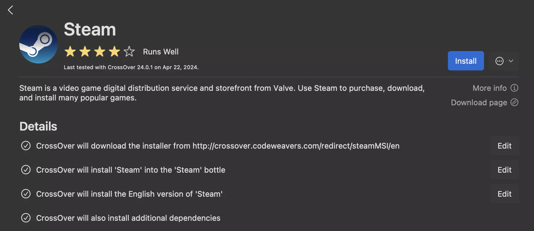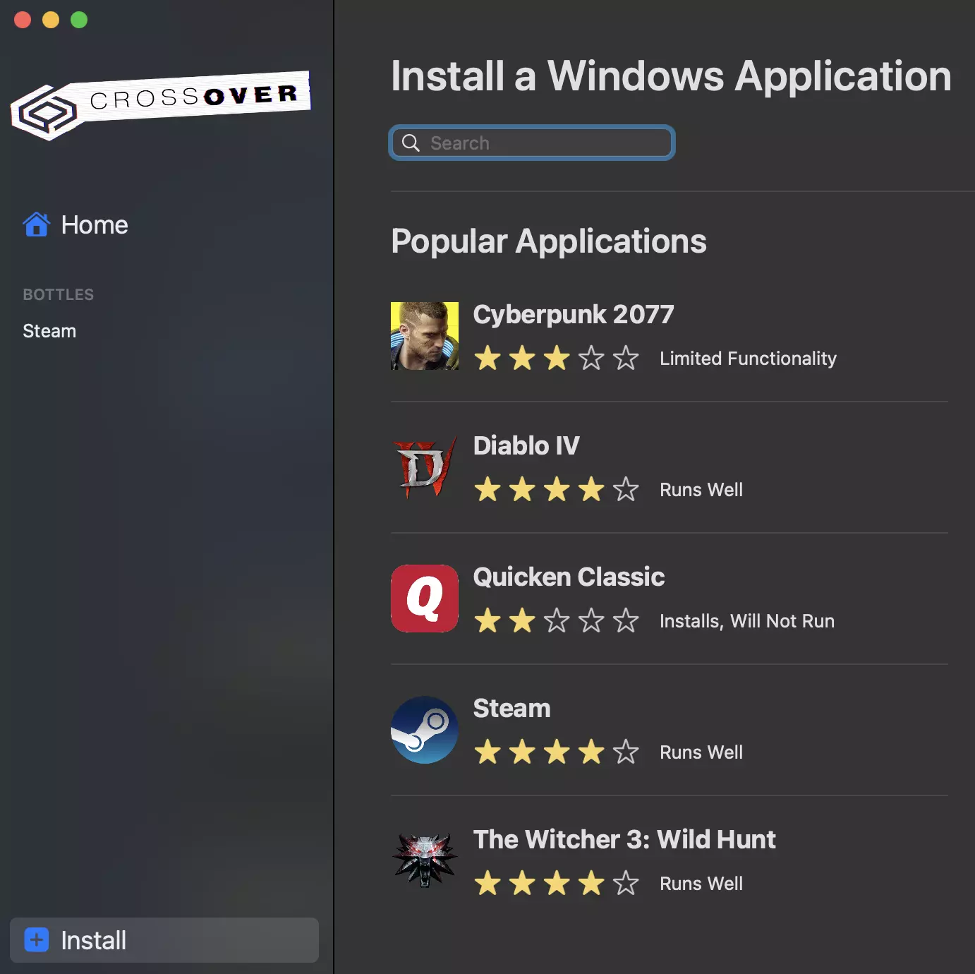 CrossOver是一款帮助Windows程序在macOS上运行的兼容层。它使用了许多与Valve的Steam Deck相同的技术,因此许多与Steam Deck(或一般Linux系统)兼容的游戏也能在这里运行。 并非所有Steam Deck能运行的游戏都能在CrossOver上运行,因为它们并非完全相同,但得益于兼容层的一些技术以及苹果的优化,它为许多并非专门为macOS开发的游戏打开了大门! 性能不会与原生游戏相同,但M1和M3芯片的Mac能够良好地运行游戏。 技术宅专区(可跳过直接查看使用说明!) CrossOver是一个基于Wine的兼容层。一个旨在直接从内核或其他区域将不同调用转换为操作系统各自调用的完整环境。Steam Deck使用名为Proton的增强版Wine,它包含更多针对游戏的特定调整。 在Linux系统上,Proton负责将DirectX调用转换为Vulkan。在macOS系统上,CrossOver则将DirectX转换为Metal。在这两种情况下,都会进行转换,且性能表现各不相同。在Linux上,图形转换通常不会对性能造成太大影响(有时甚至会运行得更快);而在macOS上,由于尚处于开发初期,情况则好坏参半。存在转换层的原因是苹果开发它以帮助开发者将其游戏移植到macOS系统。游戏移植工具包是CrossOver用于最终显示图形的转换层。在Rosetta转换层之上,这意味着一层叠一层,再加上另一层才能最终运行游戏。其性能不如将游戏原生移植到ARM和Metal平台高效。尽管如此,M1和M3芯片的Mac能够很好地运行游戏。哦对了,这款游戏基于虚幻引擎运行。需要购买CrossOver吗?是的,但你可以免费试用该应用14天。CrossOver的开发商CodeWeavers甚至建议先试用,确保你想运行的应用能在目标Mac上有效工作后再购买。本教程利用14天试用版,模拟新用户首次通过CrossOver安装《灵都》的体验。 支持哪些Mac设备? 目前已测试且可正常运行的是搭载Apple silicon的M1和M3 Mac。(感谢Discord用户ladymix对M1机型的测试!) 一台2019年的英特尔酷睿i5 MacBook Pro也进行了测试,但无法通过加载界面。在这台英特尔Mac上启动游戏时,会弹出显示“未知错误!”的新窗口。 考虑到M1和M3 MacBook已测试可用,M2系列Mac能够运行也不足为奇。 M3机型的性能表现可以充分发挥应用潜力。在较低分辨率下,应用可在120Hz显示屏上以满帧率运行。如果应用处于全屏模式,帧率会略有下降,但可以利用显示器的完整分辨率,从而获得整体非常清晰的图像。 操作步骤: 1. 安装CrossOver 提供14天试用。输入电子邮箱和姓名后,网站将开始下载该应用。打开压缩文件,将应用移至应用程序文件夹,双击即可启动! 2. 从待安装的Windows应用列表中选择Steam