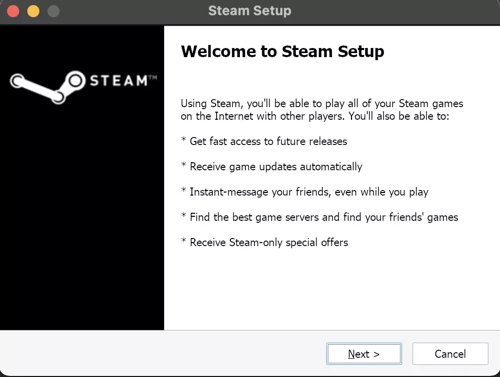 Steam 将会弹出安装提示,以及在 Steam 自身安装过程中的其他提示。所有步骤都选择“下一步”并安装 Steam。 关闭 Steam!你需要进行一些设置调整。