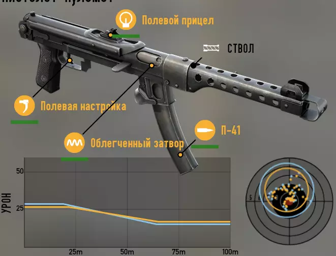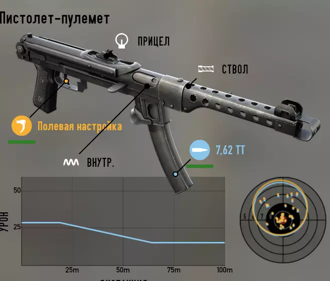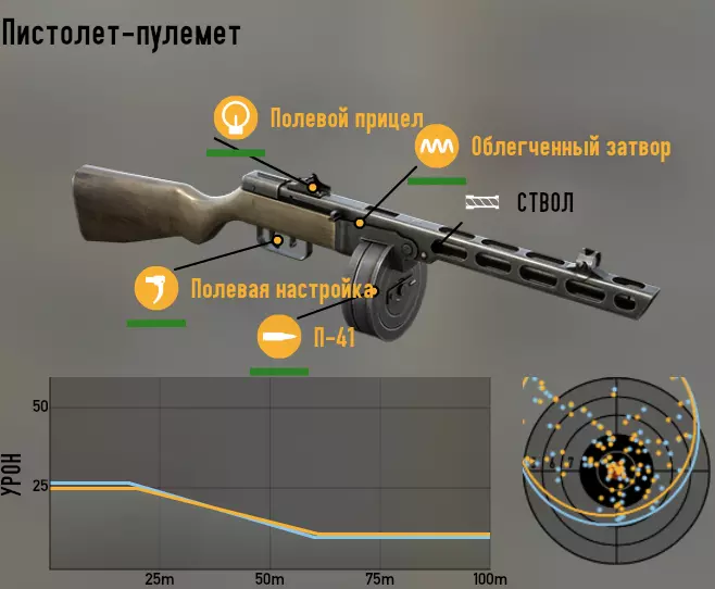 苏联 我们从冲锋枪开始。 PPSh(波波沙) 第一种配装方案:此配装旨在高效消灭敌方有生力量。它具备高射速,同时拥有良好的稳定性,两者结合使我们在低散布的情况下获得出色的每秒伤害。需要注意的是,无法用它来刷资源,它的弹药消耗非常大。