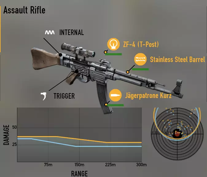 由于这款游戏的玩家经常询问,为了特定目的应该给武器搭配什么样的配件,我决定制作一份全武器配件搭配指南。好在我既有相关经验,也对这款游戏有深入了解,所以我的建议或许能有一定的参考价值。 德国 我们从突击步枪开始 STG-44 第一种搭配——这把武器的基础搭配。可以进行快速装填,但商店内弹药数量充足,无需频繁装填。