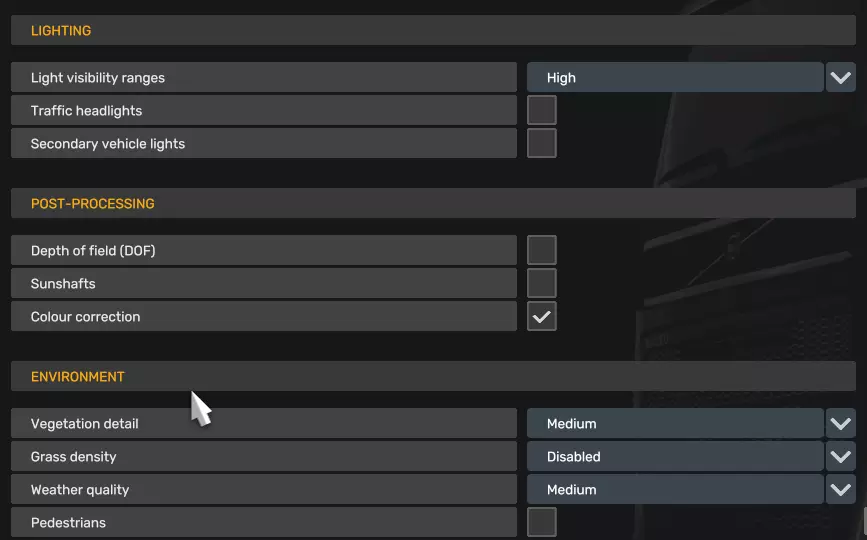 Resolution needs to be as low as possible or should be disabled though mirror mode! in config.ini - uset r_manual_stereo_mirror_mode "0" Optional (1): Consider increasing the graphical fidelity of mirrors by raising the mirror settings to "Medium." This change result in enhanced mirror visual quality but lead to more FPS drops, depending on the area and traffic conditions. Increase value with care! Optional (2): Lowering vegetation detail from Medium to Low will improve overall FPS performance, as fewer objects are rendered as the simplified trees (appearing almost in 2D) reduce CPU load. CONFIG.INI: Location: Documents Euro Truck Simulator 2 config.cfg uset o_openxr_threaded_submit "0" <- Disabled as threaded submission can cause stability issues. For Meta quest devices use uset o_oculus_threaded_submit "0" uset t_ignore_hmd_timing "1" <-- works great with turbo mode in OpenXR uset g_traffic ="0.5" <-- this will reduce the amount of traffic uset t_averaging_window_duration "0" uset t_averaging_window_length "0" uset r_buffer_page_size "50" <-- May reduce texture pop-ins and improve the smoothness of texture loading. Uses more VRAM. r_sun_shadow_texture_size "512" <-- decreases the texture size. Still looks oke. Optional to greatly increase pixel densityn(less jittery): uset r_manual_stereo_buffer_scale "1.4" <-- read below The default value is 1.0, but I find that 1.4 strikes a good balance between performance and quality. However, this can vary based on your GPU. I recommend adjusting it gradually, starting with 1.1 and increasing .1 from there. STEAM COMMAND-LINE: -openxr -nointro <-- for OpenXR devices -oculus -nointro <-- for Meta quest devices Or when using traffic mods (see Mods section): -openxr -nointro -mm_pool_size 16384 -mm_max_resource_size 50 -mm_max_tmp_buffers_size 1000 <-- for OpenXR devices -oculus -nointro -mm_pool_size 16384 -mm_max_resource_size 50 -mm_max_tmp_buffers_size 1000 <-- for Meta quest devices Please note that the recommended mm_pool size should be set to half of your available RAM. in my case, 16GB for a system with 32GB of RAM. These settings can help boost performance and reduce noticeable stuttering when using traffic mods. If you're not using any traffic mods, there's no need to enable it. VIDEOCARD Settings: NVIDIA 3D Settings: Anisotropic Filtering: 16X Texture Filtering - Anistropic Sample Option: On Texture Filtering - Quality to Quality Texture Filtering - Negative LOD Bias to Clamp Texture Filtering - Anisotropic Sample Optimalization to Enabled Virtual Reality prerendered frames: 2 <-- Can improve performance and frame rates but may increase latency. Test with both values (1 and 2) and see what works best for your setup. Disable FXAA Enable Antialiasing Gamma Correction RADION Software: Anisotropic Filtering: Set to 16X (Go to Graphics > Texture Filtering Quality, and set Anisotropic Filtering to 16X) Texture Filtering Quality: Set to High Set Wait for Vertical Refresh to Always Off FXAA: Disable (Go to Anti-Aliasing > Anti-Aliasing Method, and set it to Multisampling or None to disable FXAA) OpenXR Toolkit: This software provides a collection of useful features to customize and improve existing OpenXR applications, including render upscaling and sharpening, foveated rendering, image post-processing and other game-enhancing tweaks. However, as of 2024, support for OpenXR Toolkit is discontinued but still works. Enable upscaling using CAS on 80% Turbo mode: On (It appears to work correctly only with OpenXR Windows Runtime, not via SteamVR/Steam OpenXR) Optional Configurations Draw distance - Optional, but not recommended The draw distance in the horizon such as mountains are hard-coded into the game engine and cannot be changed. You can improve the Level of Detail (LOD) for traffic and parked vehicles by increasing the corresponding value in your configuration file. However, I haven’t tested the impact on performance, so proceed with caution and only adjust after extended testing without these settings enabled. uset g_lod_factor_parked "2.0" <-- parked cars uset g_lod_factor_traffic "2.0" <-- AI traffic (adjust between 1.1 and 3.0 as 1.0 is the default value) The following settings will adjust the Level of Detail (LOD) for trees, grass (note: grass is disabled in this guide!) and falling leaves. Increasing these values will put more load on the GPU and may lower frame rates. Do not use these settings if you are using ProMods. First lod class is for trees, the second lod class for grass (detail vegetation). Requires adjustment in game_data.sii I can create mods if people are interested, the includes below values. Let me know in the comments. Low Systems leaves_lod_start: (140.0, 110.0, 50.0) leaves_lod_end: (200.0, 160.0, 100.0) Default systems leaves_lod_start: (240.0, 410.0, 50.0) leaves_lod_end: (300.0, 460.0, 100.0) High system leaves_lod_start: (510.0, 610.0, 50.0) leaves_lod_end: (570.0, 660.0, 100.0) Ultra systems leaves_lod_start: (610.0, 710.0, 50.0) leaves_lod_end: (670.0, 760.0, 100.0) Mods in Use Warning: Avoid using ProMods or any other external map mods. These mods often introduce a large number of additional objects, resulting in significant FPS drops, sometimes as much as 30% or more. For the best performance and experience, it's recommended to stick with the vanilla version of the game. If you still choose to use ProMods, be aware of the huge impact on your FPS, depending on the area you are. https://steamcommunity.com/sharedfiles/filedetails/?id=3270559825 https://steamcommunity.com/sharedfiles/filedetails/?id=2942906812 https://steamcommunity.com/sharedfiles/filedetails/?id=1236032431 https://steamcommunity.com/sharedfiles/filedetails/?id=2877653830 https://steamcommunity.com/sharedfiles/filedetails/?id=774384307 Final Note Before you can determine if these settings work for you, you need to drive for at least an hour in various locations. You still experience FPS drops near and in cities, but they should occur less frequentl