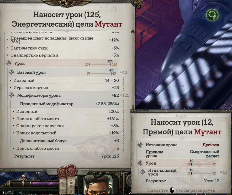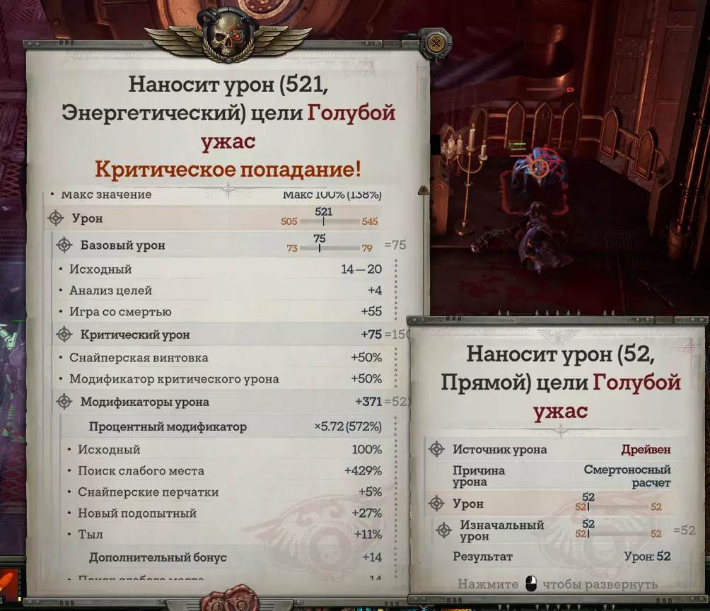 ур. 18 Смертоносный расчет. Получаем 10% к конечному урону и прямой урон для работы некоторых навыков архетипа. ур. 20 Восприятие. ур. 21 Усиление летальности. Восприятие. ур. 22 Шепот смерти. Бесплатная атака со штрафом к урону 75%. Используется как дебафф по основной цели или для ваншота тонких противников. Штраф применяется в виде вычитания, а не деления, поэтому любые процентные бонусы к урону его нивелируют. ур. 23 Вестник гибели. Снижаем броню и уклонения нашей основной цели, применяя к ней Шепот смерти. ур. 24 Дальний бой, Мастерство х. Восприятие (для Ирлиет) и Запасная обойма (для ВТ). ур. 25 Новая жертва. Получаем бонус к снижению уклонения против нашей основной цели, применяя к ней Шепот смерти. ур. 26 Дальний бой. ур. 27 Второй вариант на доп. урон. Не используем ульту, т.к Игра со смертью всегда сильнее. ур. 28 Никакого сопротивления. Мастерство х. Дальний бой (для Ирлиет) и Верить изо всех сил (для ВТ). НС немного увеличит нашу летальность по цели Шепота смерти. ур. 29 Интеллект. ур. 30 Позиция для атаки. Срезает защиту основной цели и дает нам снижение уклонения для летальности. ур. 31 Мастерство х. Интеллект (для Ирлиет) и Ожидаемый итог (для ВТ). Чутье профессионала. ОД мы тратим много, а с этой способностью можем 1 раз за ход бесплатно использовать Позицию для атаки. ур. 32 Знания: Ксеносы (для ВТ). Понадобится для взятия навыка: Обращение с эльдарским оружием. ур. 33 Безупречный выпад, Интеллект. ур. 34 Мастерство х. Ловкость (Ирлиет) и Обращение с эльдарским оружием (для ВТ) Примерно на 33 уровне мы заканчиваем 2 главу и на сюжетной торжественной церемонии получаем в подарок от другого Вольного торговца уникальную эльдарскую винтовку Око Гекатона (она с нами надолго). ур. 35 Третий вариант на доп. здоровье. Ротация снайпера-ассасина 35 уровня на основной ход: Идеальная позиция (1 ОД). Позиция для атаки (0-1 ОД). Анализ цели (1 ОД). Выявление слабостей (0 ОД). Надежный план (0 ОД). Шепот смерти (0 ОД). Поиск слабого места (1 ОД). Выверенная атака (1 ОД). Игра со смертью (1 ОД). Неотвратимый взгляд (Ирлиет) (1 ОД). В третьем архетипе ничего жизненно необходимого не добавится, но мы получим три полезных способности, которые не взяли ранее из-за недостатка ячеек, а так же несколько пассивок на урон и уклонение, которое сможем перевести в крит шанс и крит урон со спец. талантом Гранд-магистра. Прокачка расписана для Вольного торговца. Ирлиет добавляем недостающие способности из первого архетипа вместо новых из билда, которые у нее уже есть, а в ячейки универсальных талантов ставим оставшиеся усиления врожденной способности Неотвратимый взгляд. ур. 36 Искусство прицеливания. Совместный анализ ур. 37 Летальная точность. ур. 38 Восприятие. Мастерство х. Ловкость. ур. 39 Понимание тактики. Используем на неосновные цели для получения прибавки к урону. ур. 40 Убийственная точность. Рассчитать удар. ур. 41 Восприятие. Улучшенная тактика. ур. 42 Пляска смерти. Дальний бой. Не считается движением. Позволяет снайперу дважды за ход переместится, не теряя Идеальную позицию и усиления от экипировки. ур. 43 Уловка. Проворство. ур. 44 Критическое усиление. ур. 46 Новый подопытный ур. 47 Точность во всем. ур. 48 Неизбежный крах. Дальний бой. ур. 49 Интеллект. ур. 50 Все и сразу. Подлинный эксперт. ур. 51 Одиночка. ур. 52 Расчет траектории. Осторожный план. С навыком используем Надежный план перед перемещениями, а не перед выстрелам