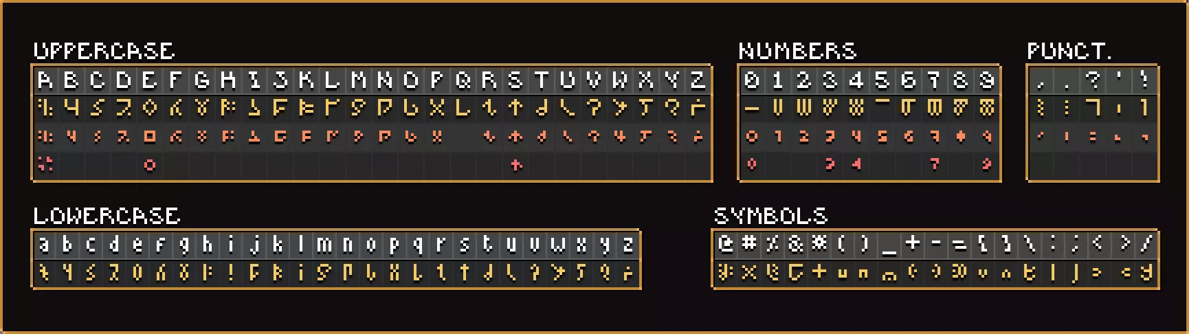 普通符文在游戏中非常常见,可在翡翠石板、圣山、希西基地、友谊房间、祭坛等地找到。它们可以直接一对一翻译成英文。