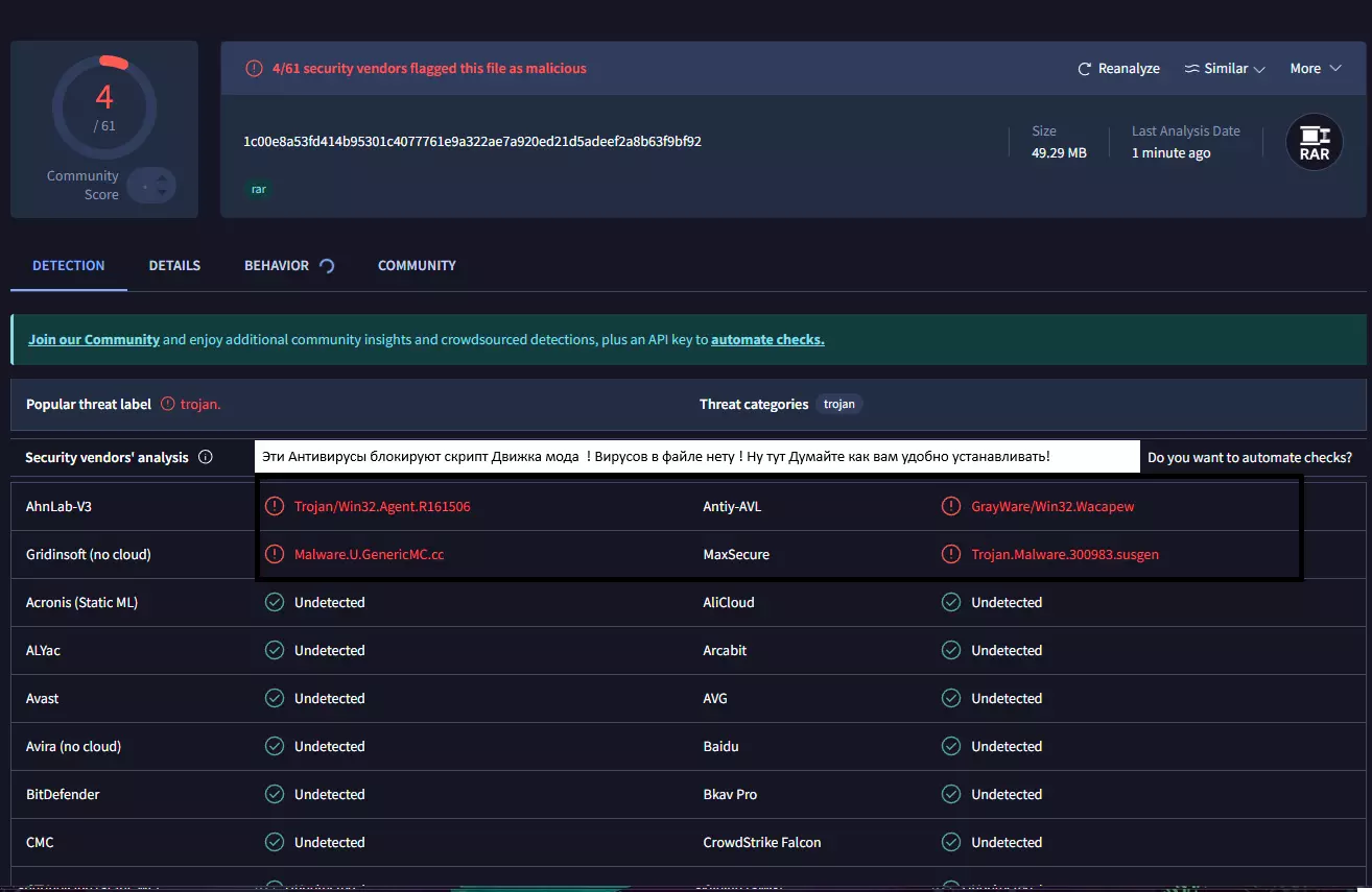 在检查文件压缩包时,两个新的杀毒软件将引擎系统文件识别为病毒,而这些实际上是模组引擎的文件配置。已批准 - playground.ru