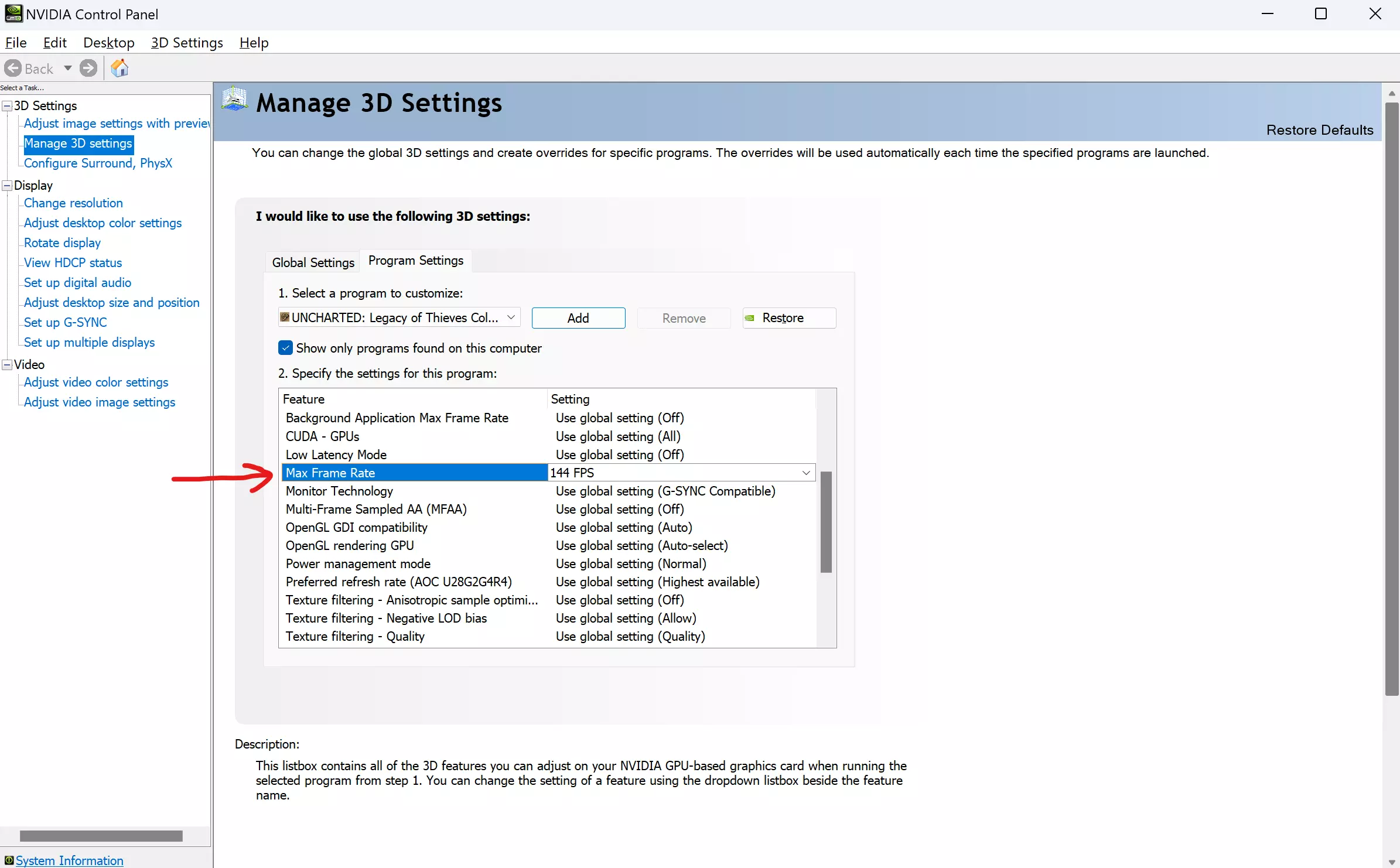 进入3D参数设置,切换到应用程序设置选项卡,在那里选择【神秘海域】。如果找不到,点击右侧的添加按钮,那里会显示最近运行的应用程序。如果仍然没有【神秘海域】,尝试启动并关闭游戏,然后再次尝试在那里找到它。