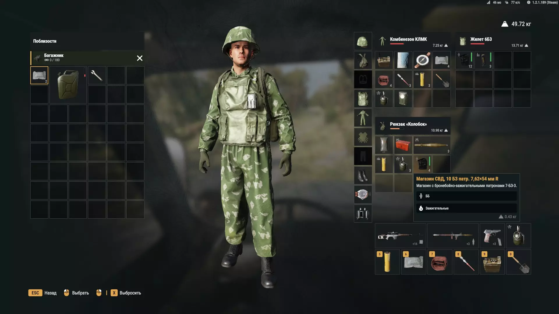 德拉贡诺夫狙击步枪 我已经多次提及SVD,但这里我会详细说明最重要的部分。 这是最好的狙击步枪,具有强大的杀伤力、高精度和快速的射速。配备4倍固定瞄准镜,带有照明功能和以100米为单位的距离调节。 它最令人满意的地方在于其穿甲燃烧弹,能对敌方载具造成严重伤害。可惜SVD在提前射击和移动目标射击方面都比M14差,一个弹匣就让UAZ冒起了烟。