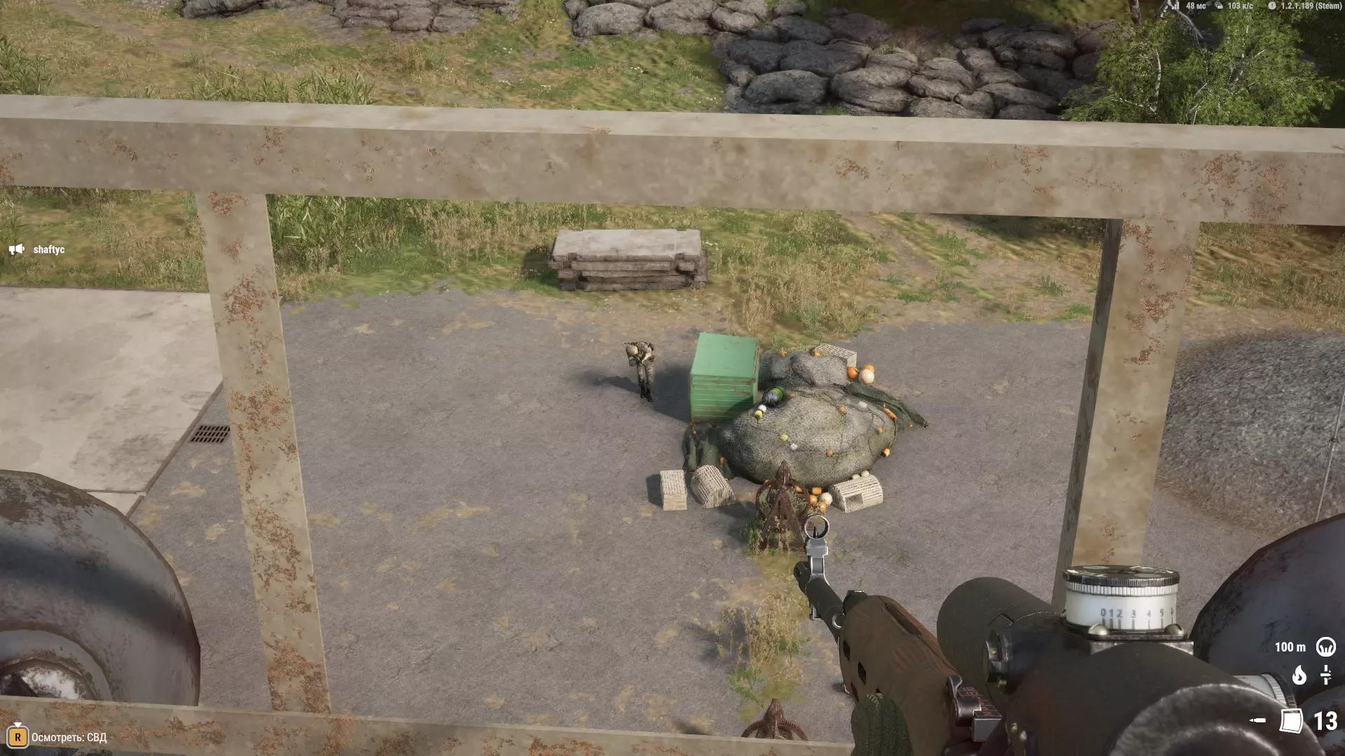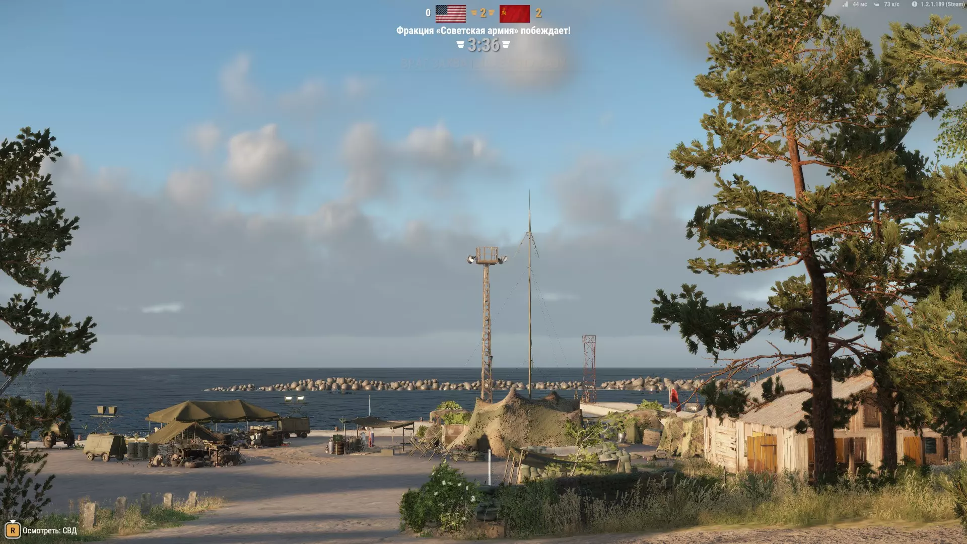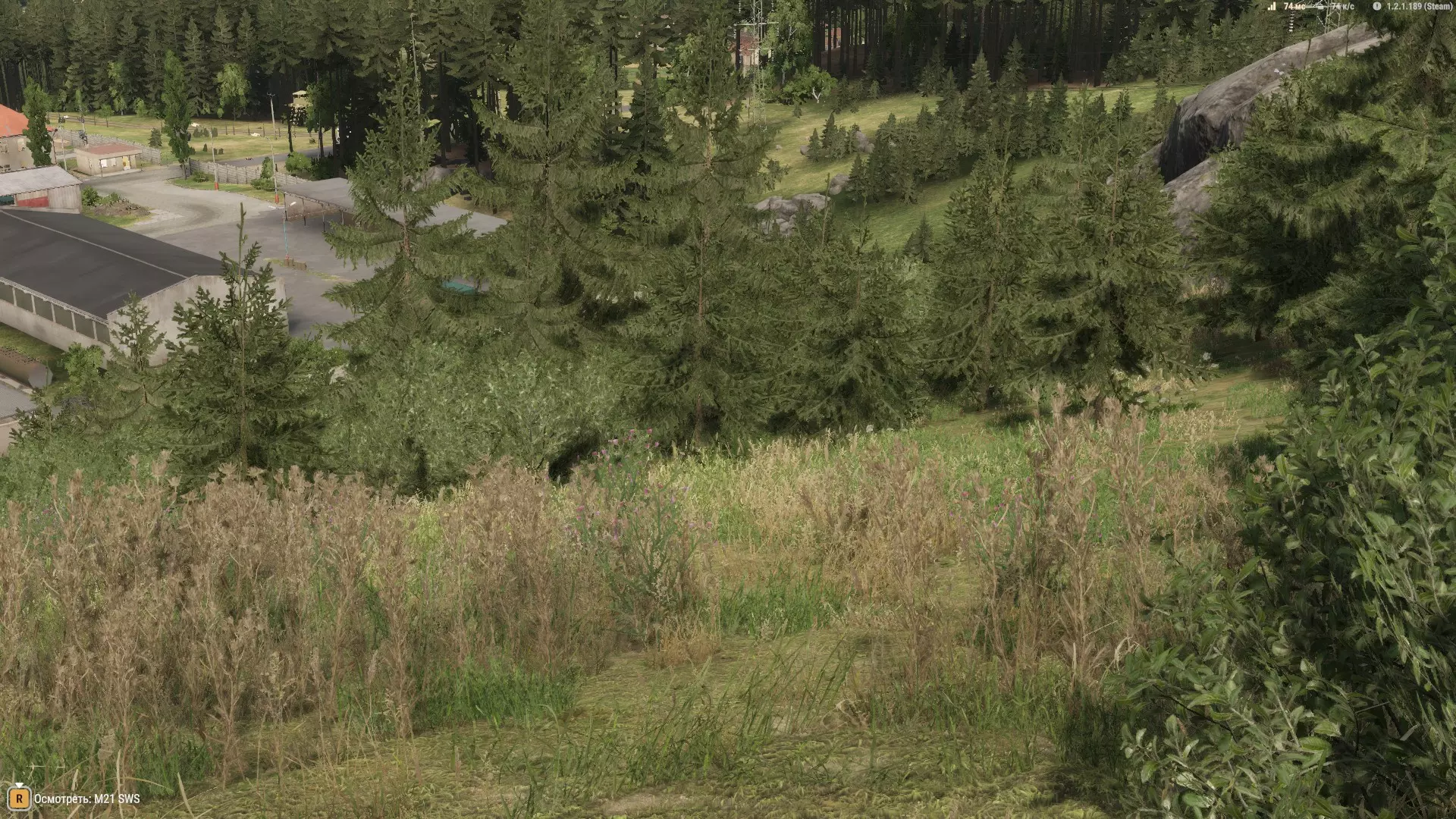 它们可以作为临时掩体,或者用来快速穿过,但也就仅此而已。草地比松树更好用。 在这张截图中,我的位置从视野角度来看并非最佳,但特殊的射击角度、大量的灌木丛以及一些遮挡敌人视线的建筑,都让对手很难发现我并向我开火。 拍摄地点——列维的军事基地。我们看到的是:
