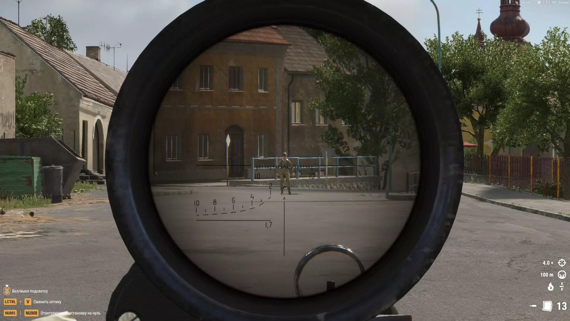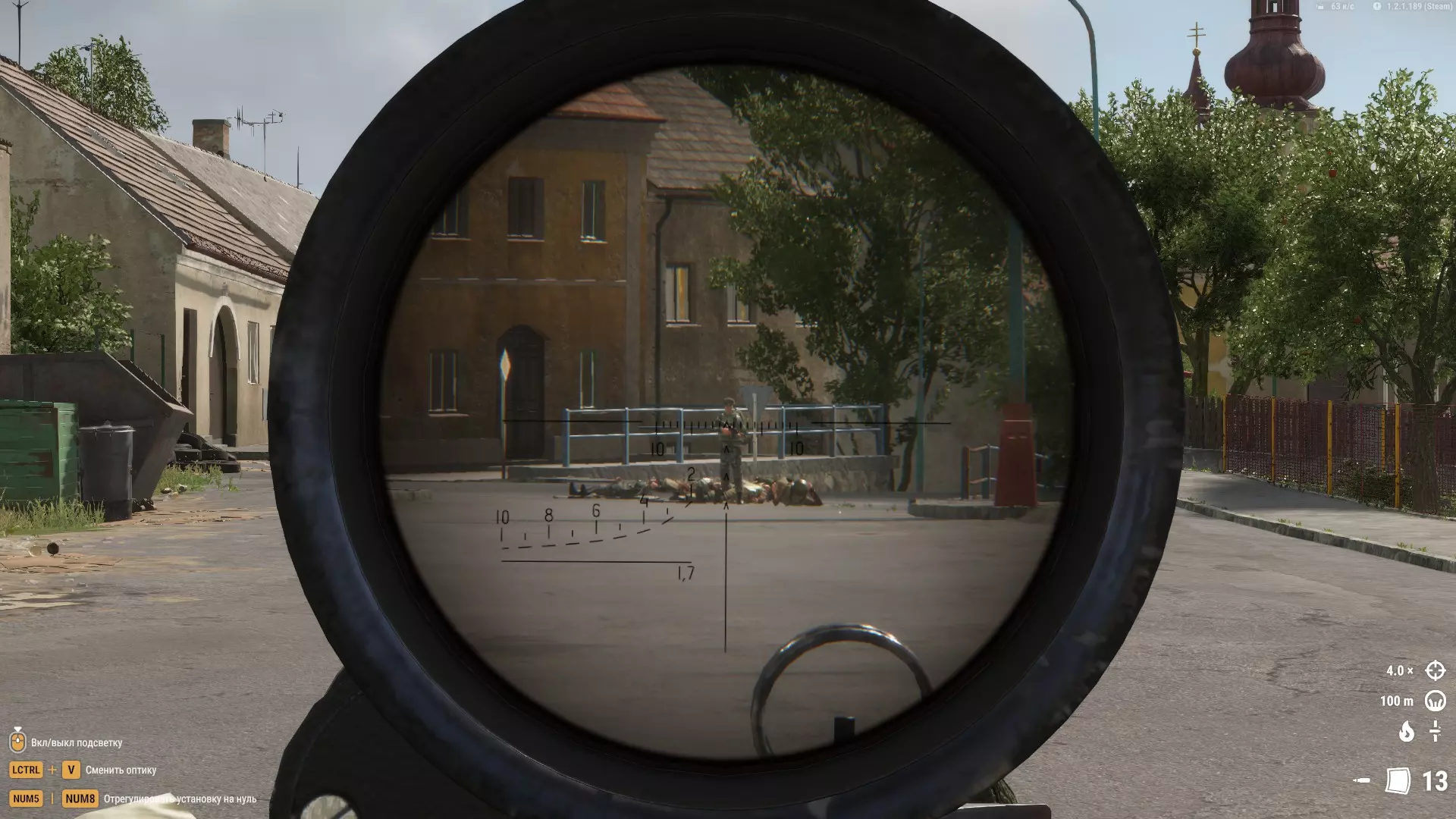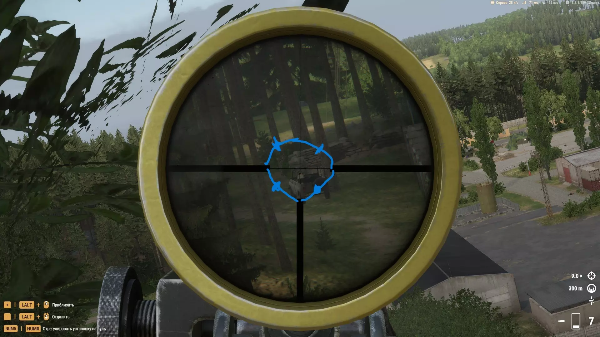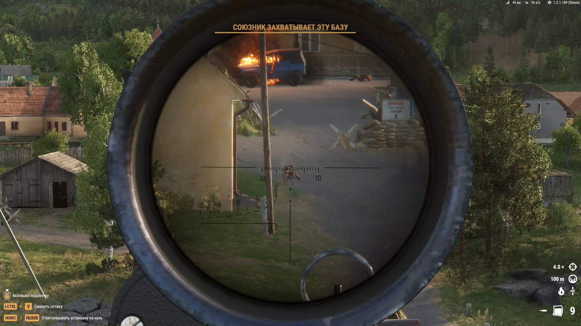 它们可以作为临时掩体,或者用来快速穿过,但也就仅此而已。草地比松树更好用。 在这张截图中,我的位置从视野角度来看并非最佳,但特殊的射击角度、大量的灌木丛以及一些遮挡敌人视线的建筑,都让对手很难发现我并向我开火。 拍摄地点——列维的军事基地。我们看到的是: