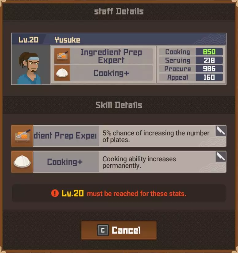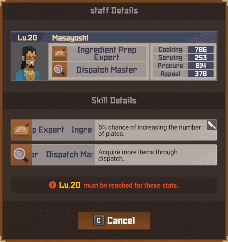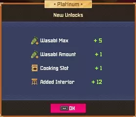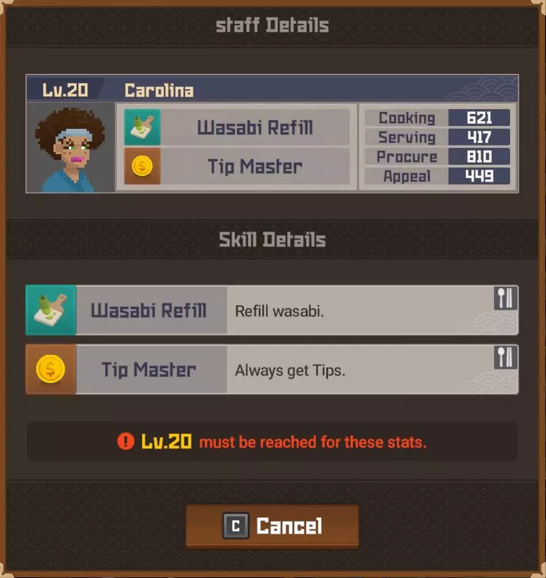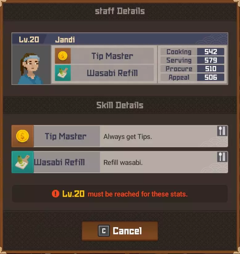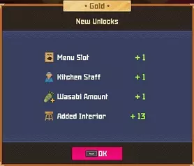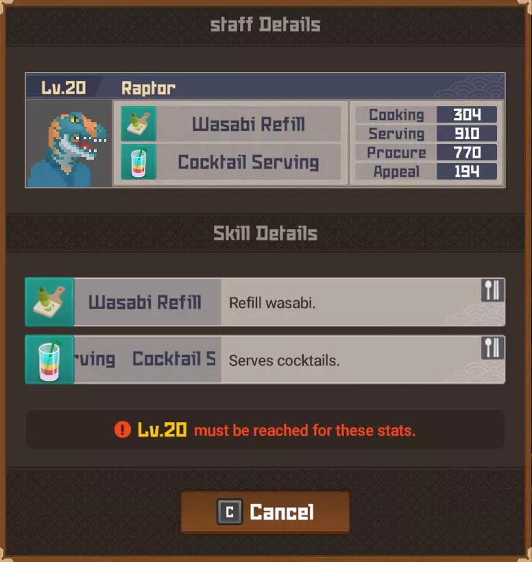 白金 部分夜晚 - 最多25位顾客? 完整夜晚 - 最多35位顾客? 运营成本=2017 分店 分店经理等级 烹饪值0-99=等级4 烹饪值100-149=等级5 烹饪值150-249=等级6 烹饪值250-349=等级7 烹饪值350-449=等级8 烹饪值450以上=等级9 分店星级 1星=最多20位顾客(完整夜晚) 2星=最多24位顾客(完整夜晚)18位(部分夜晚) 3星=最多27位顾客?(完整夜晚)21位(部分夜晚) 4星=最多35位顾客?(完整夜晚) 5星= 【注意:我无法确定分店经理星级基于其属性的计算公式、模式或标准。我对比了多位员工达到2星前后的等级,但完全不清楚其计算方式。】活动夜晚菜单 关于派对夜晚的菜单操作说明:与主寿司吧可以为活动顾客和普通顾客提供同一道菜不同,你的分店仅会向活动顾客提供活动菜品,因此你需要为普通顾客准备另一道菜品。 食谱(铜级) ***剧情解锁***