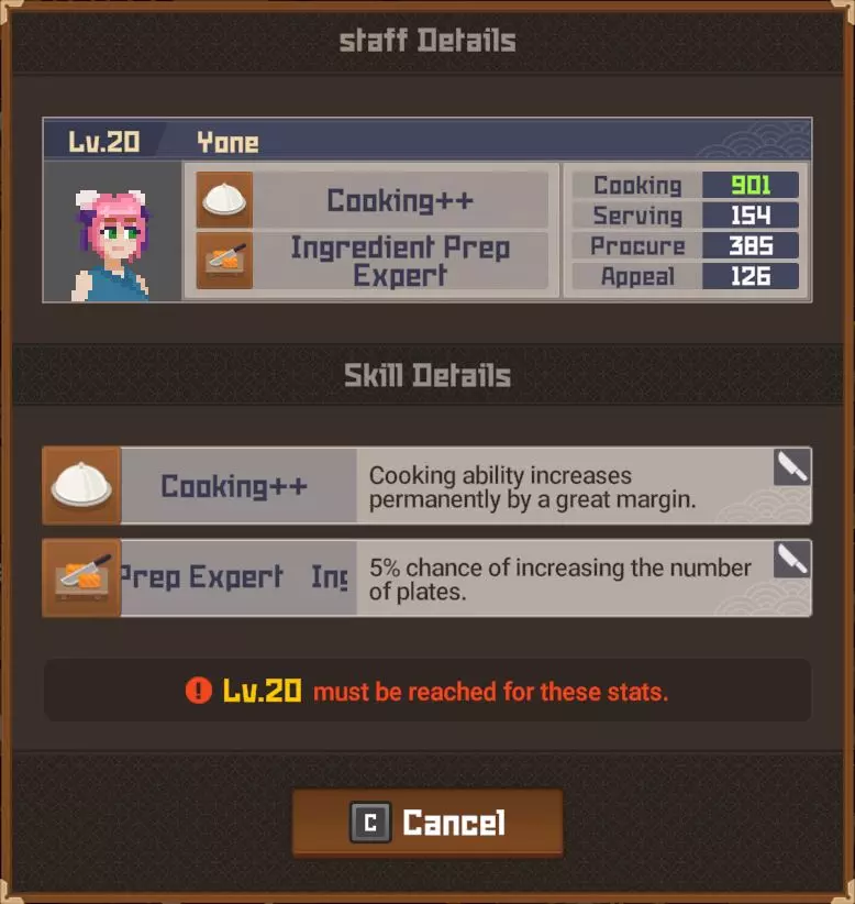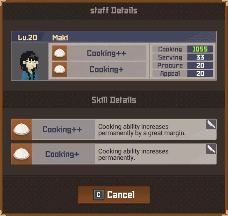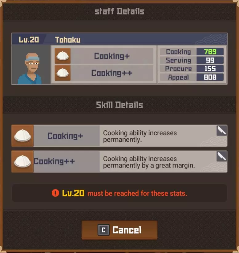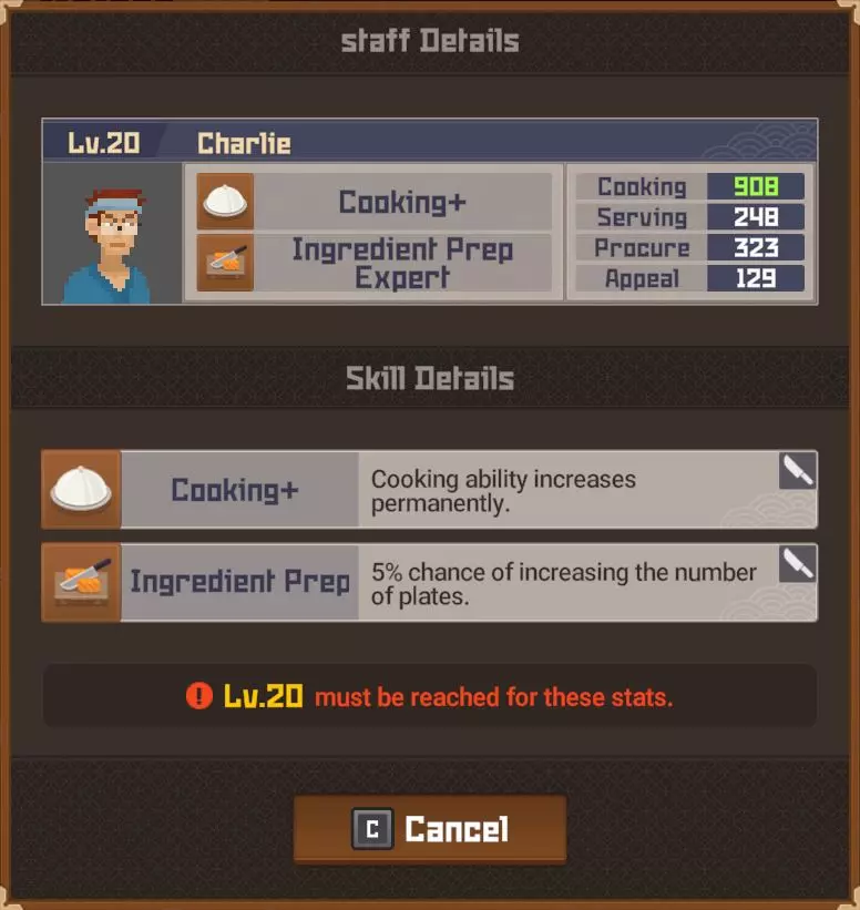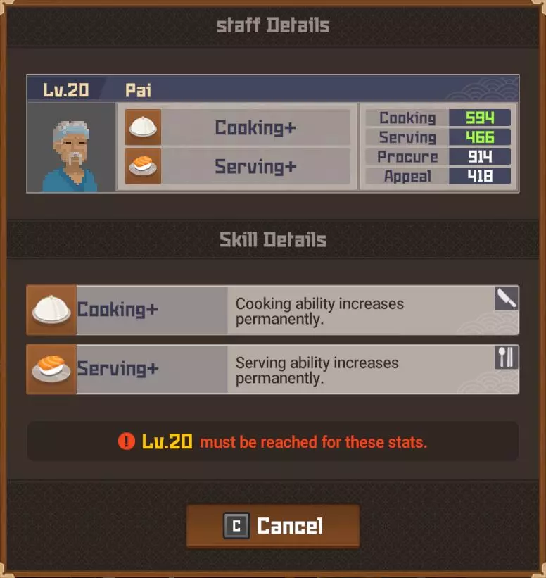 白金 部分夜晚 - 最多25位顾客? 完整夜晚 - 最多35位顾客? 运营成本=2017 分店 分店经理等级 烹饪值0-99=等级4 烹饪值100-149=等级5 烹饪值150-249=等级6 烹饪值250-349=等级7 烹饪值350-449=等级8 烹饪值450以上=等级9 分店星级 1星=最多20位顾客(完整夜晚) 2星=最多24位顾客(完整夜晚)18位(部分夜晚) 3星=最多27位顾客?(完整夜晚)21位(部分夜晚) 4星=最多35位顾客?(完整夜晚) 5星= 【注意:我无法确定分店经理星级基于其属性的计算公式、模式或标准。我对比了多位员工达到2星前后的等级,但完全不清楚其计算方式。】活动夜晚菜单 关于派对夜晚的菜单操作说明:与主寿司吧可以为活动顾客和普通顾客提供同一道菜不同,你的分店仅会向活动顾客提供活动菜品,因此你需要为普通顾客准备另一道菜品。 食谱(铜级) ***剧情解锁***