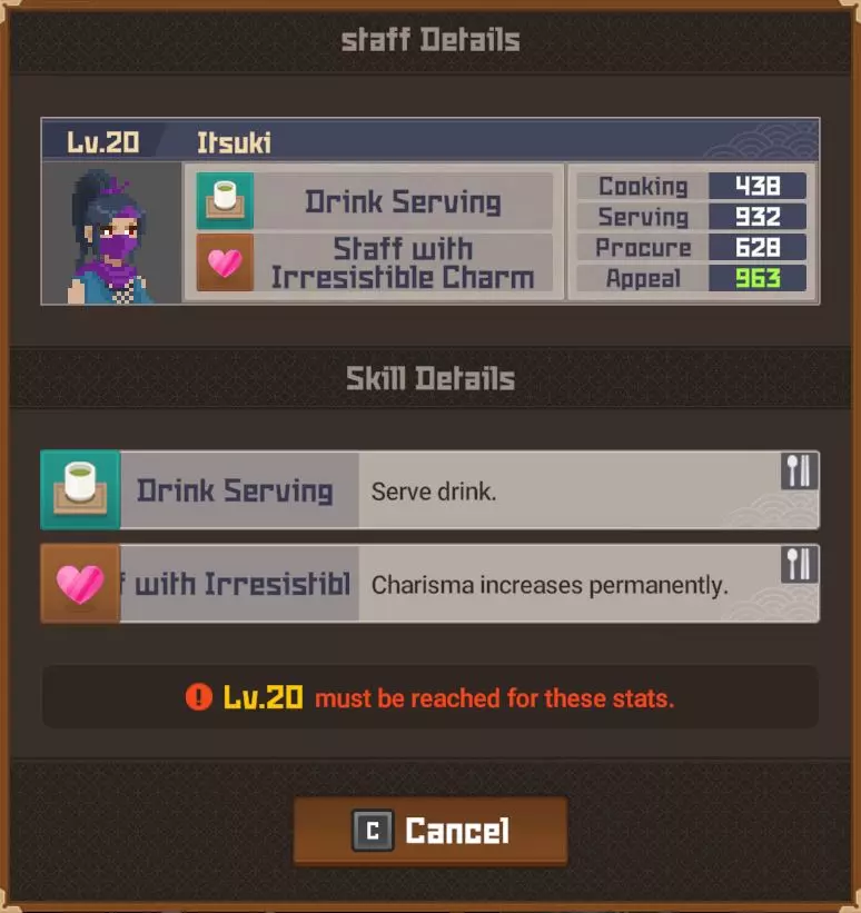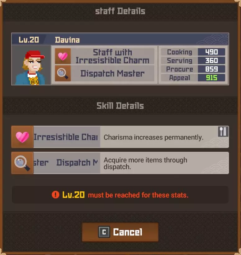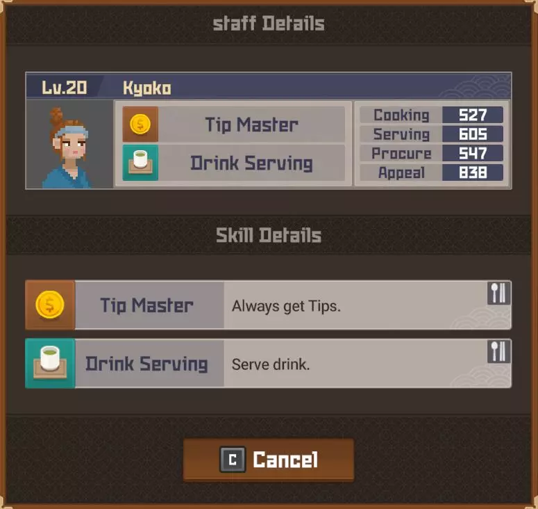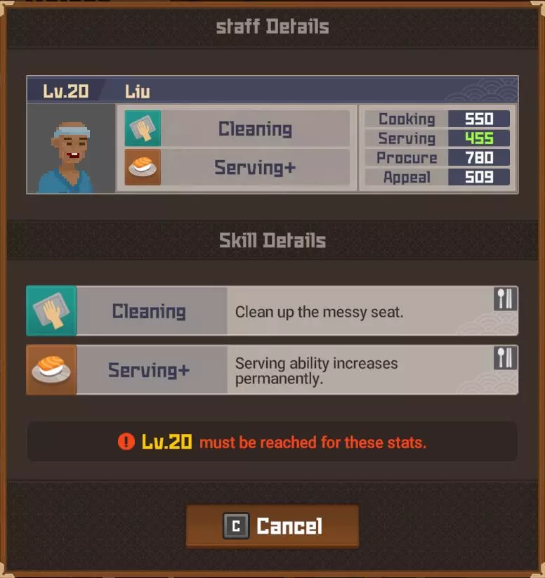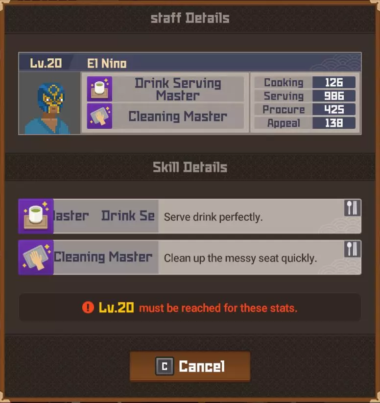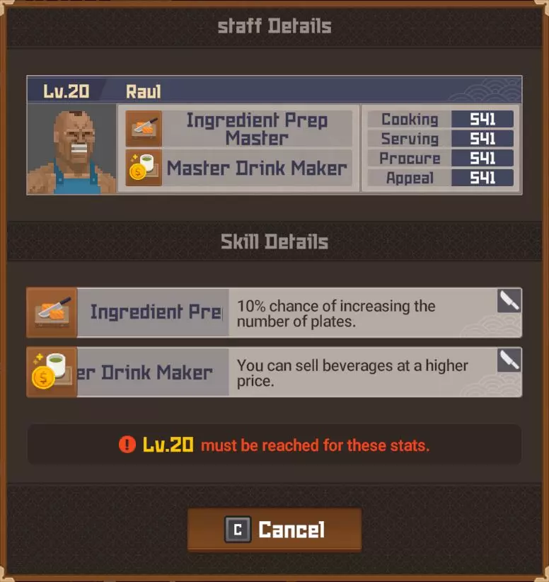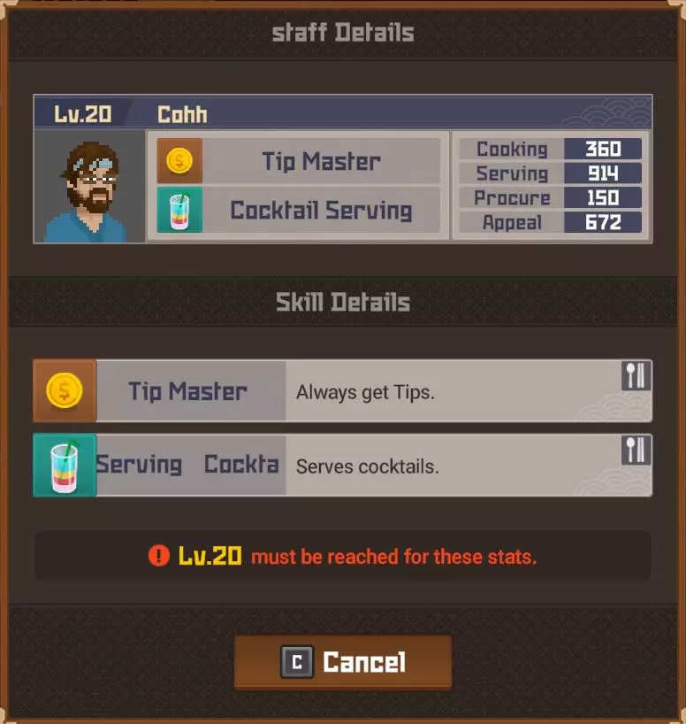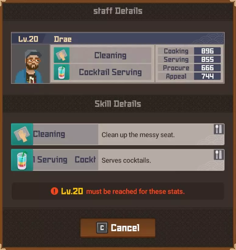 黄金 部分夜晚 - 最多20位顾客 完整夜晚 - 最多28位顾客 运营成本=173 推荐员工等级 - 10(服务员)