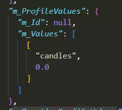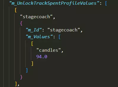现在我们已解锁所有可用物品。我们需要提高通常用于解锁这些物品的蜡烛计数器。在m_Unlocks列表正下方,会有另一个蜡烛数值列表。添加数值前,其显示可能有所不同。要向新存档添加蜡烛计数器,我们需要在蓝色方括号之间添加以下行,就像图片中所示。将光标置于方括号之间,按回车键并粘贴以下内容: [ "candles", 53.0 ] 其中“53.0”是占位符,它会根据列表中的成员而变化。 添加数值后,显示如下: