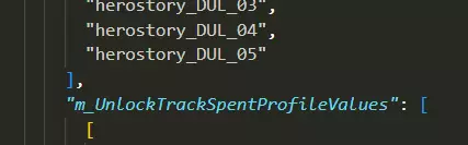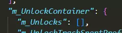 现在,这里有很多内容。由于内容过多,无法在此粘贴。此列表将包含所有已解锁物品,包括驿站马车、战斗、饰品和酒馆物品,以及角色的武器和护甲外观。 接下来,你需要将所有这些行粘贴到图片中所示的m_Unlocks子列表中。请注意,如果末尾有逗号,请将其删除,我已在文件中删除了逗号。粘贴后的效果应如下所示: