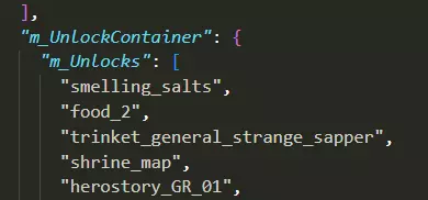在这里,我们可以找到所有角色已解锁的英雄、路线、饰品、驿站马车物品和已解锁的故事。 编辑时间 现在是时候编辑一些部分了。根据你已解锁的内容,你需要做的事情可能会有所不同。其中一些内容我尚未测试,必要时会进行说明。 你需要一个文本编辑器,比如记事本++或Visual Studio,或者其他能够编辑json文件的代码编辑器来编辑这些文件。我两种都试过,虽然我对此了解不多,但使用这些工具应该不会有问题。我推荐记事本++,因为它是一个小巧的程序。 免责声明:存档编辑本身具有风险!请备份你要编辑的文件,以便在出错时撤销操作。请务必小心。本指南假设你已安装【THE BINDING BLADE】DLC!如果你未安装该DLC,我不确定会发生什么。请尝试跳过与DLC相关的内容,以避免损坏存档。 添加技能 本节将说明如何为已解锁的英雄添加技能。如果你尚未解锁某个英雄却添加了他们的技能,这并不会解锁该英雄。(你可以在后续章节中找到解锁方法。) 要添加技能,我们需要找到“m_UnlockContainer”部分。它看起来如下: