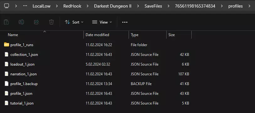 打开以下文件夹:LocalLow > RedHook > 暗黑地牢2 > SaveFiles > 【数字】 > profiles 在此处,我们将编辑【profile_1.json】文件。该文件的名称取决于你创建存档的顺序,【profile_1.json】是你创建的第一个存档的名称。以下是我系统中的文件示例: