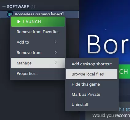 要找到游戏或Borderless Gaming的位置,请进入库,右键点击该项目,选择管理,然后选择浏览本地文件选项。