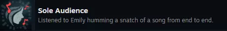 还有一个成就,需要完整听完艾米丽的歌曲。歌曲的时间段为00:00-00:38、03:55-04:32