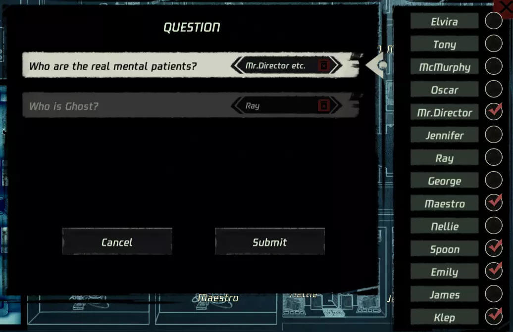第一个结局 | 幻想 进入这个房间后,点击自己(下方的人物),选择68号,然后点击回答