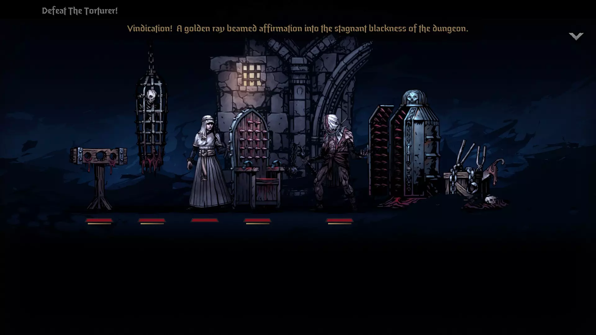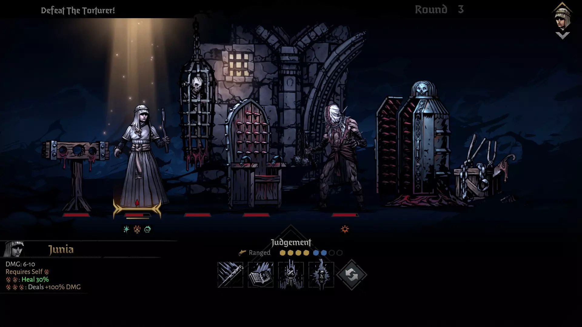 “当修道院院长将她拖向地牢时,她惊恐的哭嚎在教堂的耳堂间回荡。作为对会众的警示,她所受的惩罚将远超其亵渎神明之罪。被无尽地锁在腐烂的黑暗中,她一边承受着愤怒仆人的凡人折磨,一边等待着神的报应。” 第四章:神之干预 目标:击败拷问者! 这个考验对某些人来说可能看似困难,如果你不能迅速理解其本质的话。所以,你的任务是运用你的一系列能力和战场特征来击败拷问者。 拷问者对你造成沉重打击并使你流血。你的基础技能造成的伤害很低,治疗效果也微乎其微。那么,如何赢得这场战斗呢?