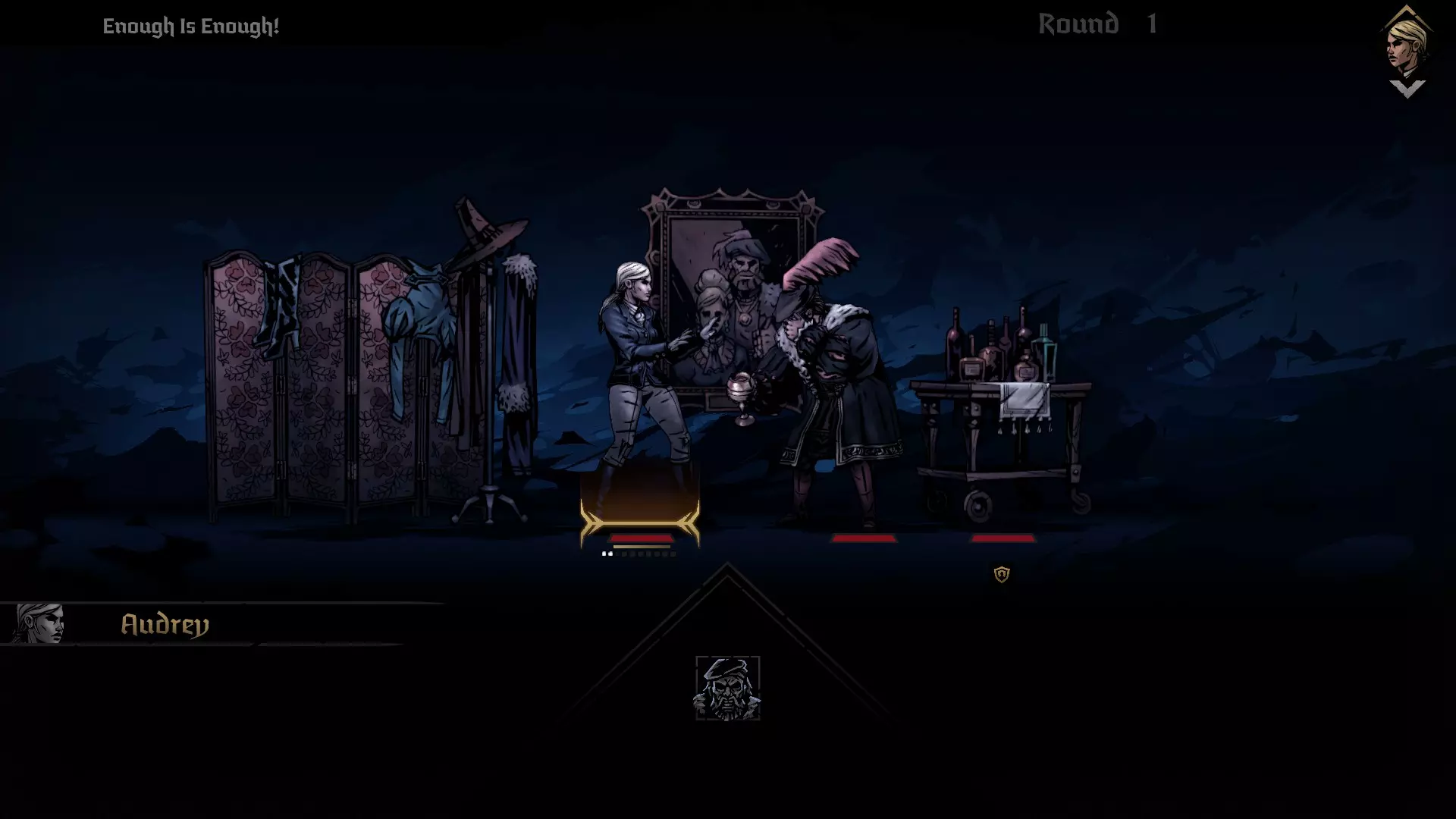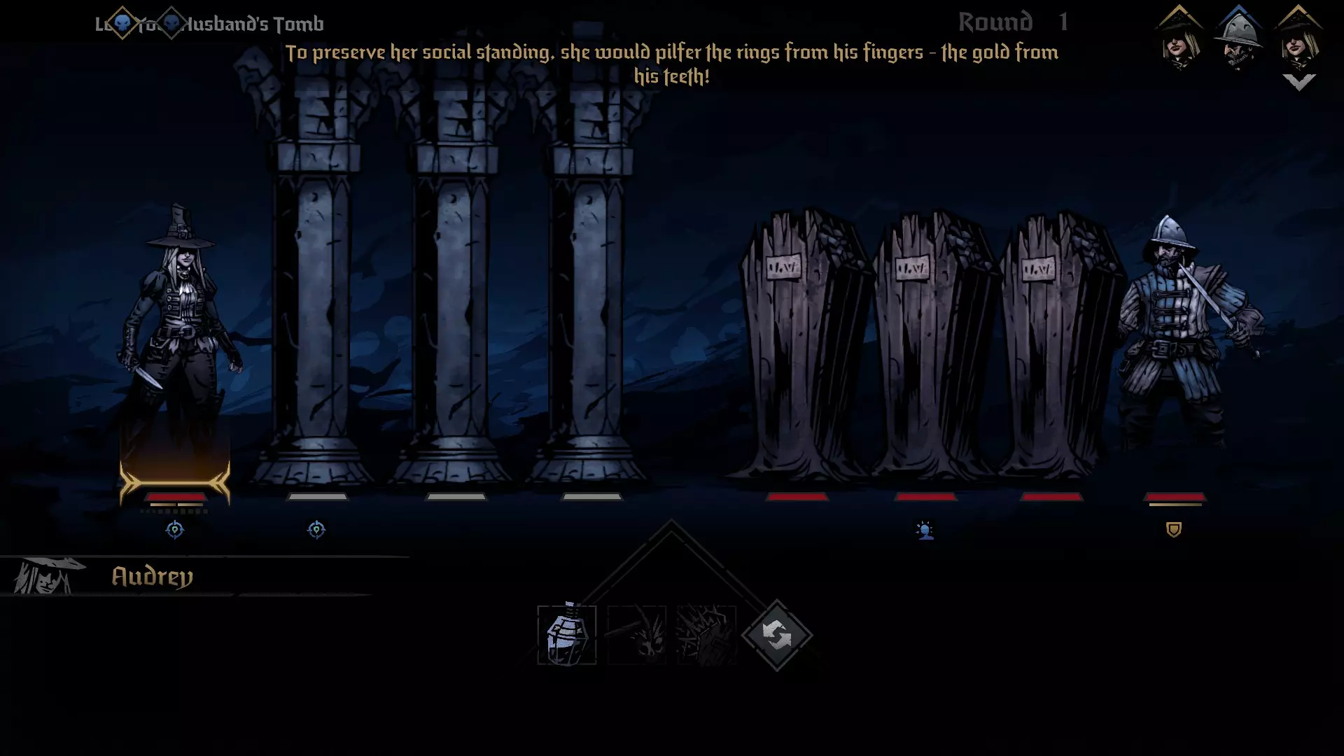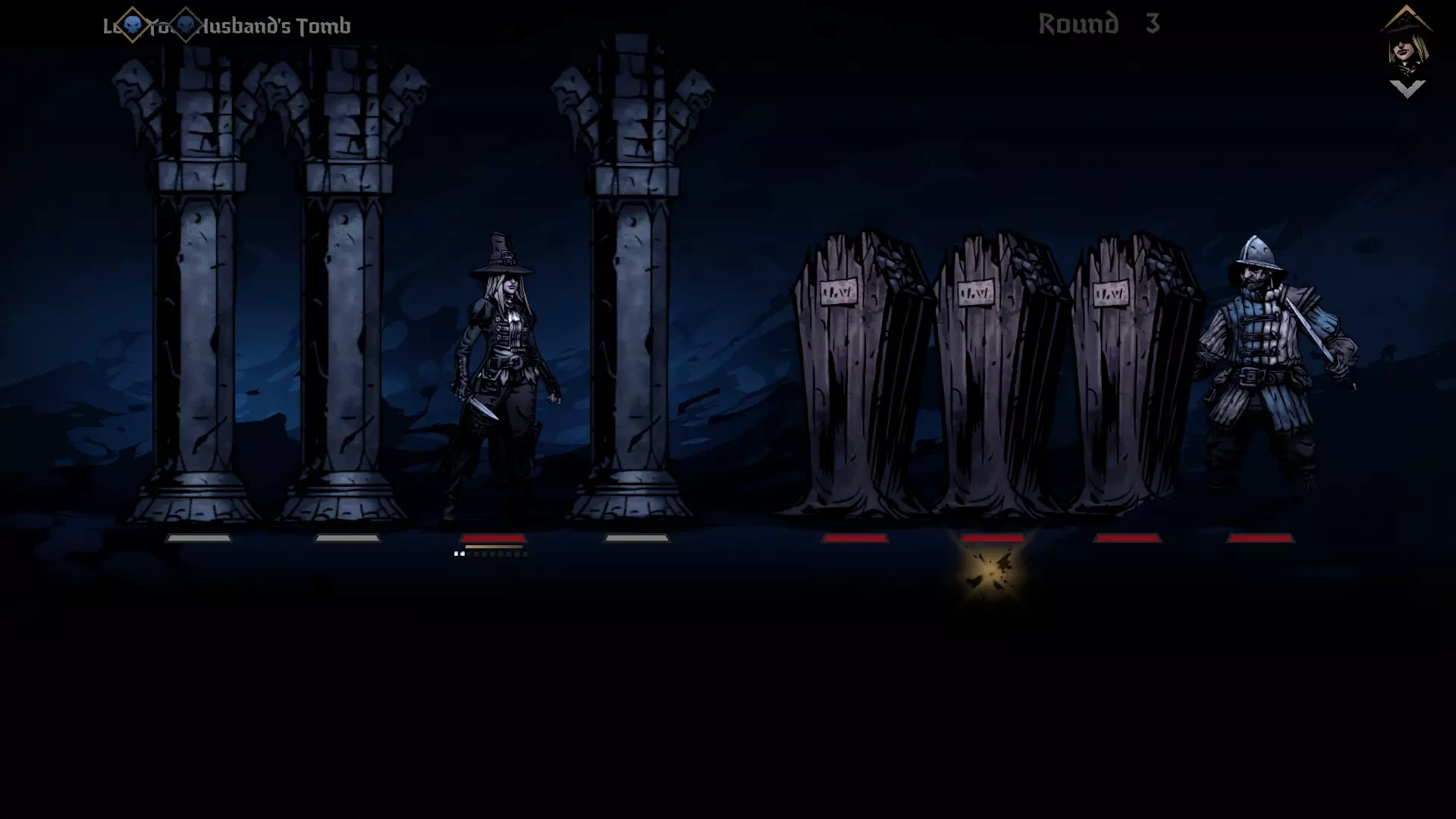 多年的奢靡生活与财务管理不善让庄园背负了巨额债务。她蒙受屈辱,面临被驱逐的境地,在空荡荡的大厅里徘徊,醉醺醺地对着已故之人的画像肆意辱骂,画像中那人的手曾占有欲十足地搭在她的肩上。画中那只手上闪过的一丝金光让她想起,他的戒指下落不明……想必是随他一同下葬了。 第四章:腰缠万贯 目标:洗劫你丈夫的坟墓。 这是另一个需要潜行的挑战,我们要避开守卫。你的任务是找到正确的棺材并打开它。守卫会在他的回合标记两行区域,你需要离开这些区域,否则会被扔到最远的一排,并受到大量压力伤害。