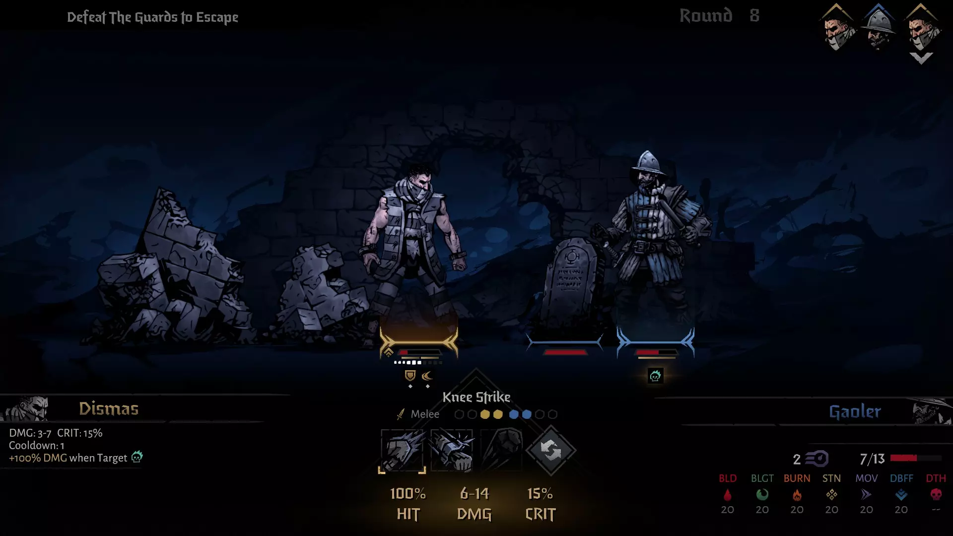拳击不仅能将角色移至前排,还会给守卫施加一个标记代币。然后使用膝踢,若目标带有标记代币,该技能将造成100%额外伤害。这样你就能用两个行动解决掉守卫,然后去处理其他敌人了。